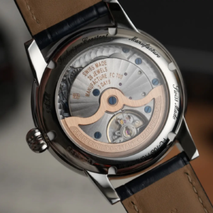Grazie alla finestra in vetro zaffiro al centro è possibile ammirare il calibro in house. Si tratta del movimento FC-716 sviluppato internamente da parte del marchio svizzero, con frequenza a 28.800a/h e ben 72 ore di riserva di carica. È possibile la ricarica manuale ed è presente il fermo macchina. Con la corona al primo scatto, ruotando in un senso si impostano le fasi lunari e nell’altro senso si cambia la data. Così come in tutti gli altri casi in cui Frederique Constant utilizza i suoi calibri in house, anche su questi Moonphase il livello delle decorazioni è davvero buono e sono delle meccaniche affidabili e gradevoli da vedere se si considera la fascia di prezzo.