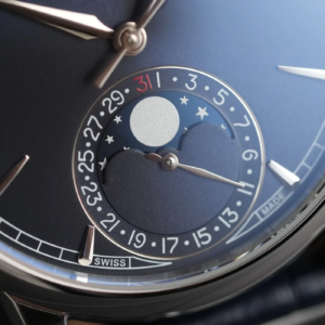 Il marchio è l’unica scritta stampata sul quadrante, che quindi rimane molto pulito e ordinato. Gran parte dello spazio è occupato dal sottoquadrante a ore 6 che raggruppa sia la funzione del datario che l’indicazione delle fasi lunari. Di solito con i datari di questo tipo il corpo scelto per i giorni del mese tende ad essere un po’ piccolo e quindi poco visibile, ma qui non ho riscontrato questo problema. Spiccano il numero 31 evidenziato in rosso e il disco delle fasi lunari, che con la sua colorazione blu scura risalta maggiormente nella referenza argentata.