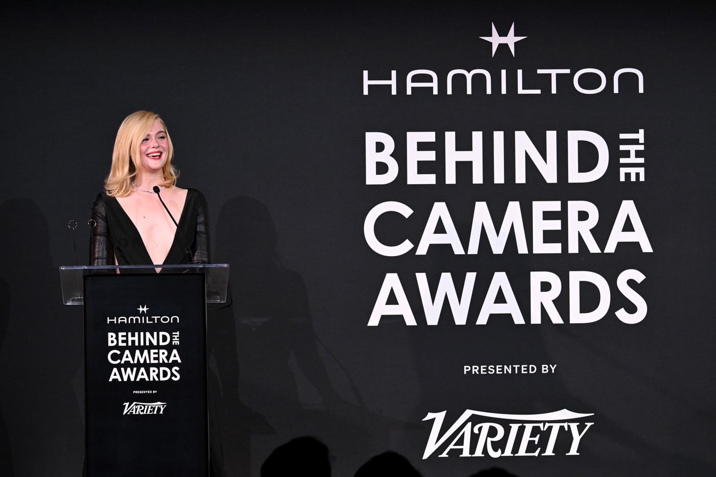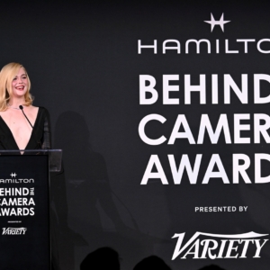 Elle Fanning presents the Hamilton Behind the Camera Award for costume design for “A Complete Unknown” at the Hamilton Behind the Camera Awards presented by Variety held at the Hollywood Athletic Club on November 14, 2024 in Los Angeles, California.