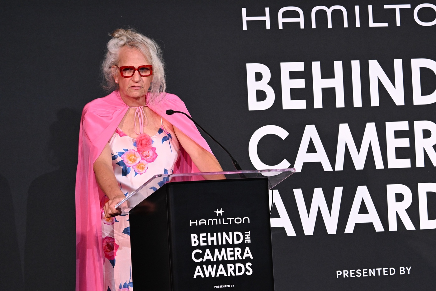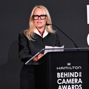 Pamela Anderson presents the Hamilton Behind the Camera Award for directing for “The Last Showgirl” at the Hamilton Behind the Camera Awards presented by Variety held at the Hollywood Athletic Club on November 14, 2024 in Los Angeles, California.