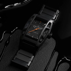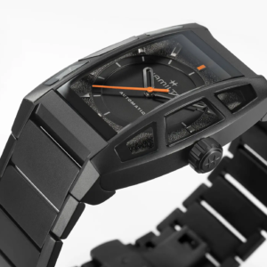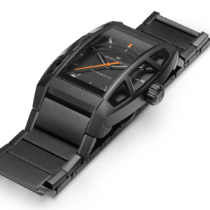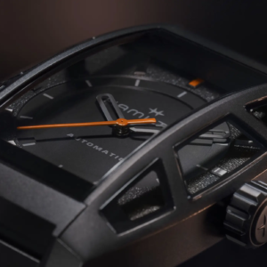 Lo stile è stato completamente modificato rispetto al Boulton indossato da Harrison Ford sul set di “Indiana Jones e il quadrante del destino”, tanto che l’unico elemento rimasto riconoscibile è la forma rettangolare della cassa con fianchi leggermente arcuati. Il titanio sabbiato con rivestimento PVD nero ben si sposano con le atmosfere futuriste del videogame, proprio come l’intelaiatura che caratterizza la parte frontale e circonda tanto il vetro zaffiro principale quanto i 6 piccoli vetri laterali. Vanno poi nella stessa direzione le lancette ovali scheletrate, molto ricercate e dal look moderno.