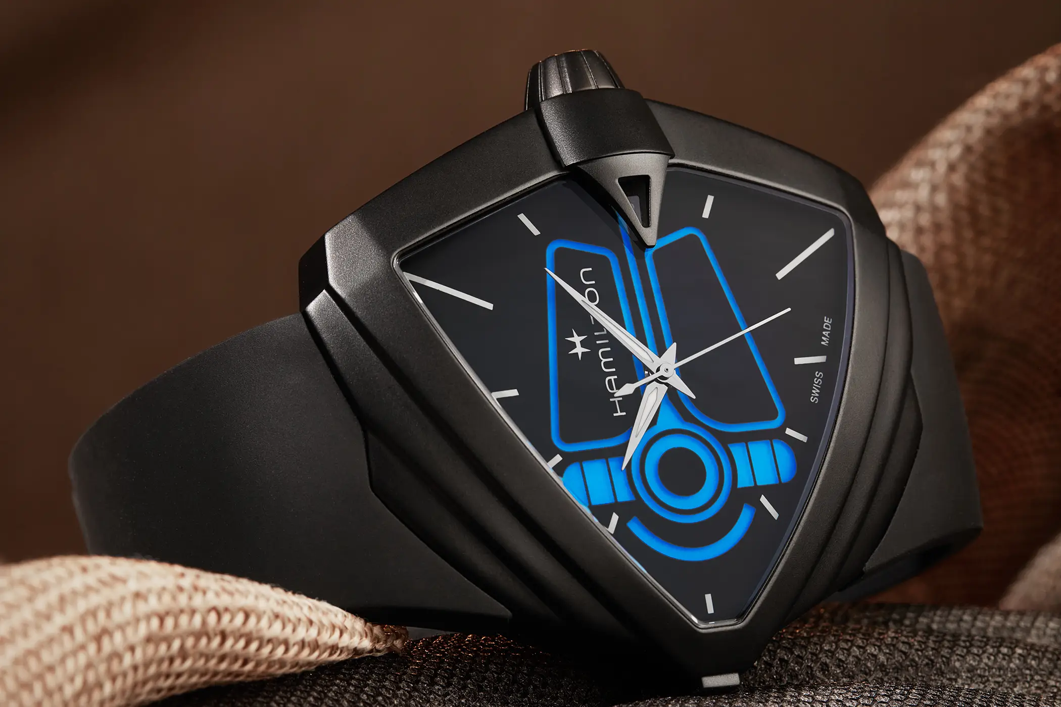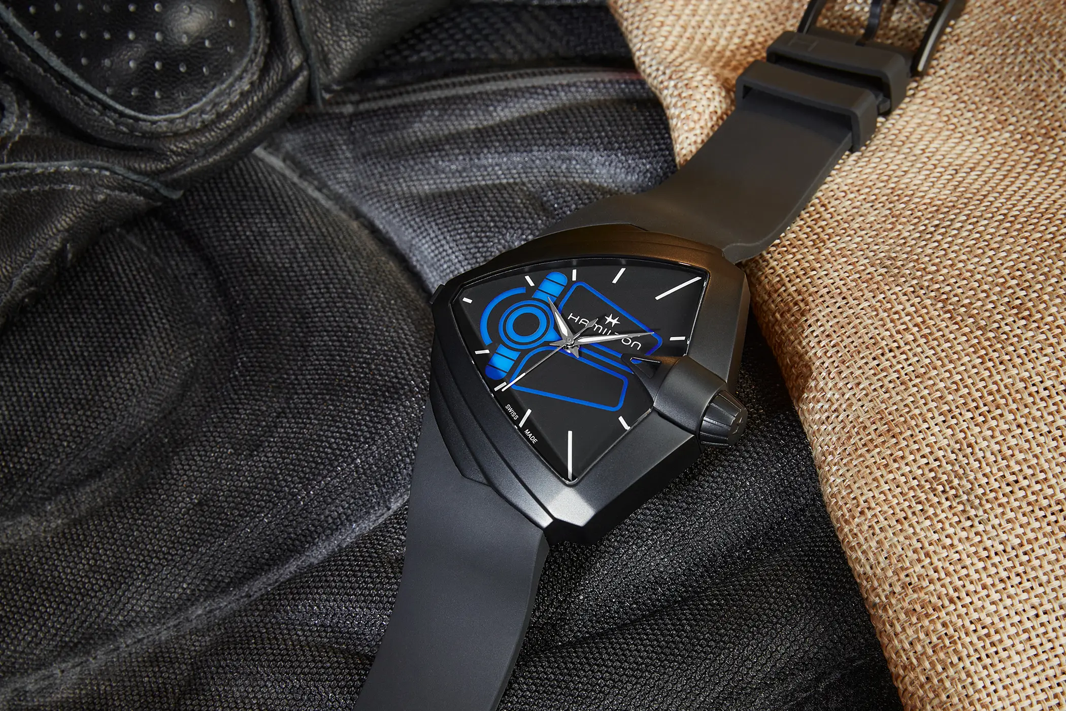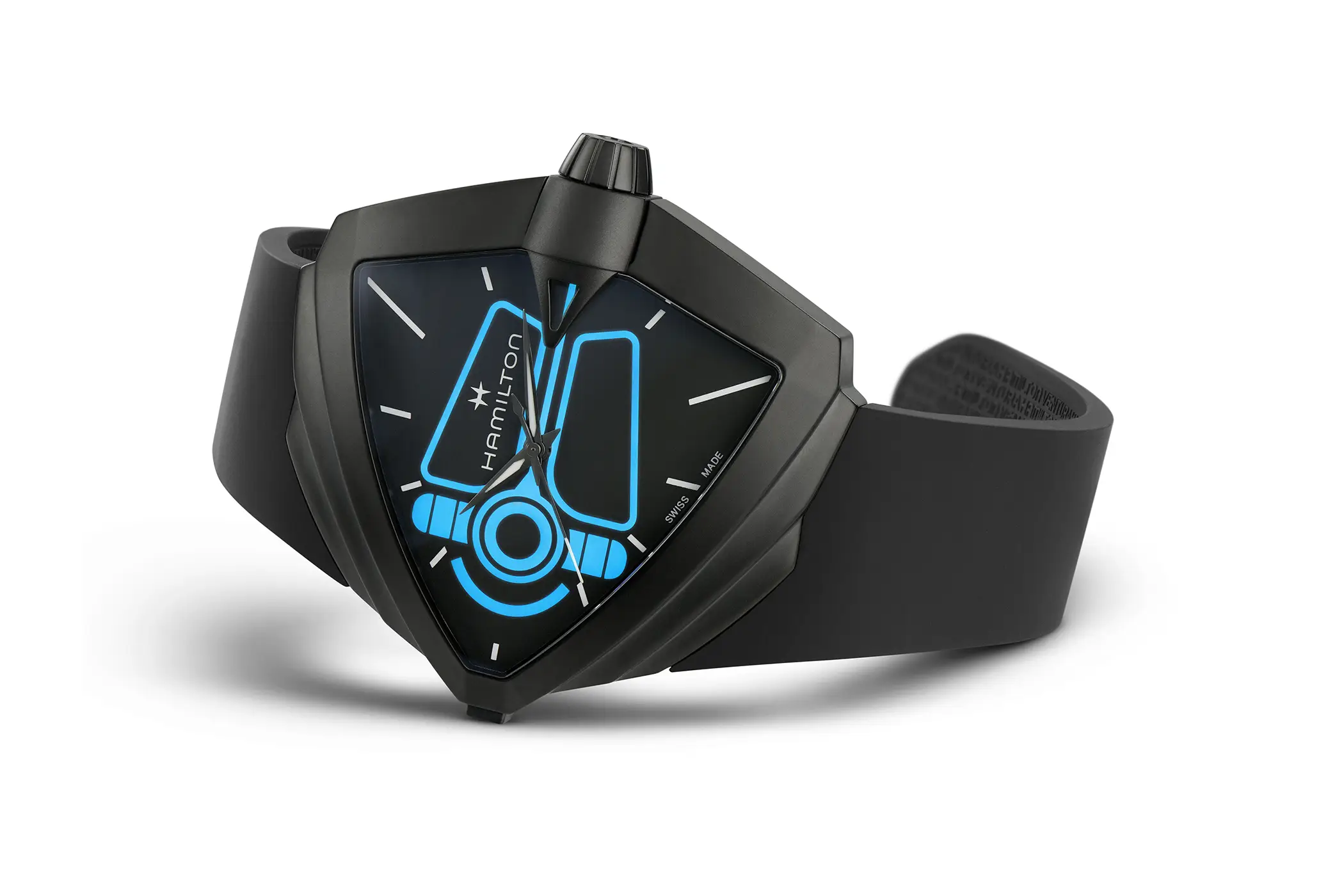 Traendo ispirazione da questo “Desert Watch”, Hamilton ha deciso di disegnare due nuovi modelli esclusivi basati sulle linee, tanto famose quanto audaci, del Ventura. Entrambi hanno sul quadrante dei dettagli nello stesso blu brillante tipico degli occhi dei Fremen, resi così dagli effetti della spezia di Arrakis. Il Ventura Bright XXL Dune Limited Edition, prodotto in 3.000 esemplari, ha una cassa da 52×46,6mm in acciaio con rivestimento PVD nero e delle normali lancette per l’indicazione dell’orario, ma sul quadrante sono riprodotte le linee dell’oggetto di scena. Ma ciò che certamente farà piacere agli appassionati di fantascienza è che premendo il tasto posizionato a ore 9 queste linee si illuminano.