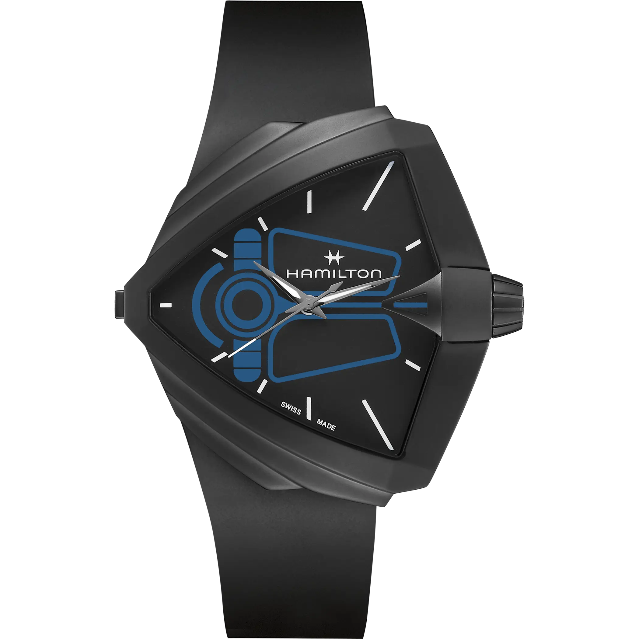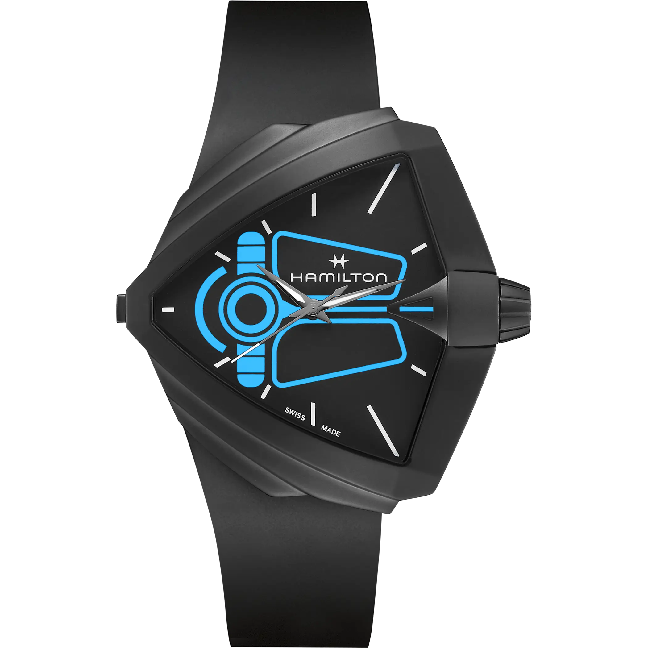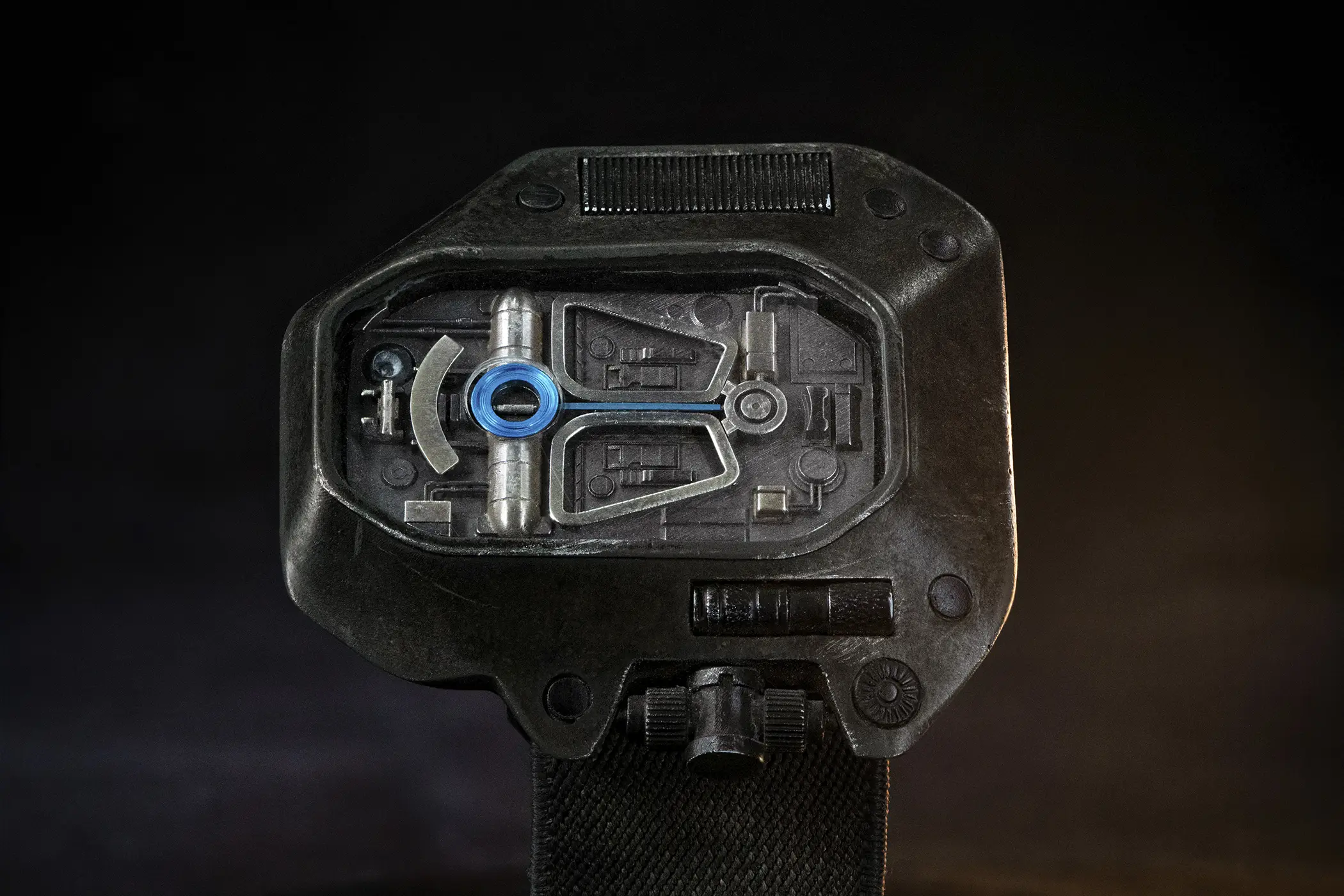 Traendo ispirazione da questo “Desert Watch”, Hamilton ha deciso di disegnare due nuovi modelli esclusivi basati sulle linee, tanto famose quanto audaci, del Ventura. Entrambi hanno sul quadrante dei dettagli nello stesso blu brillante tipico degli occhi dei Fremen, resi così dagli effetti della spezia di Arrakis. Il Ventura Bright XXL Dune Limited Edition, prodotto in 3.000 esemplari, ha una cassa da 52×46,6mm in acciaio con rivestimento PVD nero e delle normali lancette per l’indicazione dell’orario, ma sul quadrante sono riprodotte le linee dell’oggetto di scena. Ma ciò che certamente farà piacere agli appassionati di fantascienza è che premendo il tasto posizionato a ore 9 queste linee si illuminano.