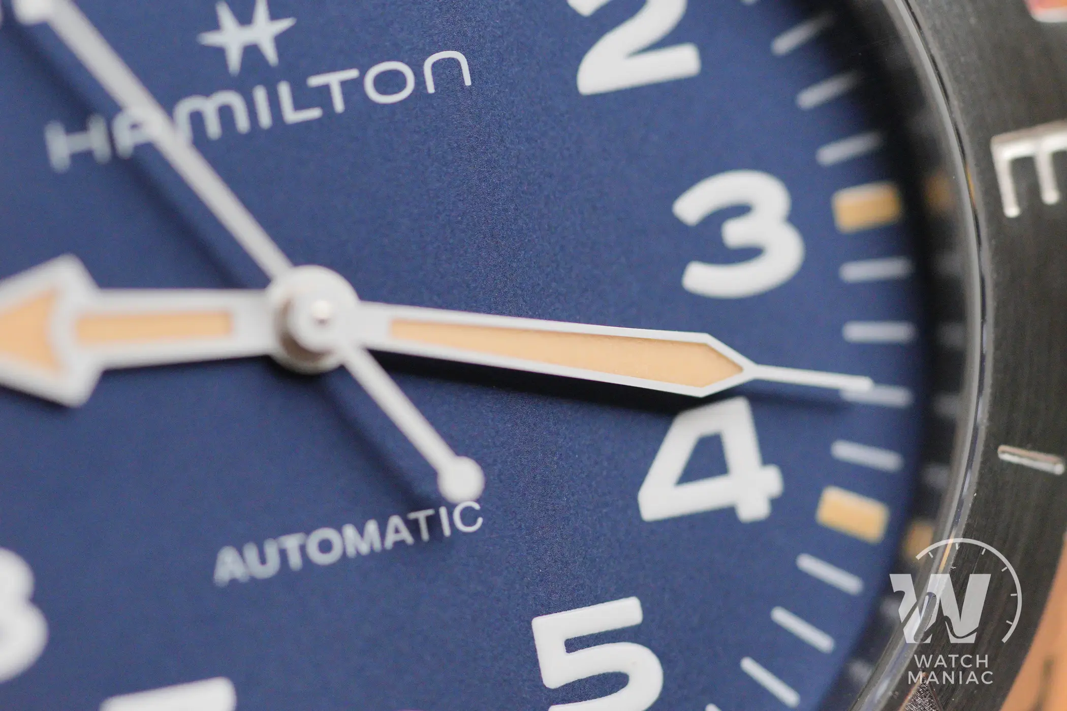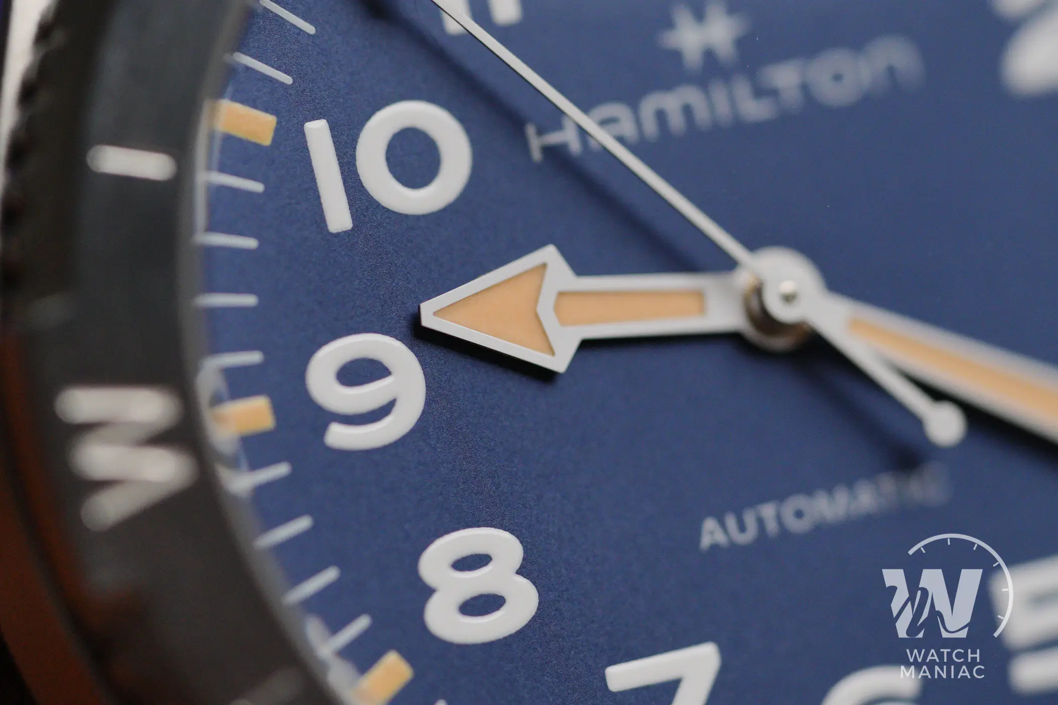 Le sfere hanno bordi bianchi che migliorano il contrasto con il blu del quadrante. Quella dei minuti ha un design piuttosto tipico per gli Hamilton Khaki Field, mentre quella delle ore è piuttosto originale e ricercata. Al loro interno c’è una buona quantità di pasta luminescente in colorazione old radium, un dettaglio che di solito non tutti amano, ma che si sposa piuttosto bene alla tipologia di questi orologi. Le proporzioni delle sfere sono ottimali, dato che si differenziano bene l’una dall’altra e quella dei minuti arriva quasi a sfiorare le tacche della minuteria. Se solitamente si apprezzano le doti di leggibilità degli altri Hamilton Khaki Field, qui direi che questo aspetto è stato ulteriormente migliorato e basta un colpo d’occhio per tenere sotto controllo l’orario.