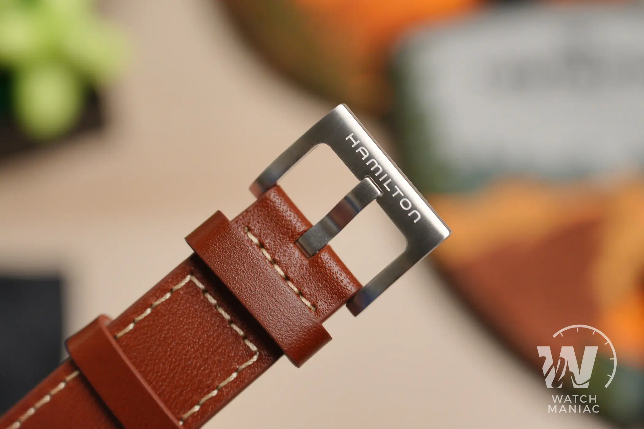 La cassa ha un design pulito e classico e fortunatamente, così come su altri modelli più recenti di Hamilton, ha delle anse piuttosto corte che sono sempre una delle migliori ricette per una perfetta vestibilità anche su polsi piccoli. La finitura è interamente satinata con un livello di qualità molto buono e che non delude neppure se osservata con la lente macro. Dalla vista laterale spicca uno spessore contenuto che nell’insieme fa risultare la cassa molto equilibrata e ben proporzionata. A ore 3 la corona a vite, con finitura micropallinata e il logo lucido in rilievo al centro, è una caratteristica apprezzatissima su un orologio pensato per l’attività all’aria aperta.