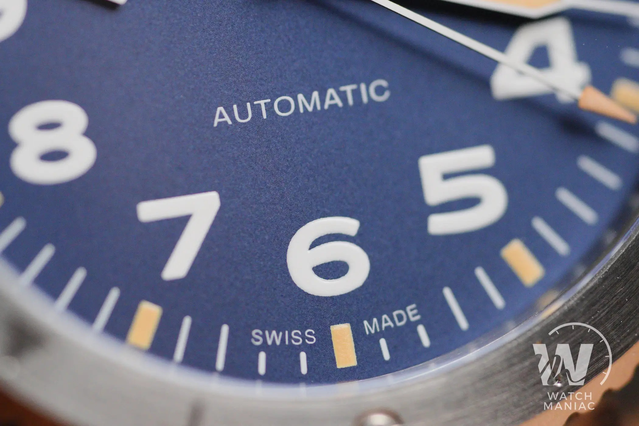Le scritte sono ridotte al minimo: marchio e logo in alto e “automatic” in basso. Non solo manca la data, che avrebbe alterato la perfetta simmetria, ma mancano anche le indicazioni delle ore postmeridiane molto frequenti sugli altri modelli della linea Khaki Field, ma che rischiano a volte riempire il quadrante con informazioni in parte superflue. Gli indici a numeri arabi, di dimensioni generose, sono stampati con vernice bianca lucida e presentano dei piccoli rettangoli di pasta luminescente in corrispondenza della minuteria sulla parte più esterna.
