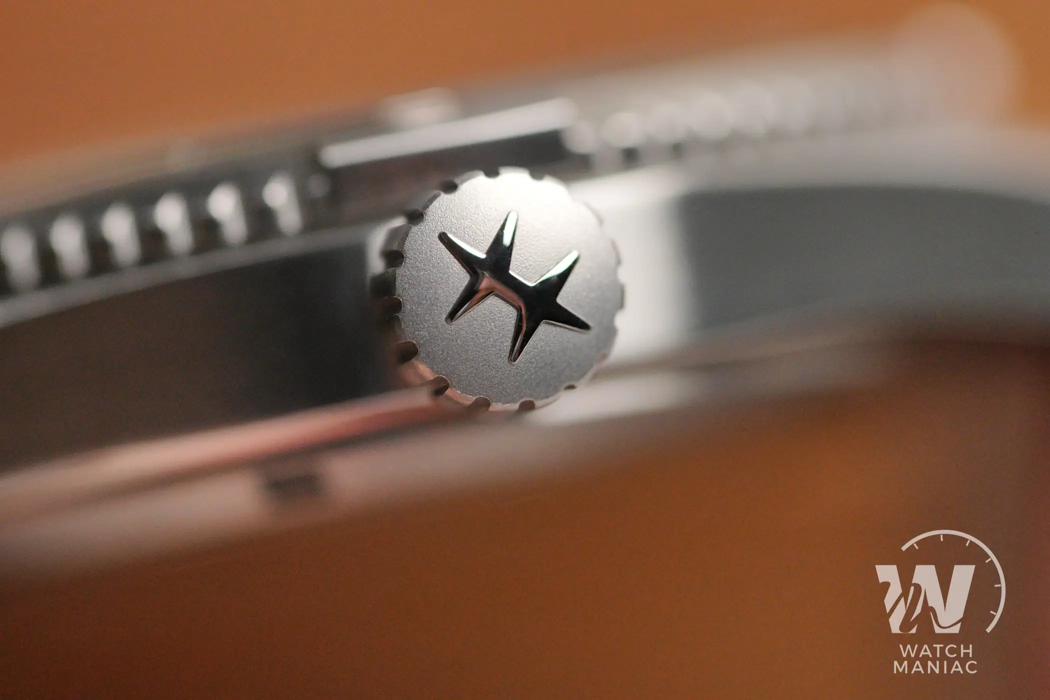 Il cinturino di serie è in pelle marrone con cuciture beige. La qualità del materiale è buona, anche se tende ad essere un po’ rigido e richiede del tempo prima di prendere bene la forma del polso. La fibbia ad ardiglione è di tipo standard, magari più banale rispetto a quelle ad H che richiedono fori doppi, ma sicuramente più pratica perché può essere utilizzata anche su cinturini di terze parti. Il bracciale in acciaio è disponibile di serie solo in abbinamento con il quadrante nero, ma potrà essere ordinato a parte come accessorio extra.