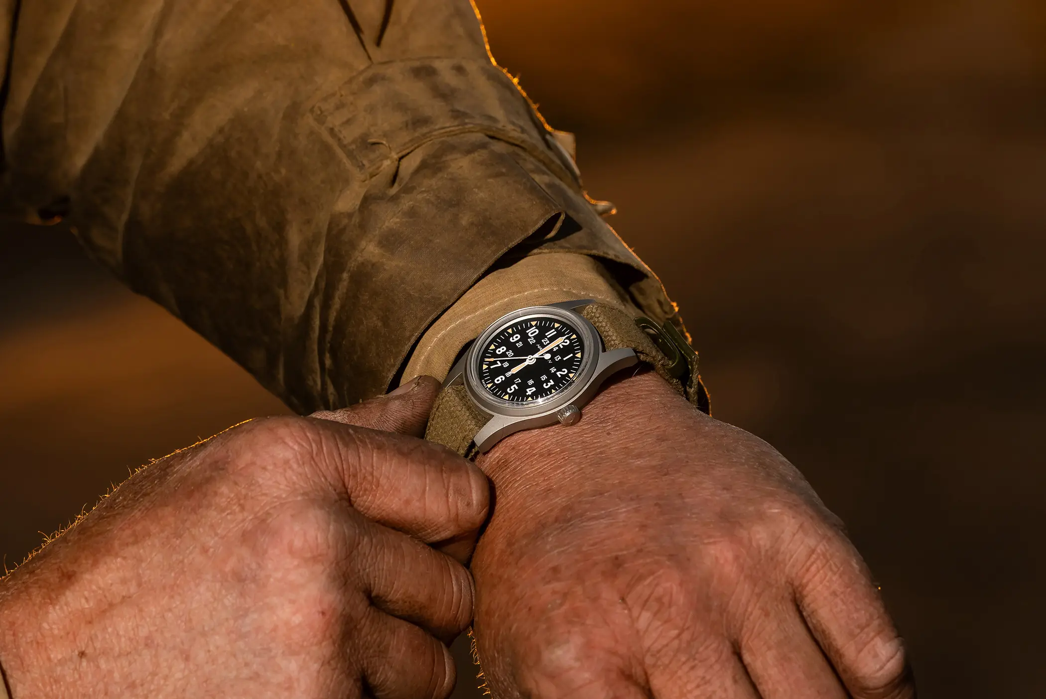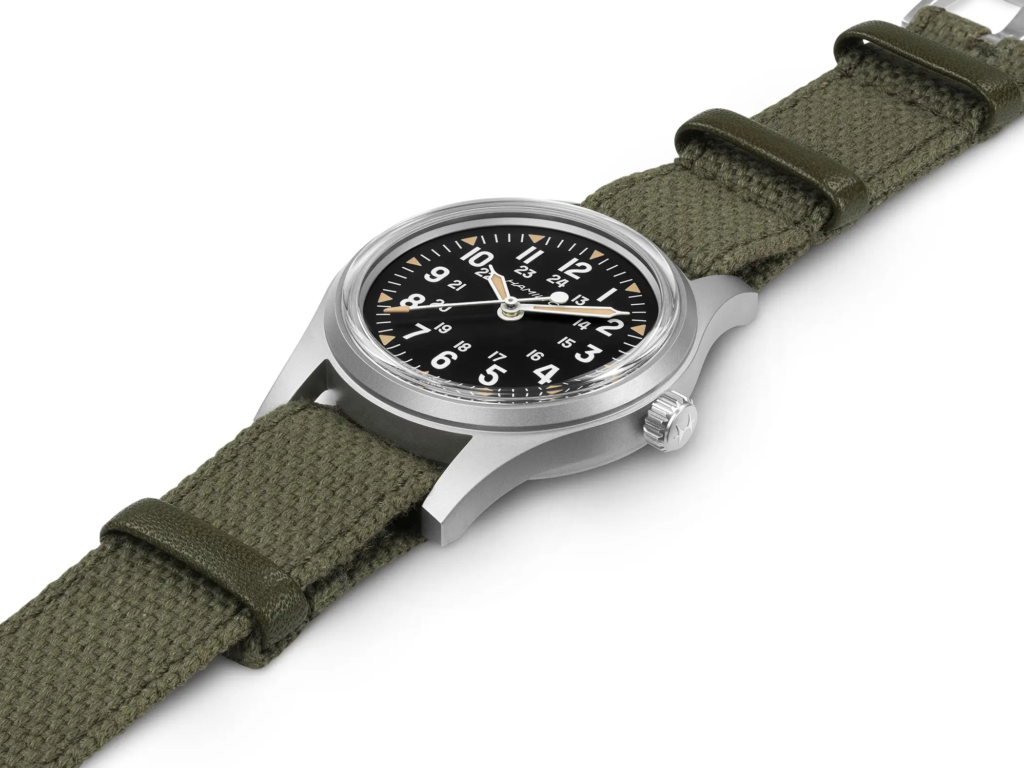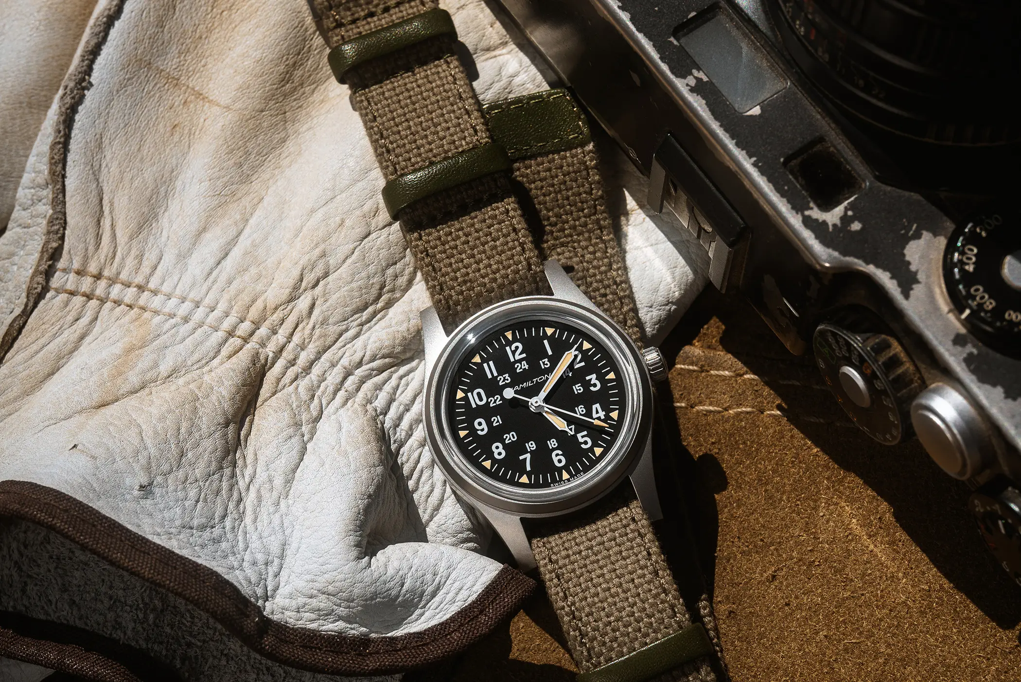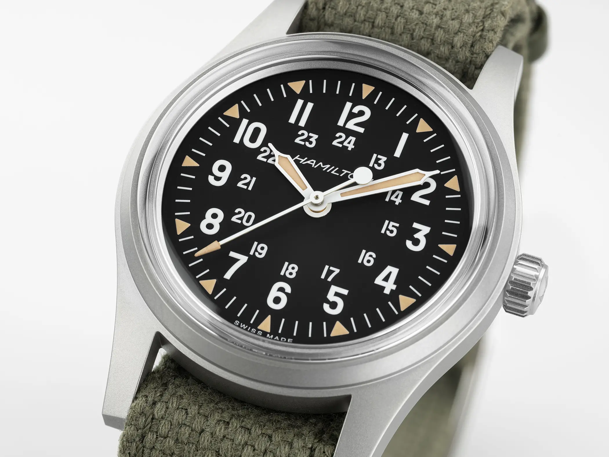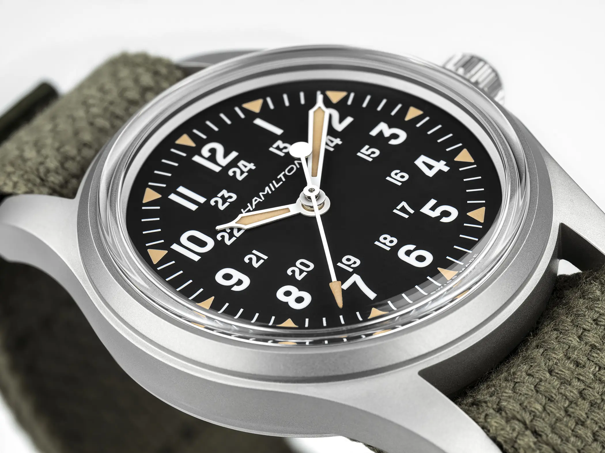 Sotto il quadrante nero troviamo però contenuti decisamente moderni. Il movimento meccanico H-50 a carica manuale offre ben 80 ore di riserva di carica ed è dotato di spirale in Nivachron, mentre la Super-Luminova Grade X2 garantisce una leggibilità ottimale con un look caldo, volutamente vintage. Migliora anche la resistenza complessiva, con impermeabilità portata a 10 bar, che rende questo Khaki Field decisamente più versatile nell’uso quotidiano.