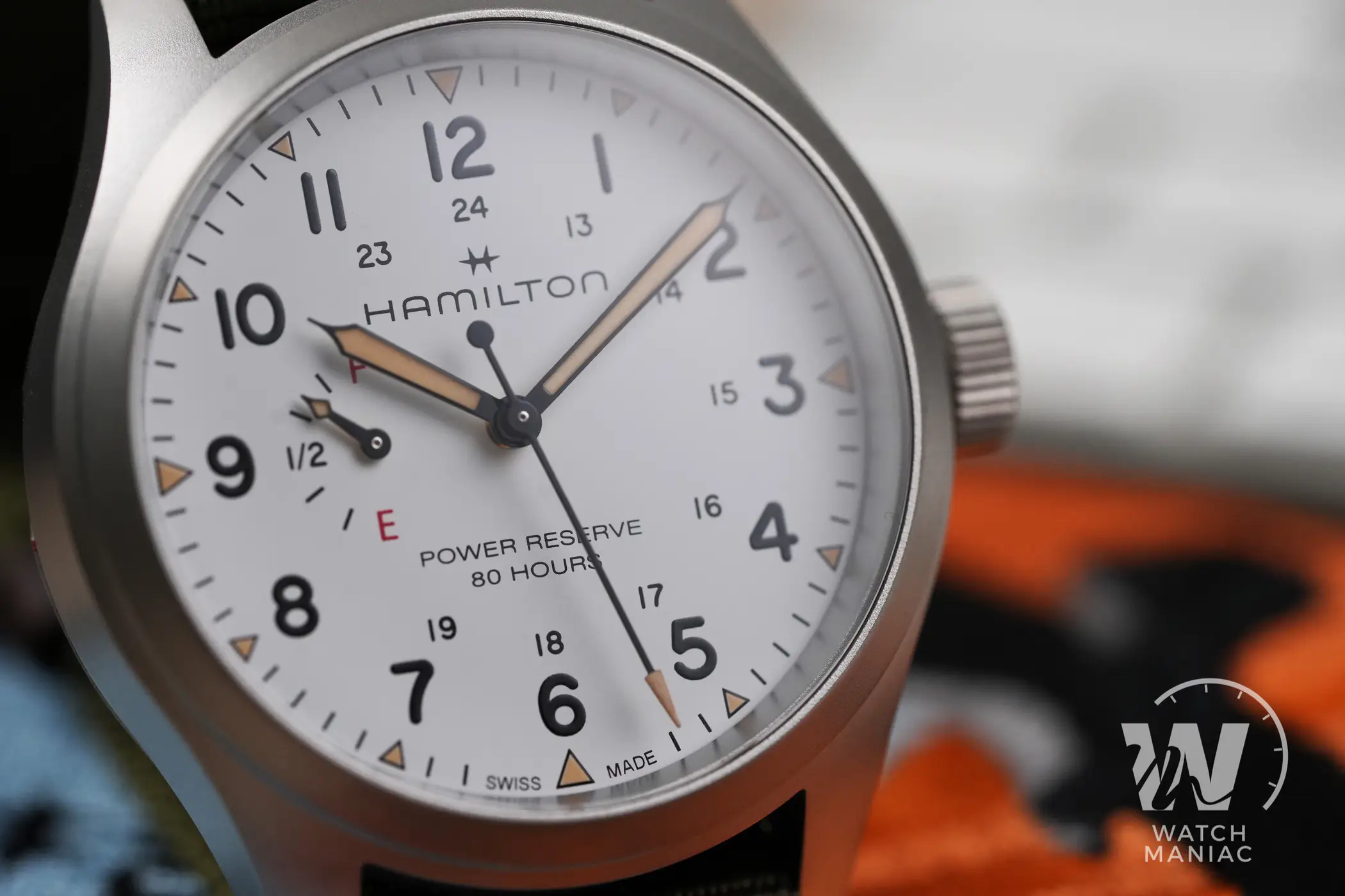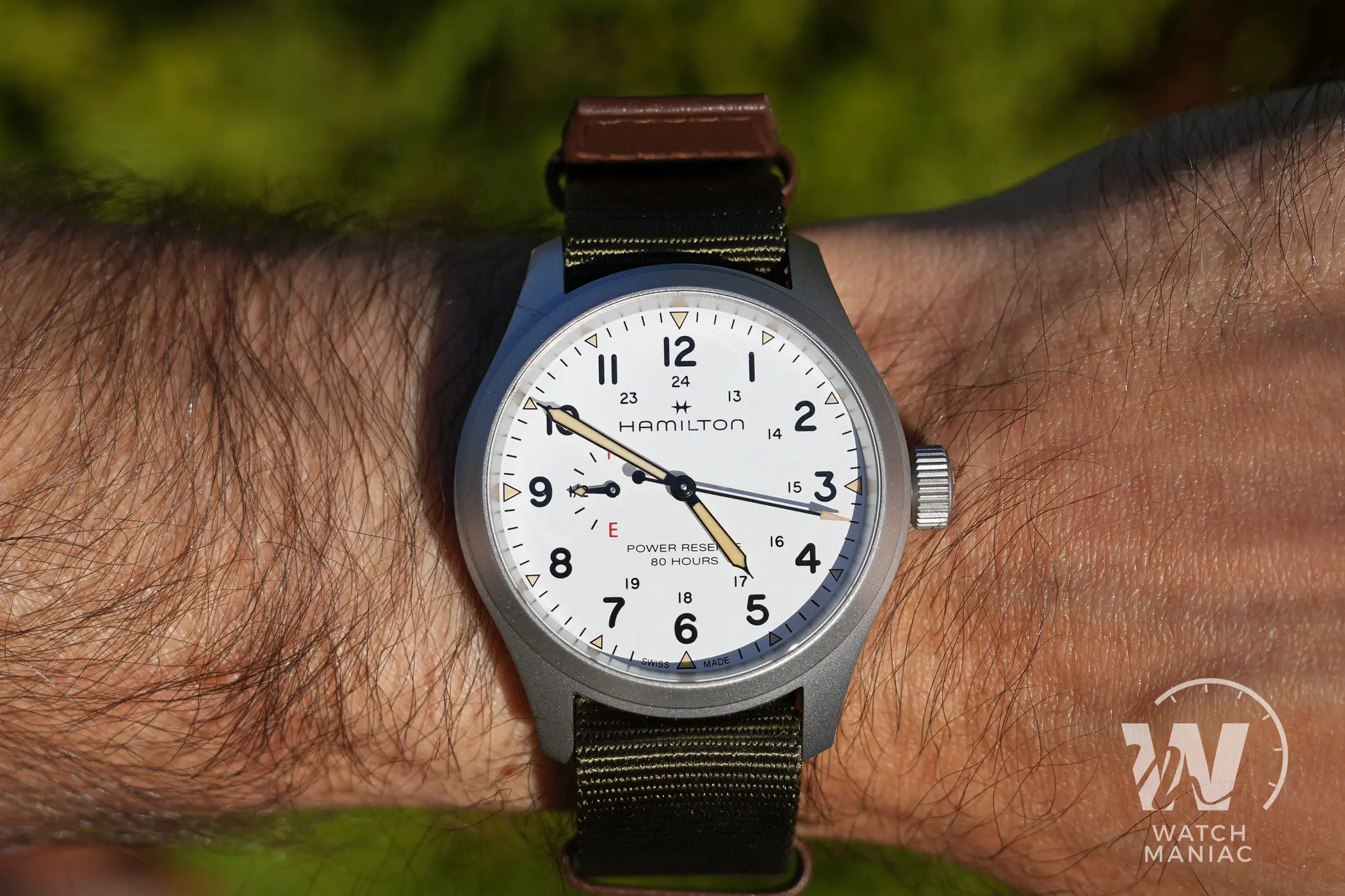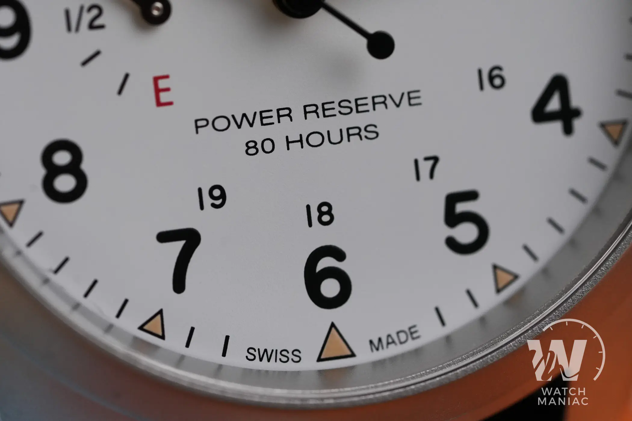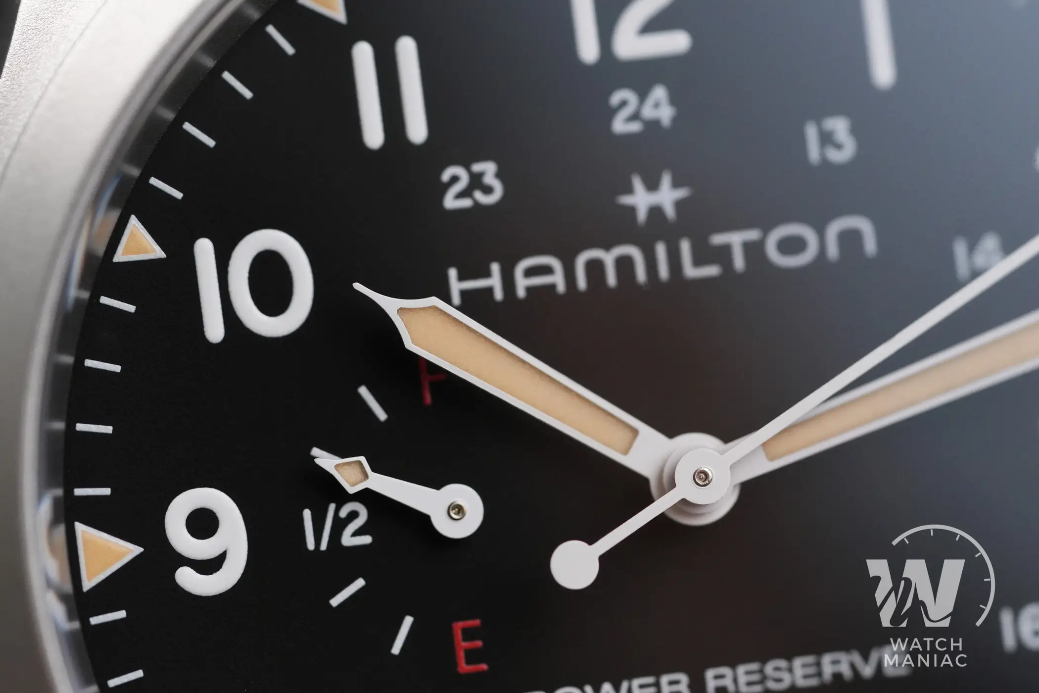 Naturalmente il protagonista principale del quadrante è l’indicatore della riserva di carica. La più grande difficoltà da affrontare quando si sceglie di aggiungere quest’utile funzione è riuscire ad integrarla nel migliore dei modi all’interno del design dell’orologio. Da questo punto di vista Hamilton ha fatto un lavoro eccellente. L’indicatore, posizionato a ore 9, non è eccessivamente grande da interferire nella lettura dell’orario, ma con la sua grafica semplice e chiara fornisce in un colpo d’occhio l’indicazione sull’autonomia residua. I designer hanno deciso di utilizzare le lettere E (empty) e F (full), un po’ come per il serbatoio di un auto e in ogni momento è facile rendersi conto di quando il nostro Khaki Field ha bisogno di essere caricato. La piccola lancetta ha poi anche una piccola porzione di pasta luminescente che si abbina a quella degli indici e delle sfere principali. Queste hanno il design tipico per gli Hamilton Khaki Field e sono verniciate in nero o in bianco, a seconda della versione scelta, per migliorare al massimo il contrasto e facilitare la lettura.
