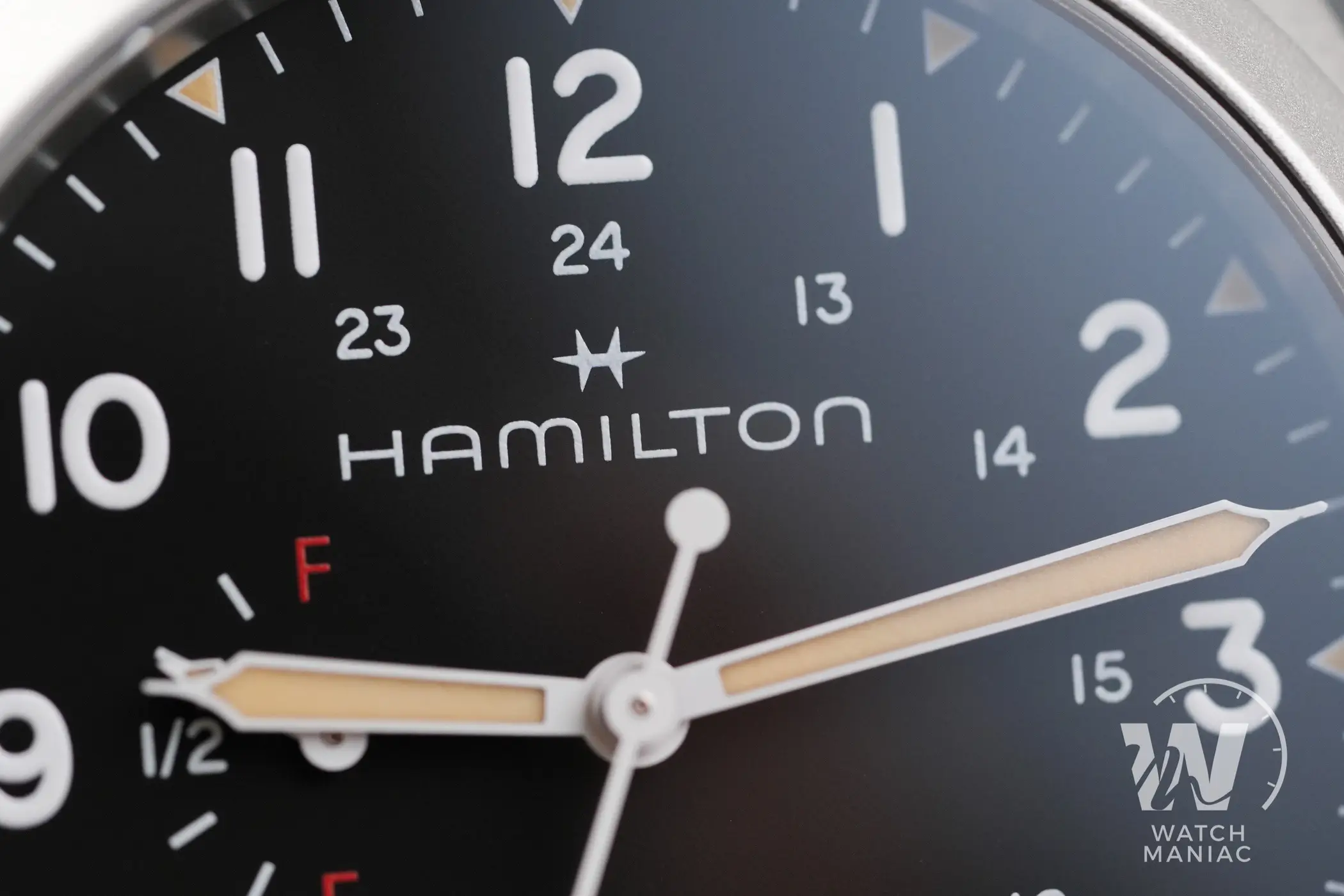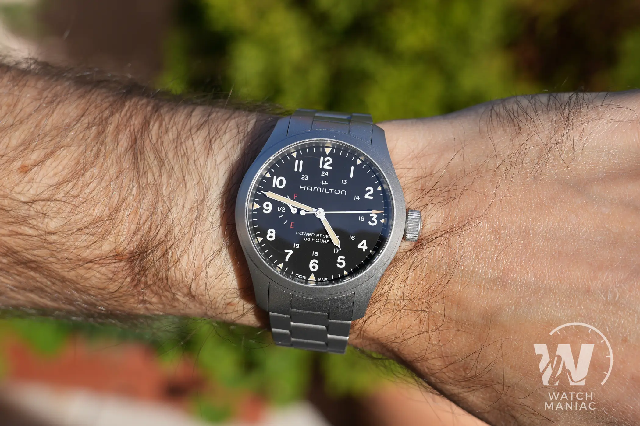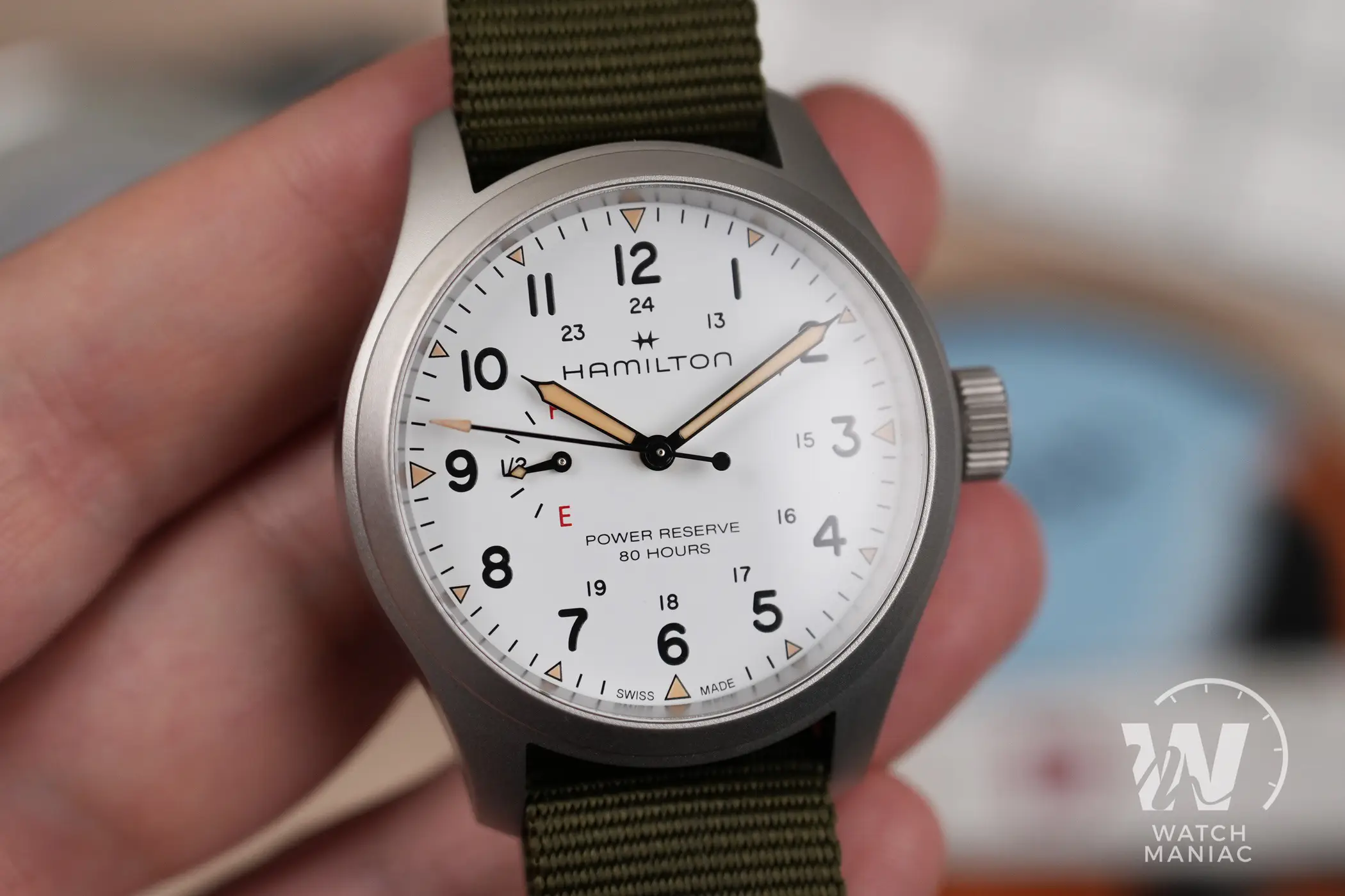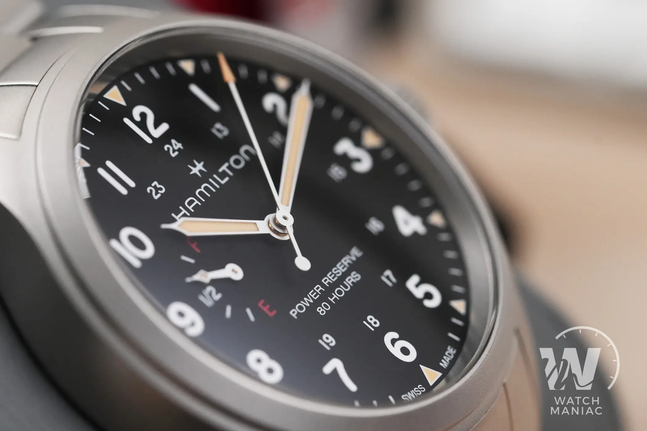 Naturalmente il protagonista principale del quadrante è l’indicatore della riserva di carica. La più grande difficoltà da affrontare quando si sceglie di aggiungere quest’utile funzione è riuscire ad integrarla nel migliore dei modi all’interno del design dell’orologio. Da questo punto di vista Hamilton ha fatto un lavoro eccellente. L’indicatore, posizionato a ore 9, non è eccessivamente grande da interferire nella lettura dell’orario, ma con la sua grafica semplice e chiara fornisce in un colpo d’occhio l’indicazione sull’autonomia residua. I designer hanno deciso di utilizzare le lettere E (empty) e F (full), un po’ come per il serbatoio di un auto e in ogni momento è facile rendersi conto di quando il nostro Khaki Field ha bisogno di essere caricato. La piccola lancetta ha poi anche una piccola porzione di pasta luminescente che si abbina a quella degli indici e delle sfere principali. Queste hanno il design tipico per gli Hamilton Khaki Field e sono verniciate in nero o in bianco, a seconda della versione scelta, per migliorare al massimo il contrasto e facilitare la lettura.