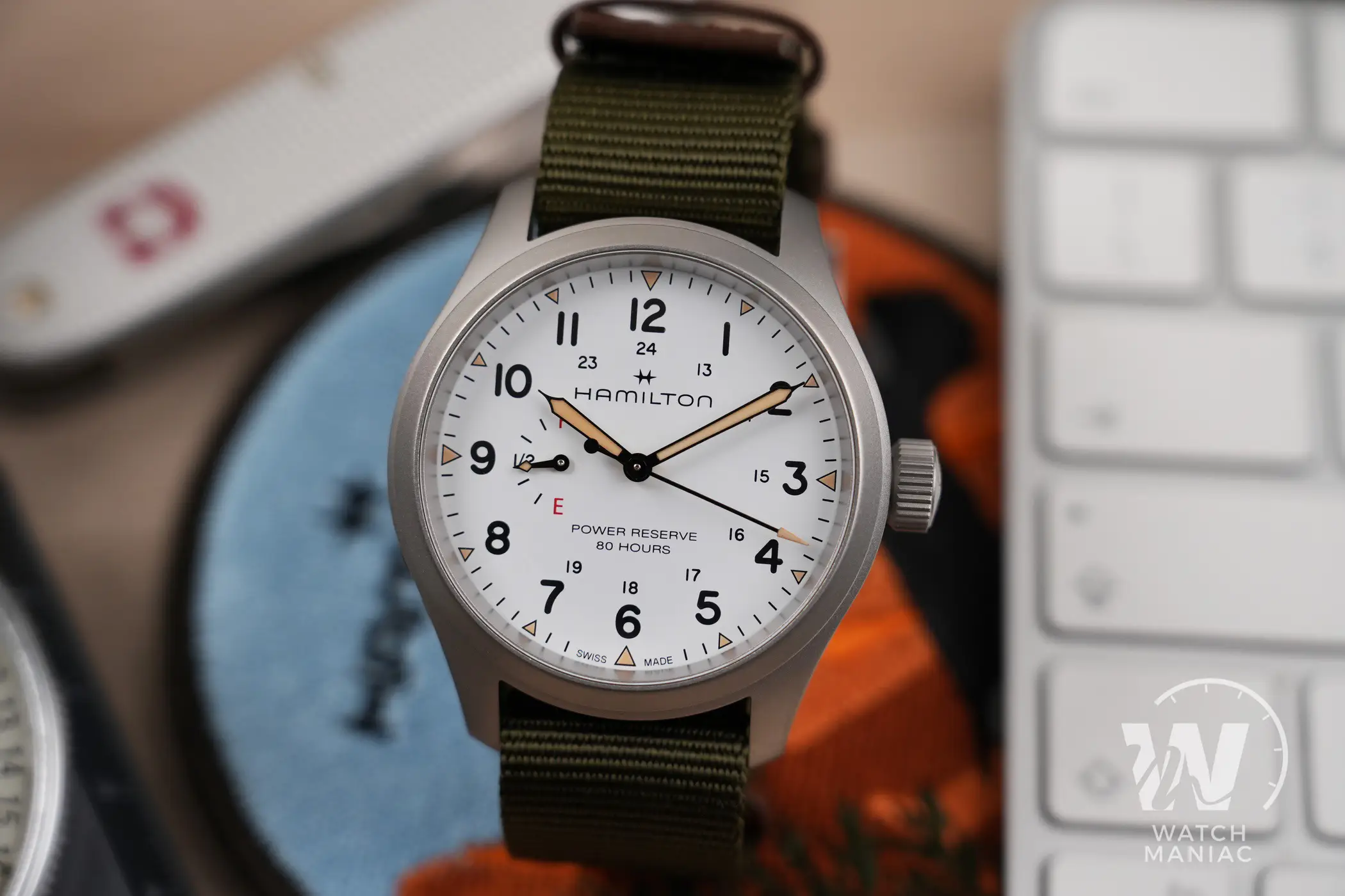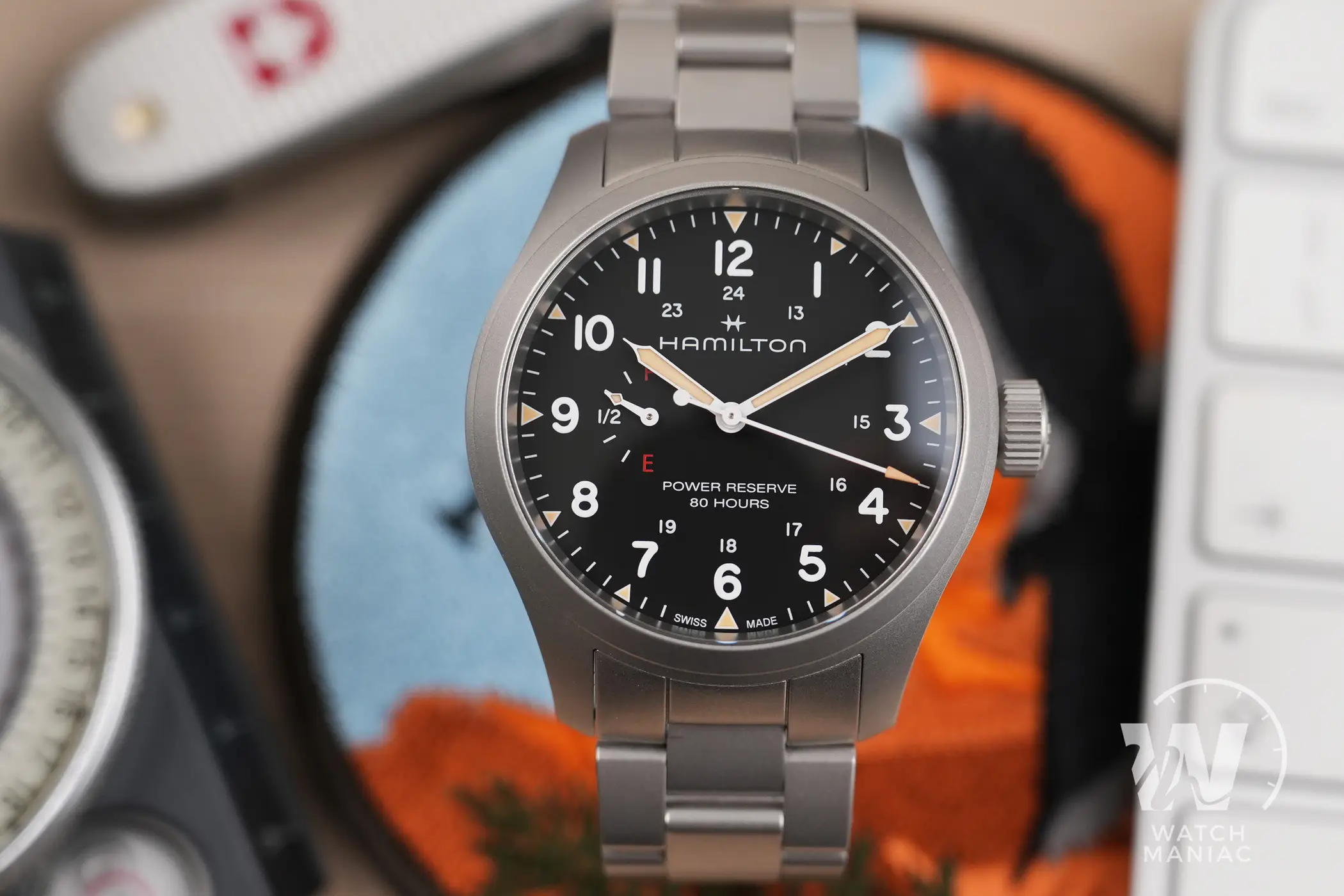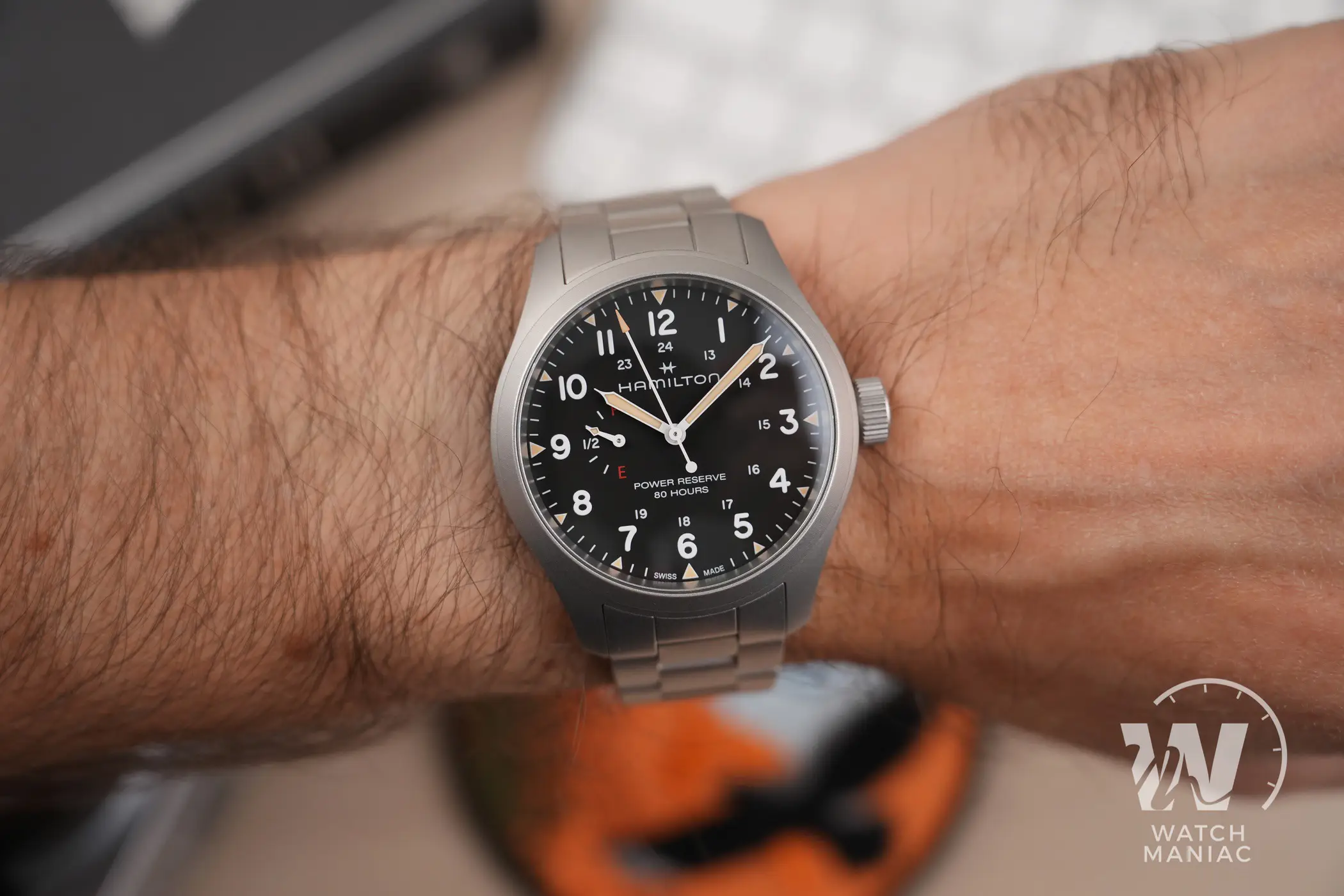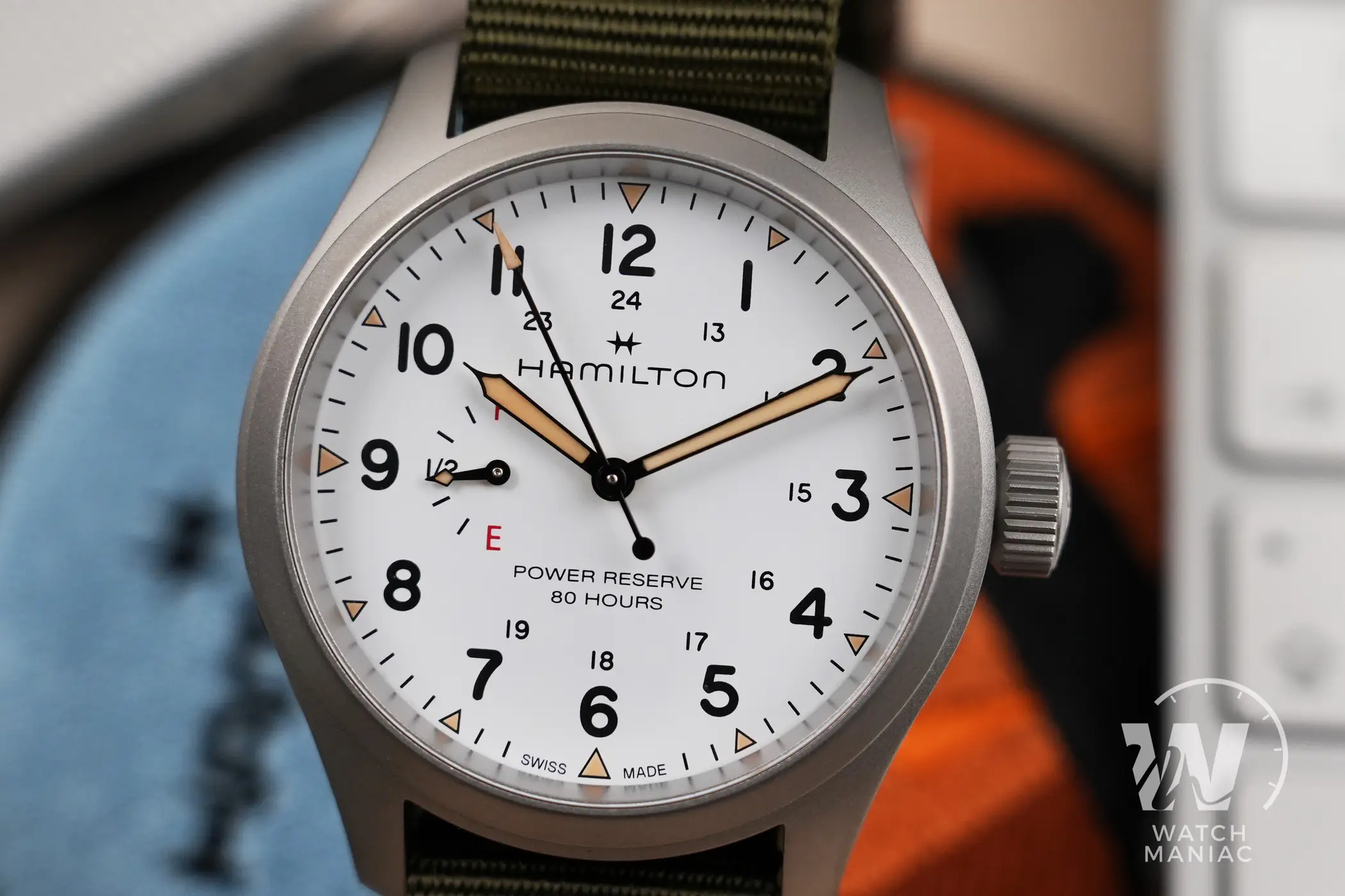 Naturalmente il protagonista principale del quadrante è l’indicatore della riserva di carica. La più grande difficoltà da affrontare quando si sceglie di aggiungere quest’utile funzione è riuscire ad integrarla nel migliore dei modi all’interno del design dell’orologio. Da questo punto di vista Hamilton ha fatto un lavoro eccellente. L’indicatore, posizionato a ore 9, non è eccessivamente grande da interferire nella lettura dell’orario, ma con la sua grafica semplice e chiara fornisce in un colpo d’occhio l’indicazione sull’autonomia residua. I designer hanno deciso di utilizzare le lettere E (empty) e F (full), un po’ come per il serbatoio di un auto e in ogni momento è facile rendersi conto di quando il nostro Khaki Field ha bisogno di essere caricato. La piccola lancetta ha poi anche una piccola porzione di pasta luminescente che si abbina a quella degli indici e delle sfere principali. Queste hanno il design tipico per gli Hamilton Khaki Field e sono verniciate in nero o in bianco, a seconda della versione scelta, per migliorare al massimo il contrasto e facilitare la lettura.