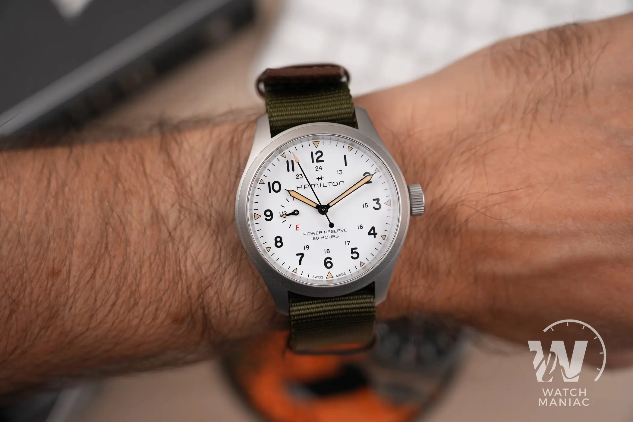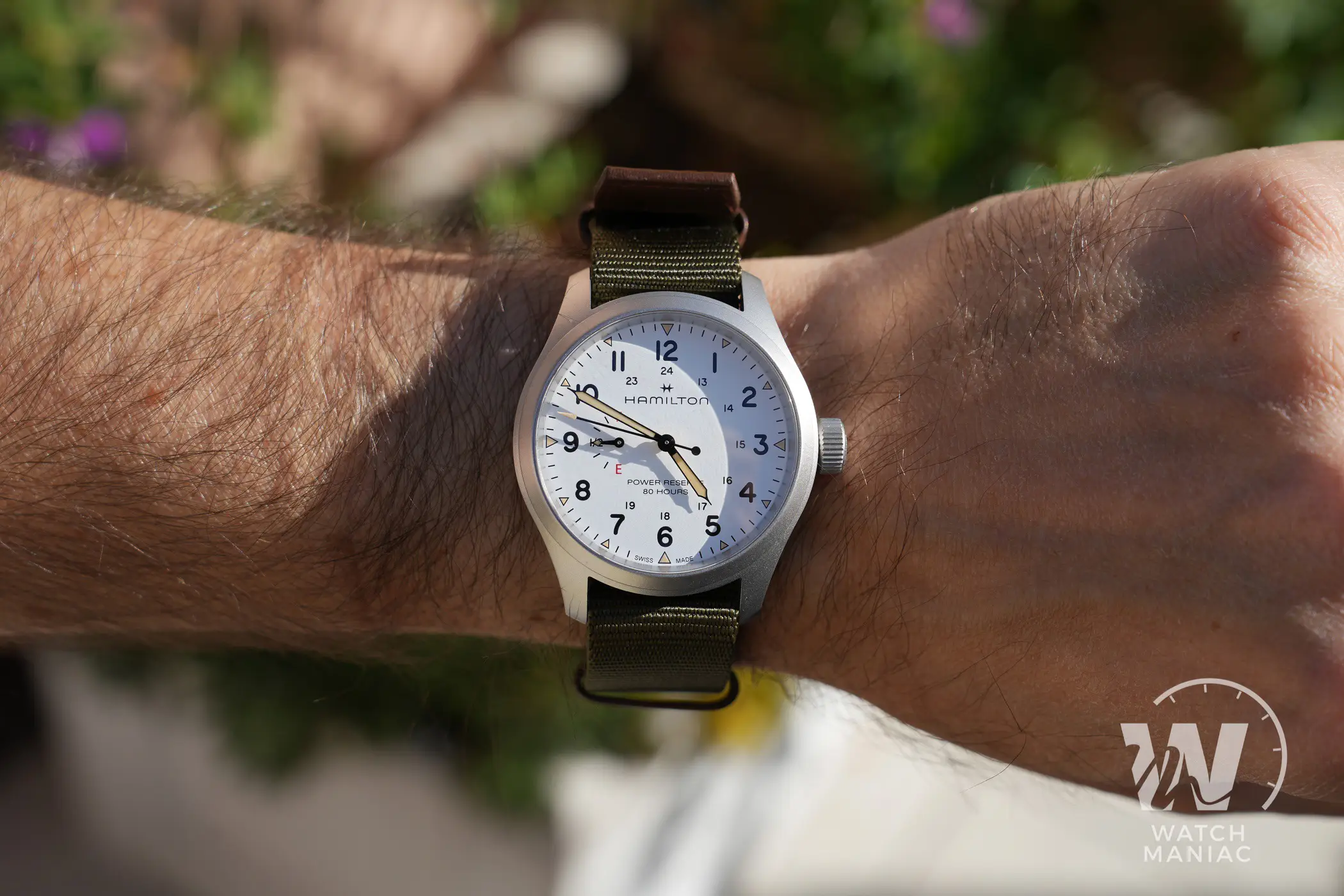 L’Hamilton Khaki Field Power Reserve può essere scelto con cinturino o con bracciale. Nel primo caso, che qui nelle immagini vedete abbinato al quadrante bianco, è un NATO in nylon con inserti e passanti in pelle. È analogo a quello utilizzato su altri modelli della linea Khaki Field, molto bello da vedere e realizzato con materiali resistenti e di buona qualità. La fibbia, micropallinata come la cassa, ha il logo di Hamilton inciso.