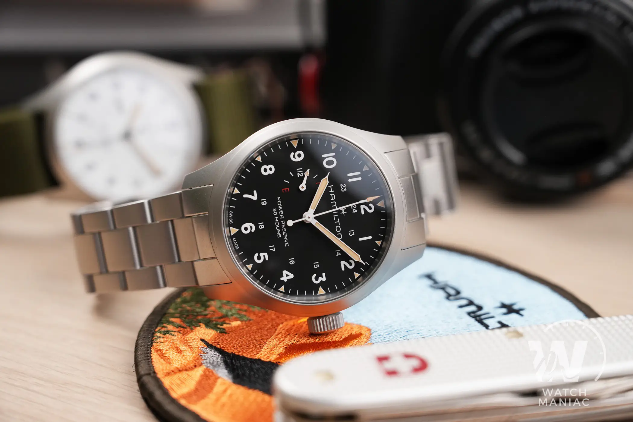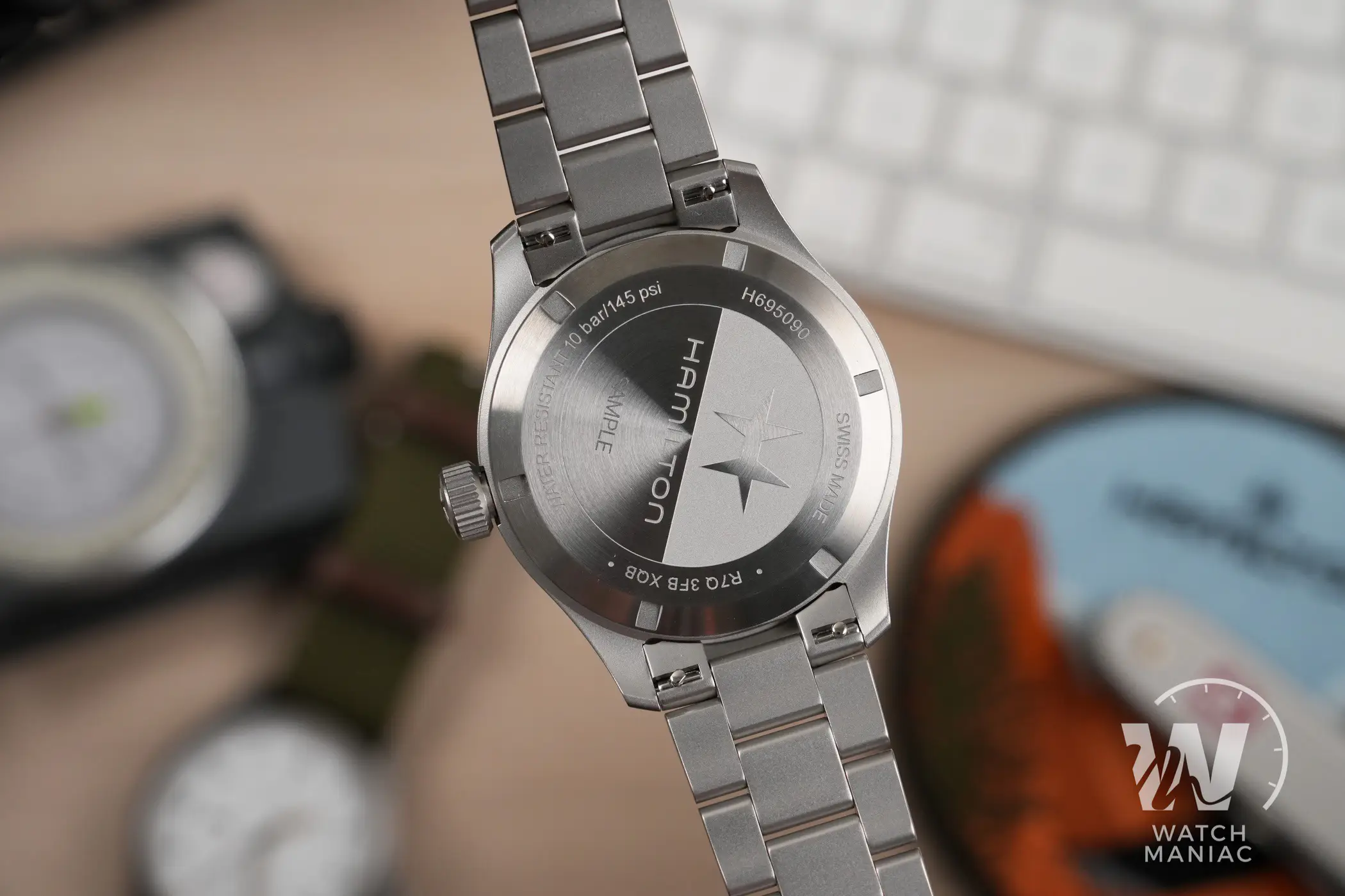 Il fondello a vite in acciaio ha una decorazione semplice ma ben realizzata, con il medaglione al centro diviso in due semicerchi che riportano il logo e il marchio di Hamilton. Tra le varie specifiche incise sulla parte più esterna c’è anche il dato sull’impermeabilità fino a 10bar, in linea con alcune ultime referenze della linea Khaki Field e un bel passo avanti rispetto ai 5bar dei Khaki Field Mechanical.
