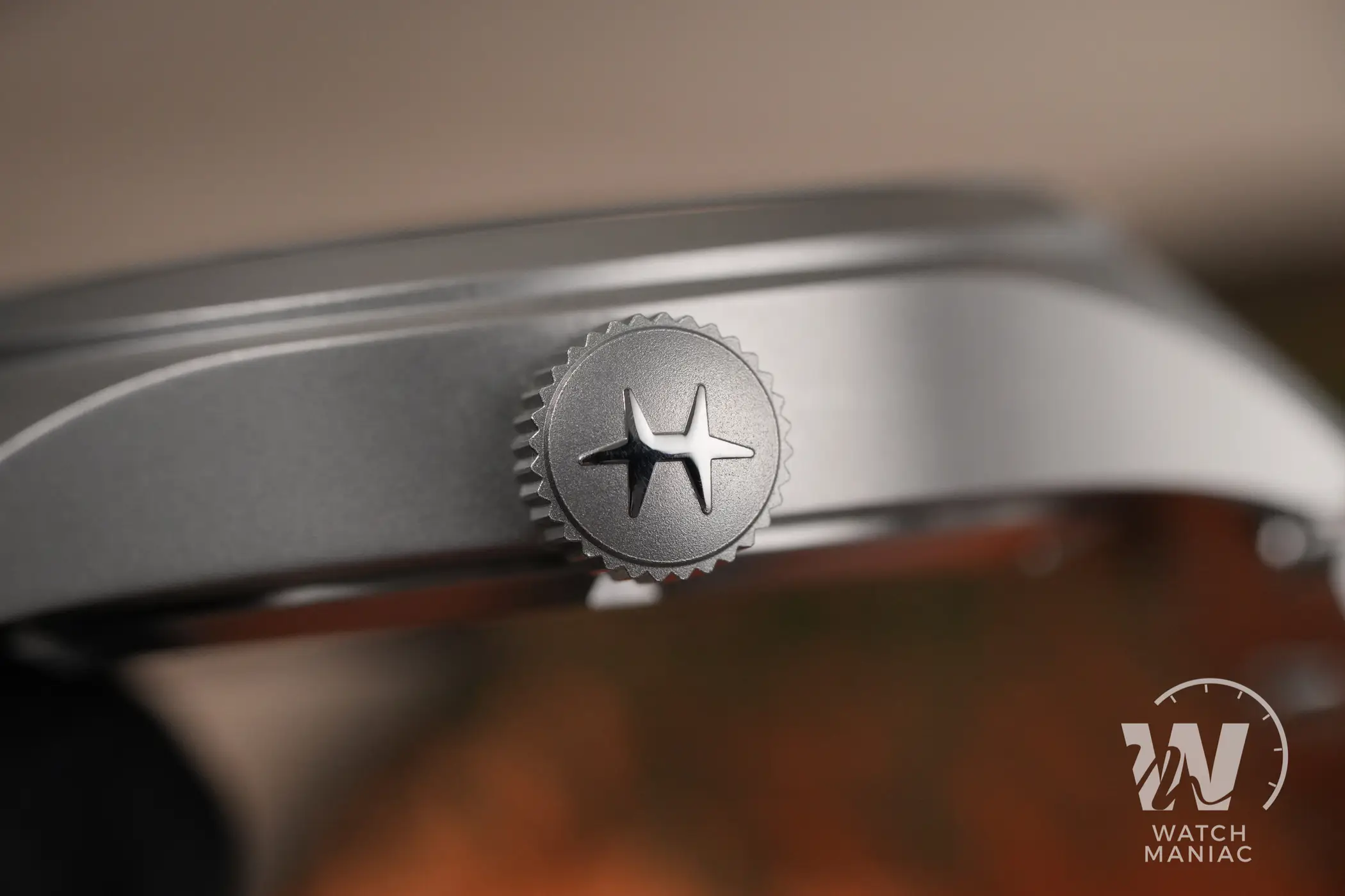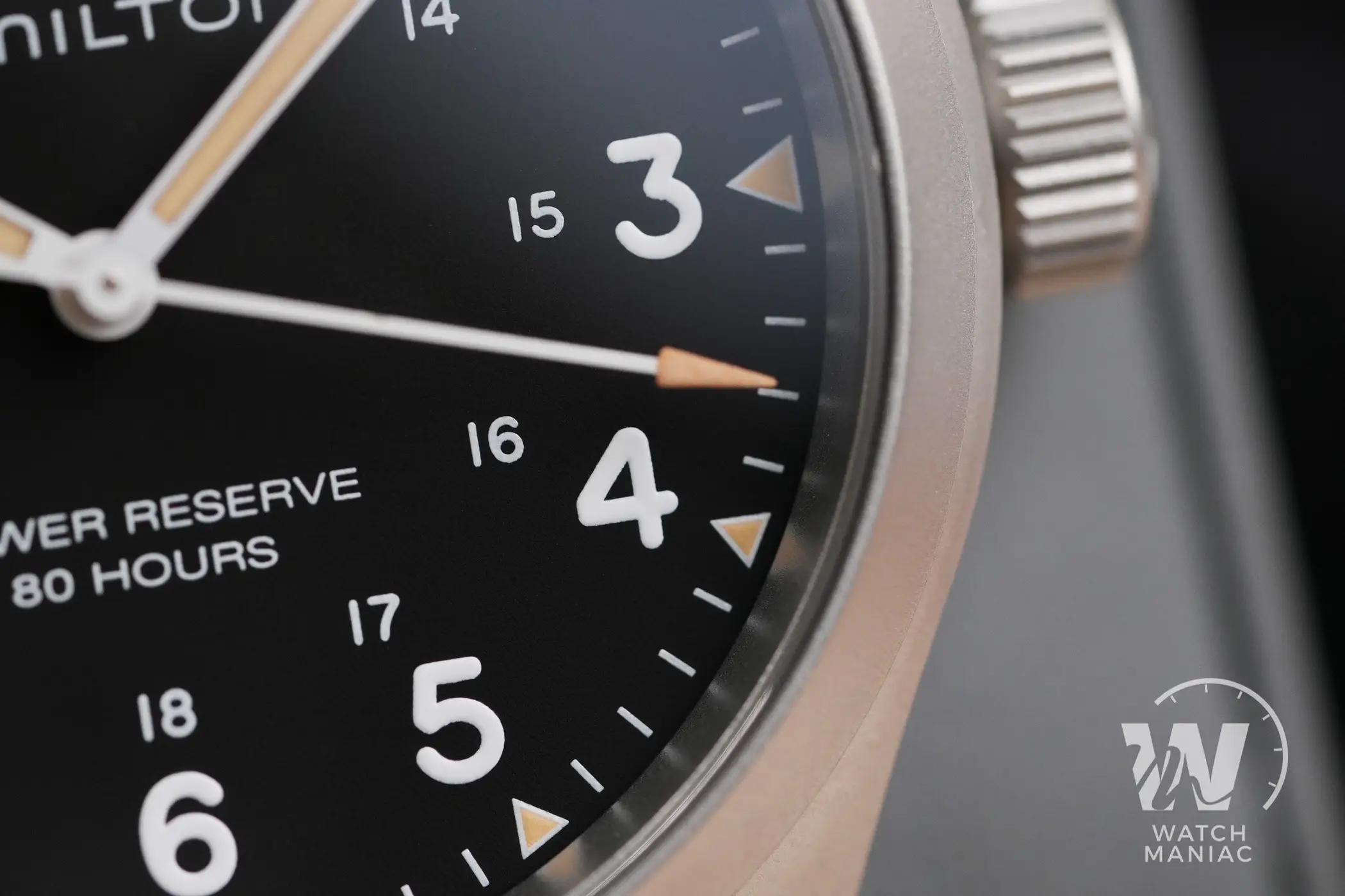 La corona a ore tre, micropallinata e con in rilievo il logo lucido di Hamilton, è ben dimensionata per essere facilmente azionata durante la ricarica manuale ma non sporge troppo dalla carrure.