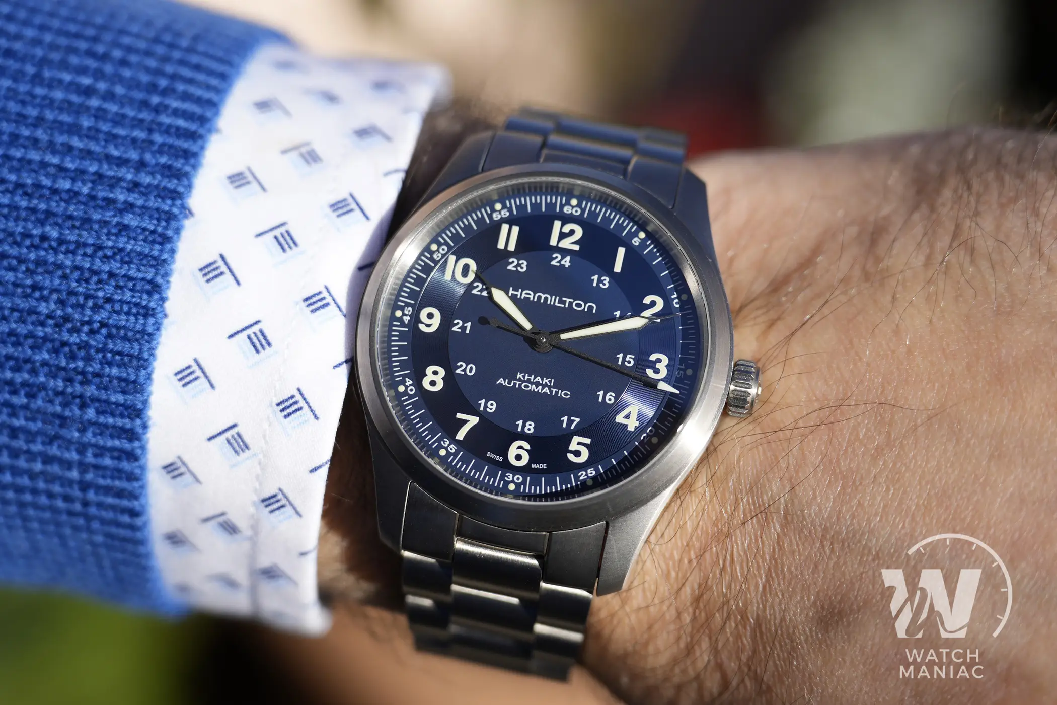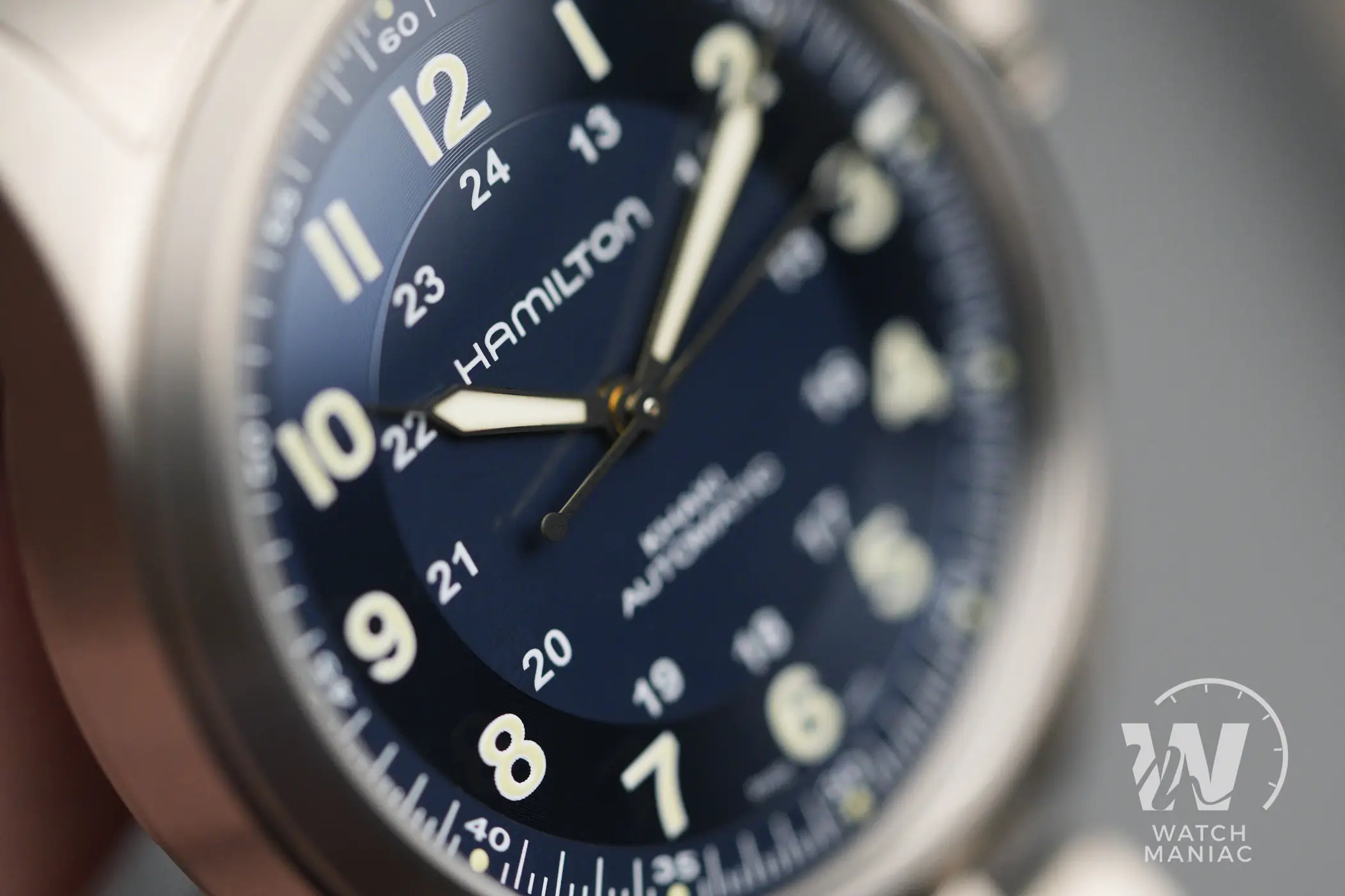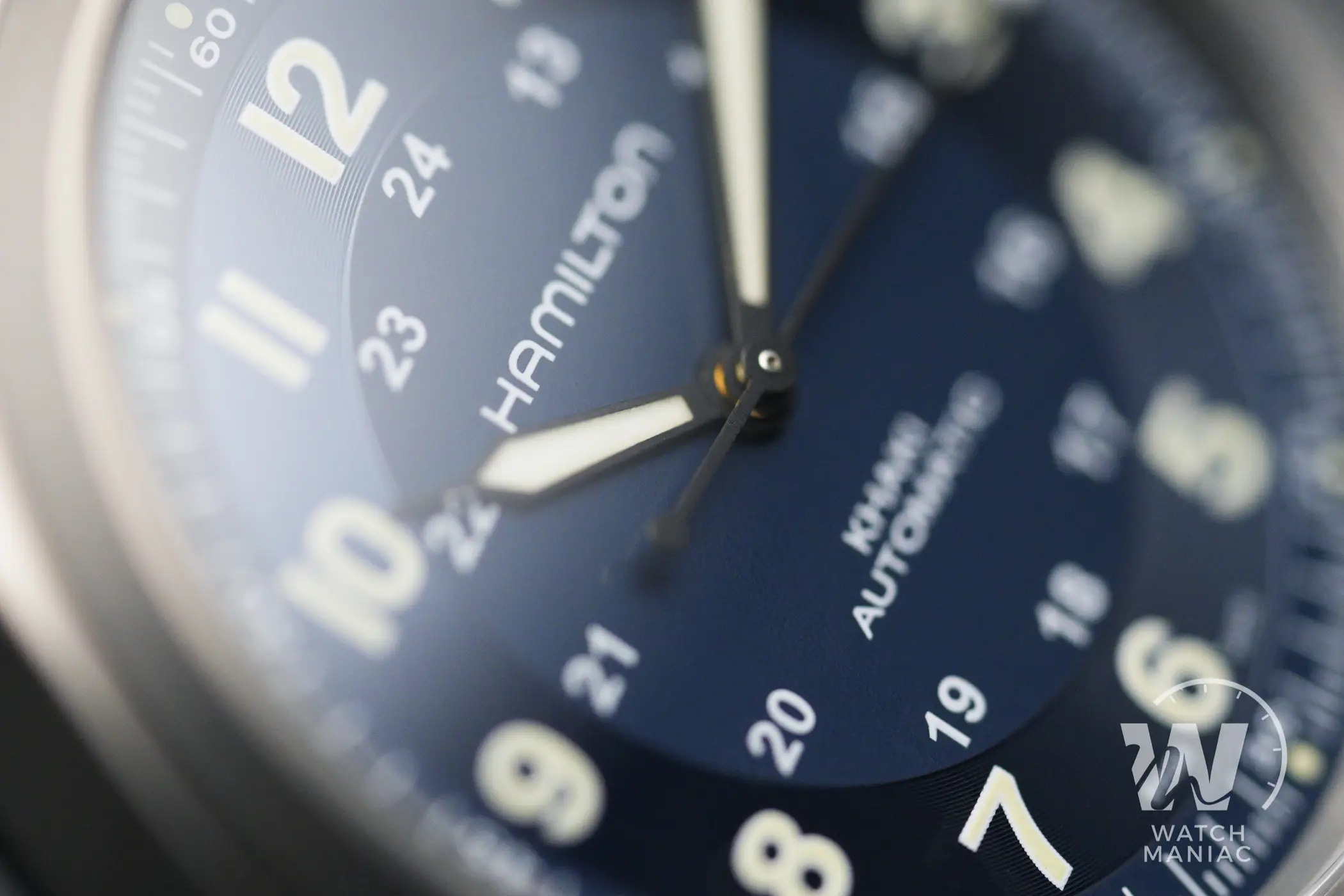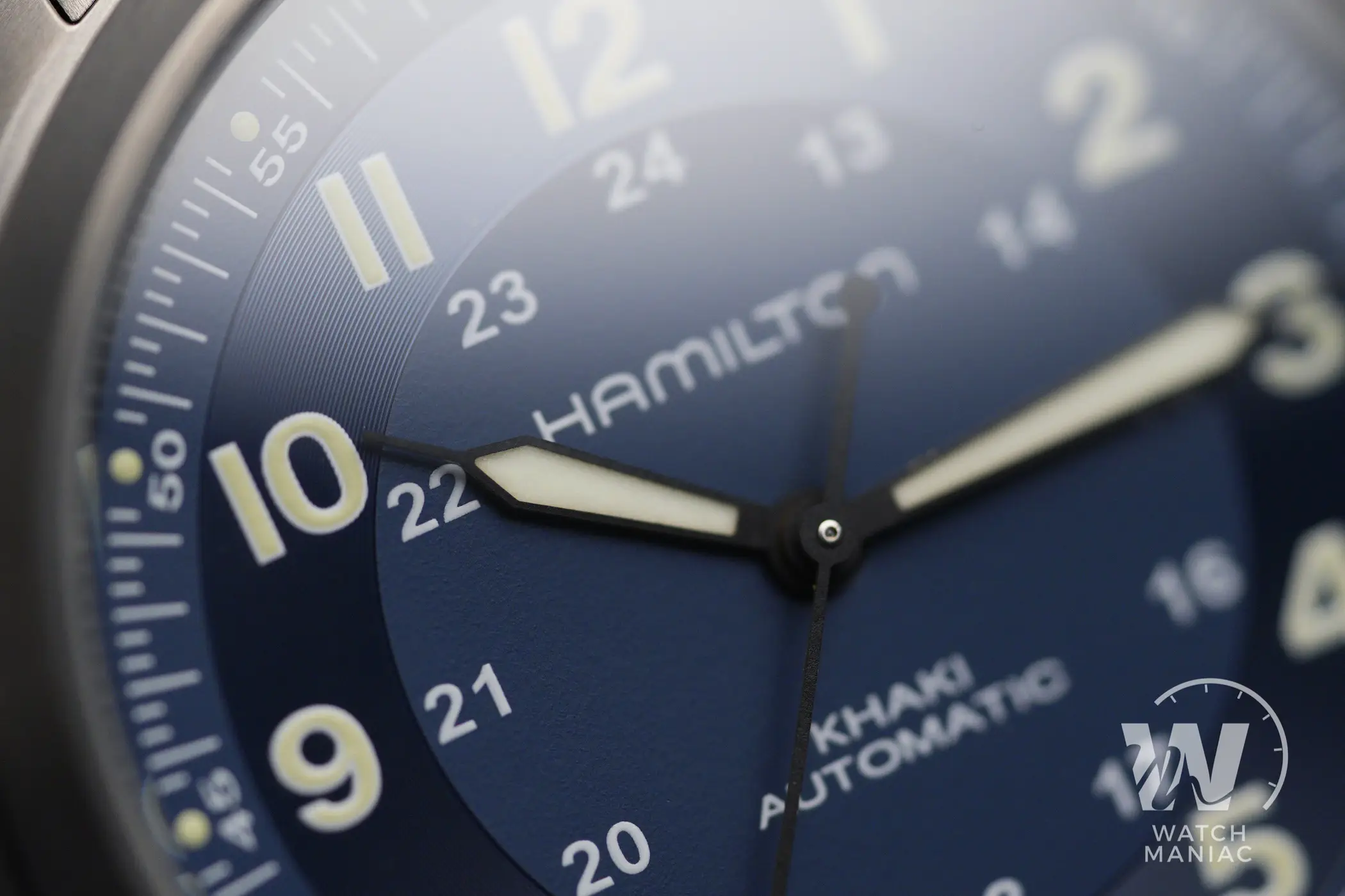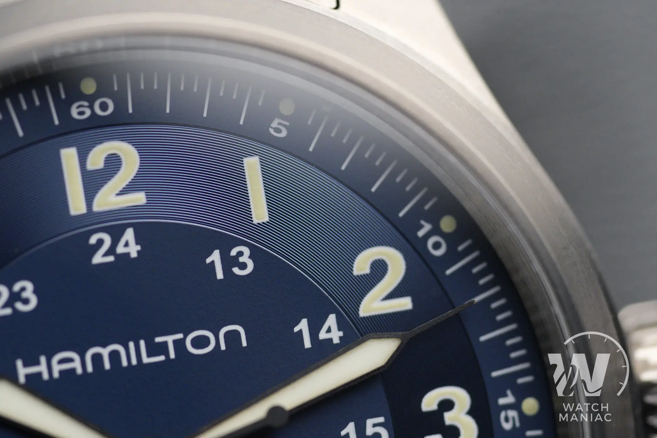 I nuovi modelli del Khaki Field Titanium sono disponibili in 4 diverse configurazioni, da 38mm e da 42mm, con quadrante blu e titanio “nudo” oppure con quadrante nero e rivestimento PVD su cassa e bracciale. E, nel caso specifico, l’abbinamento del quadrante blu con il grigio un po’ più scuro tipico del titanio è davvero azzeccato. Le scritte sono ridotte al minimo ed è una fortuna, dato che Hamilton su questo modello utilizza la classica grafica che riporta anche le ore postmeridiane. Sui Khaki Field Titanium i quadranti sono movimentati dalla presenza di un anello sul quale sono posizionati gli indici realizzati in Superluminova. La finitura a solchi concentrici, quando viene colpita dalla luce, crea dei riflessi particolarmente interessanti, quasi iridescenti, soprattutto in abbinamento con la colorazione blu di questa versione. È un buon modo di rendere più elaborato e ricercato il quadrante senza però rischiare di alternarne la leggibilità.
