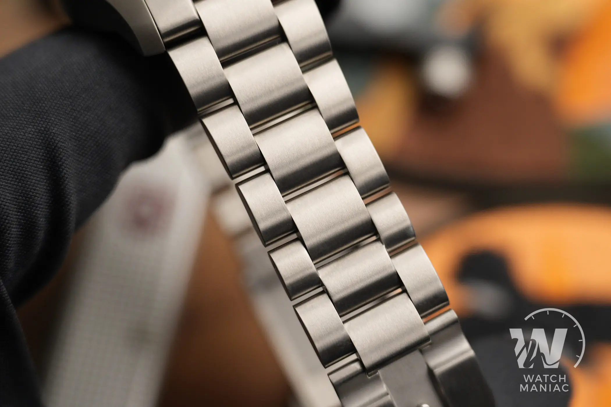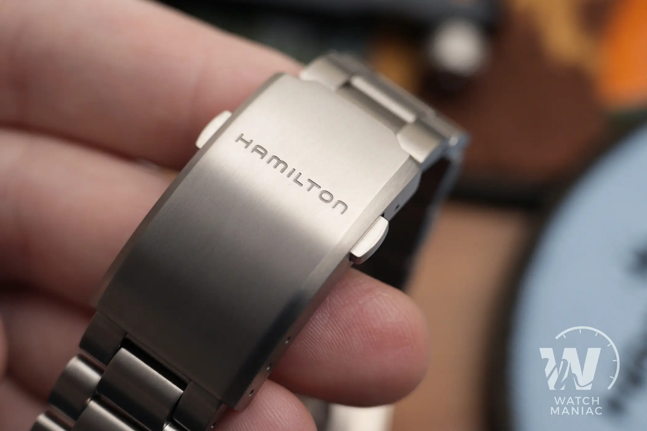 L’elemento realmente innovativo di questa referenza, comunque, è il bracciale. Anch’esso è realizzato in titanio, come la cassa, ed è satinato in modo altrettanto impeccabile. Il design a tre elementi si adatta bene allo stile dell’orologio e le maglie tenute insieme da perni a pressione con collarino centrale sono molto flessibili le une sulle altre. La chiusura è simile a quella utilizzata anche su altri modelli di Hamilton, molto solida e piacevole da vedere, con marchio Hamilton all’interno e all’esterno della scatoletta. Per una regolazione fine della misura del bracciale ci sono due mezze maglie e 3 fori di microregolazione.