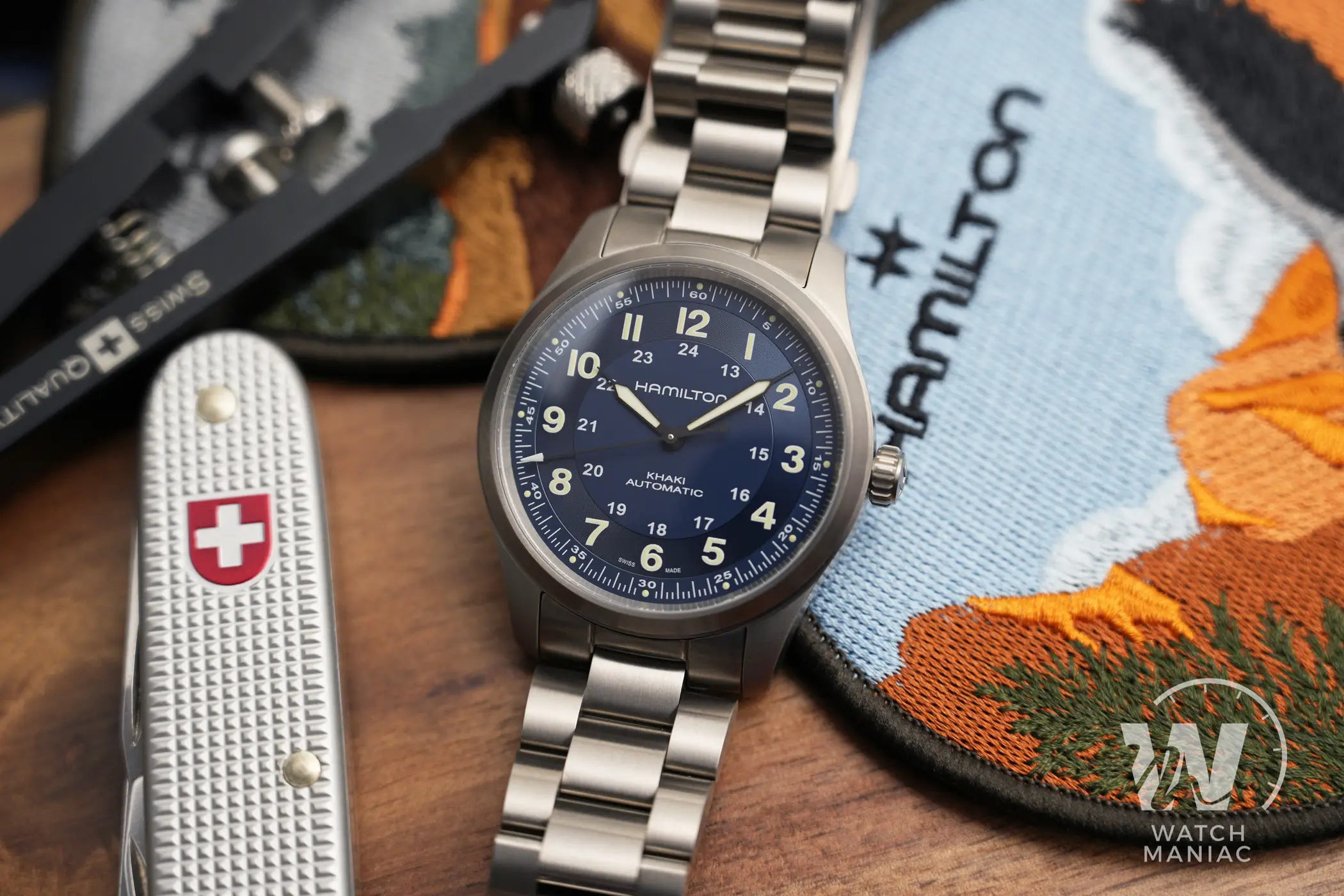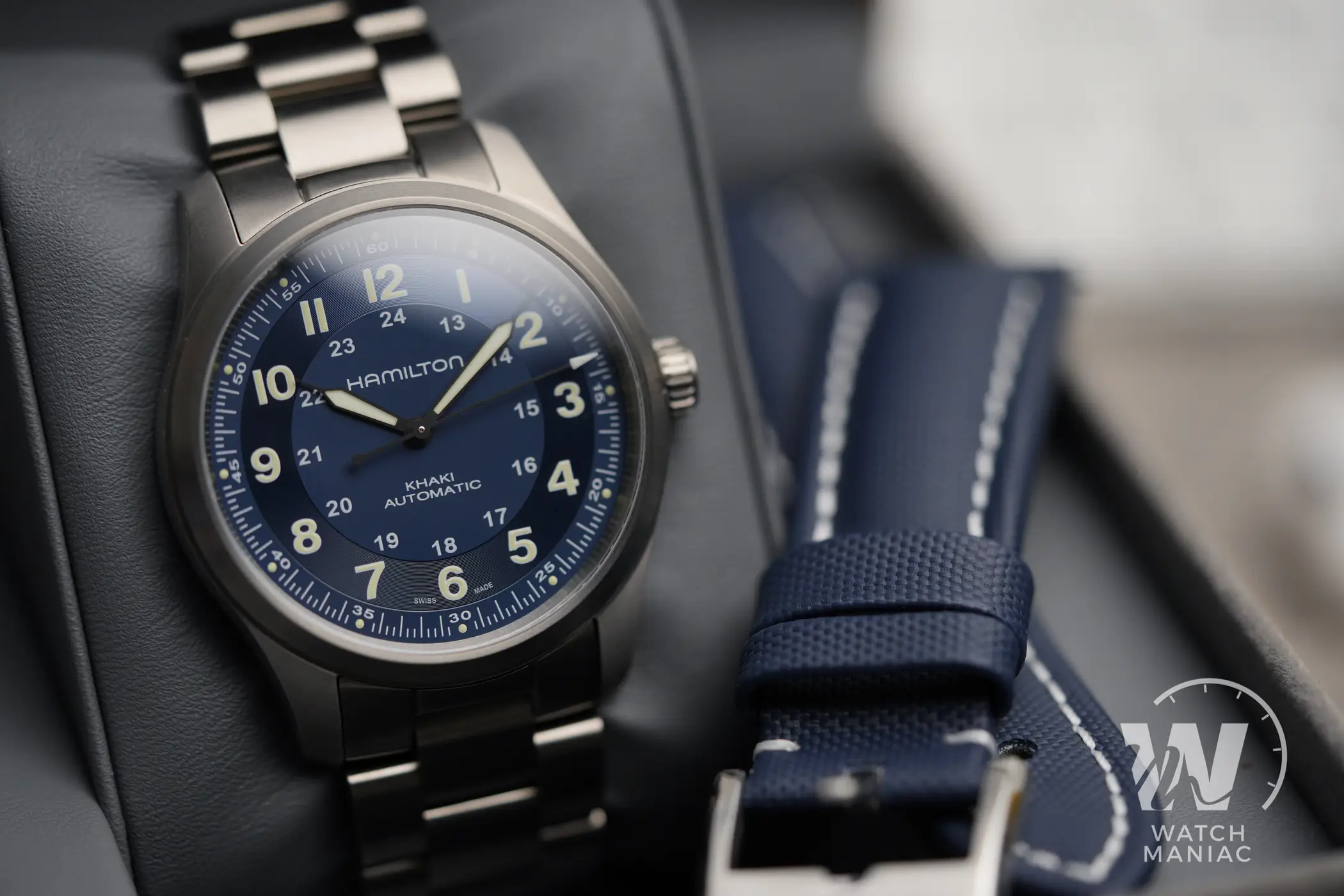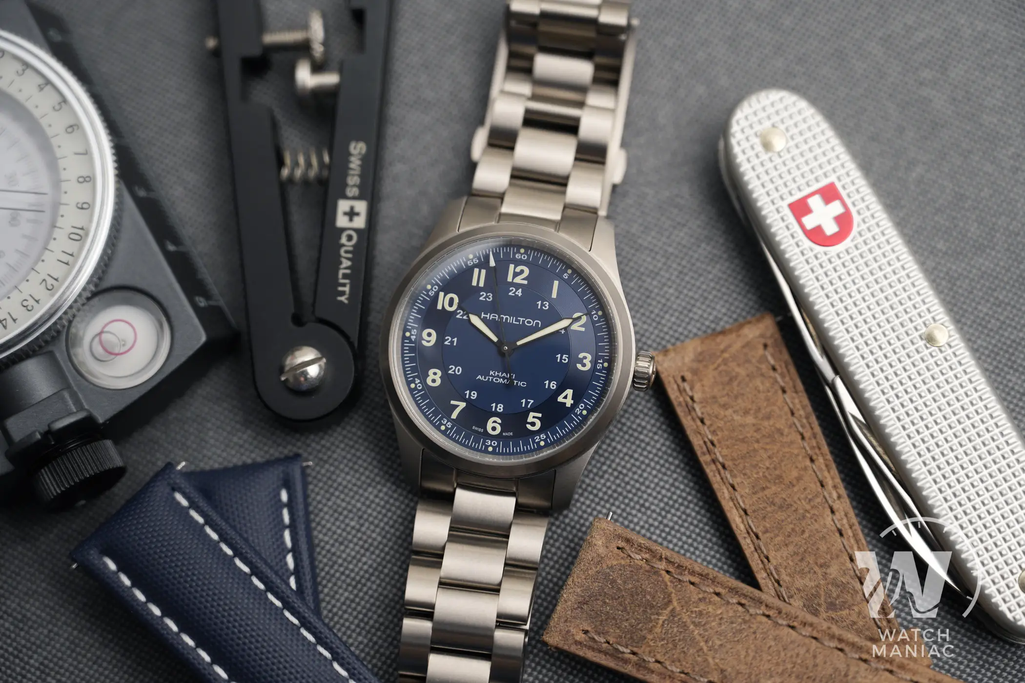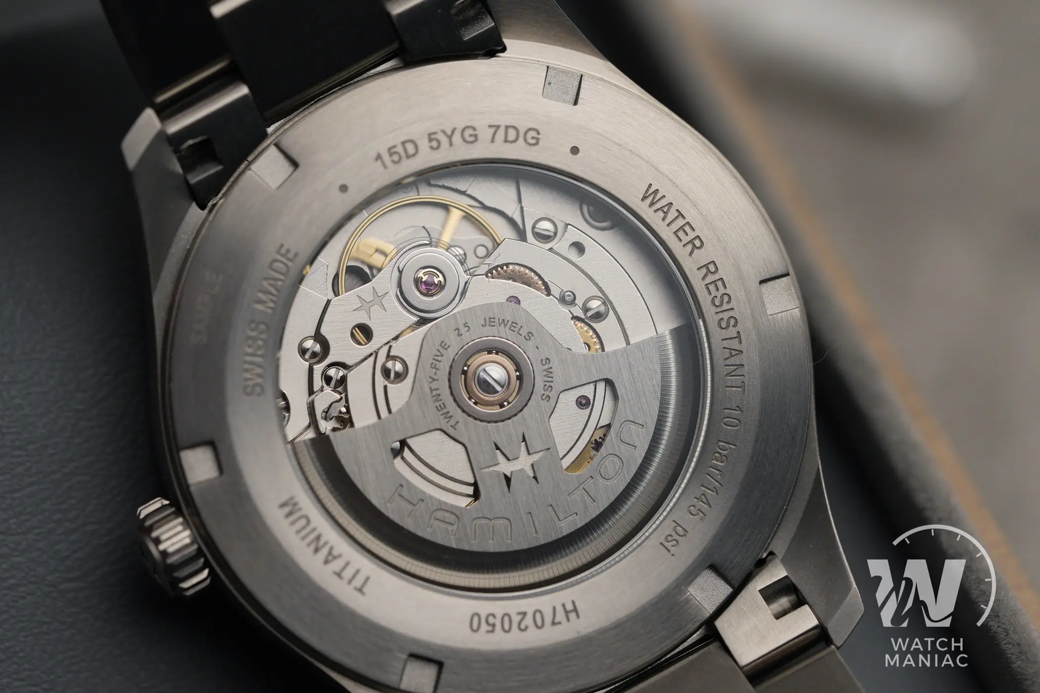 Nel Khaki Field Titanium c’è il movimento H-10, il cavallo di battaglia di Hamilton per quanto riguarda i solo tempo, derivato dall’ETA 2824 ma con una serie di modifiche sostanziali allo scappamento, all’organo di regolazione della marcia e alla molla di carica. A fronte di una frequenza ridotta a 21.600a/h, può contare su una riserva di carica di ben 80 ore, con possibilità di ricarica manuale e fermo macchina. Pur non movimenti con certificazione COSC, solitamente sono in grado di raggiungere prestazioni davvero buone per quanto riguarda precisione e accuratezza.