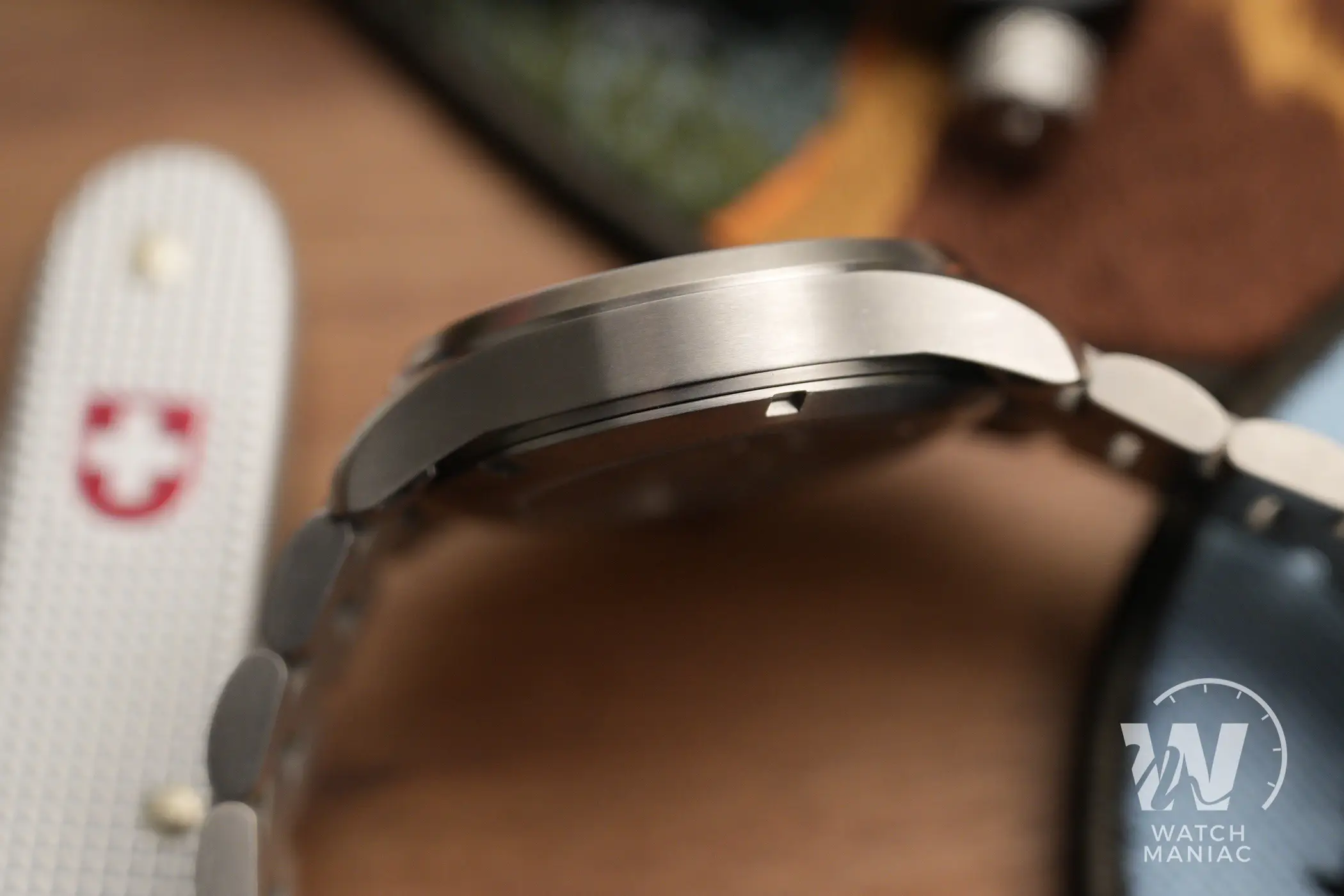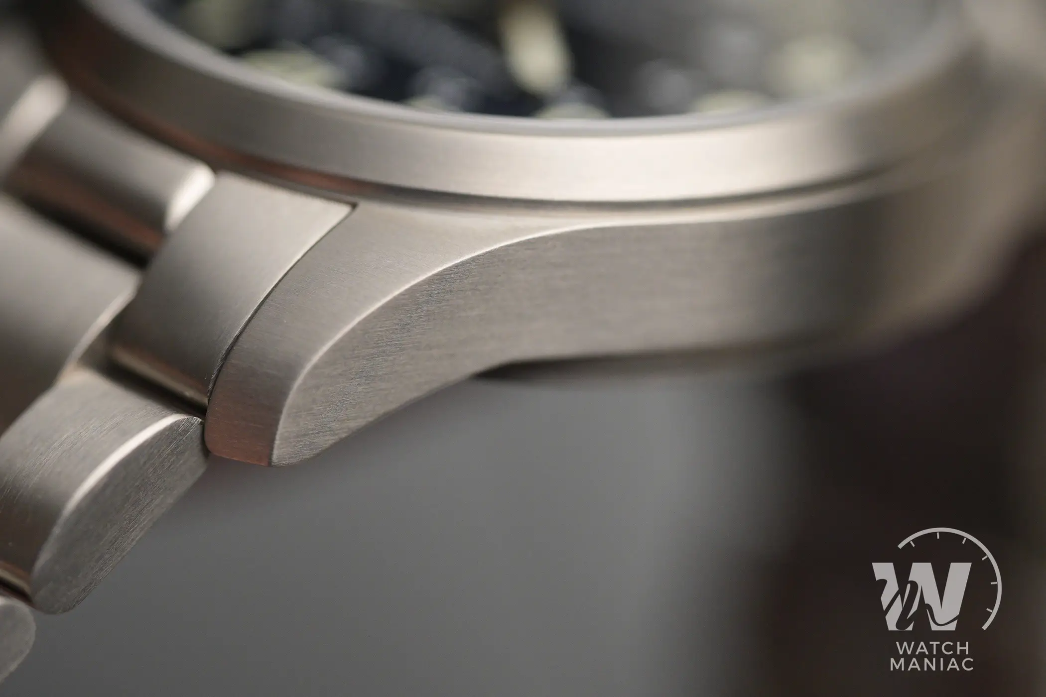 Il vetro è uno zaffiro con lieve curvatura esterna che unita al quadrante scuro sottostante non aiuta troppo nel tenere a bada i riflessi. Tra l’altro, così come su tanti altri modelli della linea Khaki Field, non è presente il trattamento antiriflesso sul lato interno. La cassa ha un design diventato ormai classico per questa tipologia di orologi di Hamilton e qui viene declinato nella colorazione un po’ più scura tipica del titanio. Le belle satinature presenti sulla lunetta, sui fianchi e sulle anse mettono in risalto queste forme senza tempo. Su questo modello lo spessore, pur non essendo eccessivo, risalta un pochino di più perché la cassa è solo da 38mm e dalla vista laterale si può apprezzare la curvatura piuttosto pronunciata delle anse.