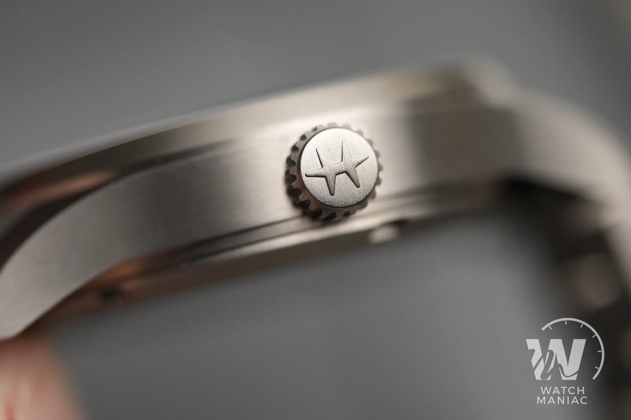 La corona a ore 3 ha il logo in rilievo. È a pressione, un dettaglio in linea con quasi tutti gli altri Khaki Field con la sola eccezione dell’Expedition, ma garantisce comunque un’impermeabilità più che buona fino a 10bar di pressione.