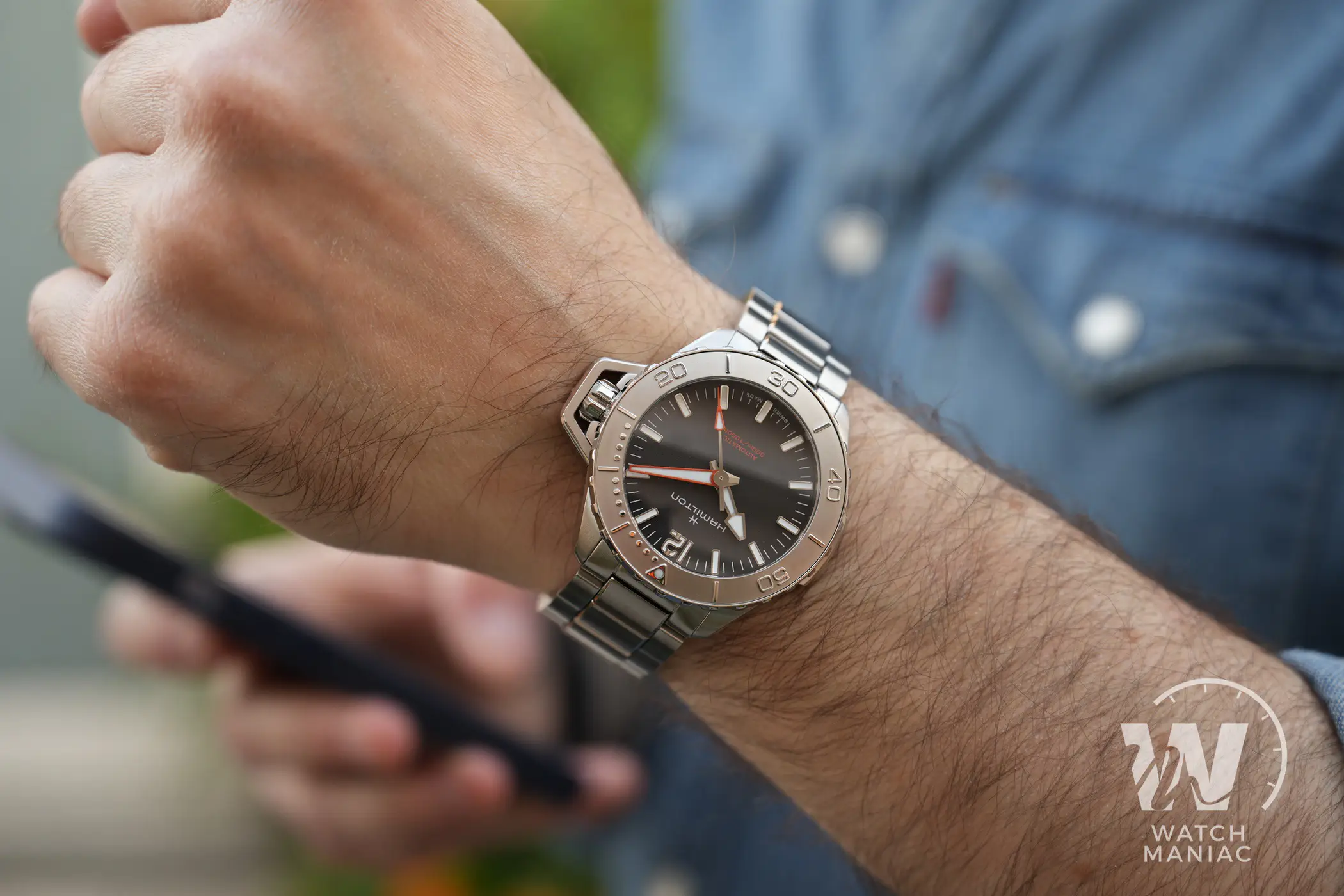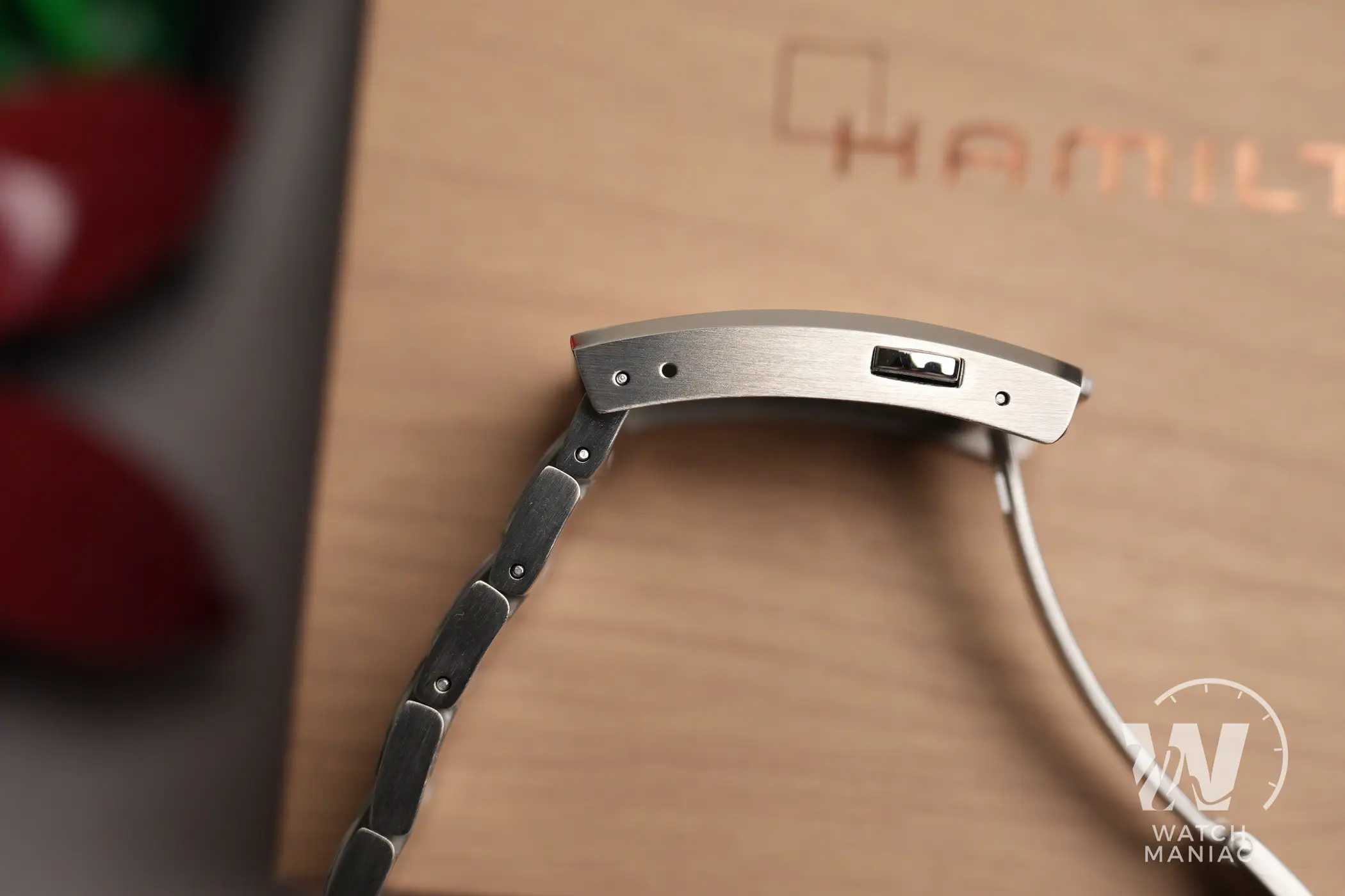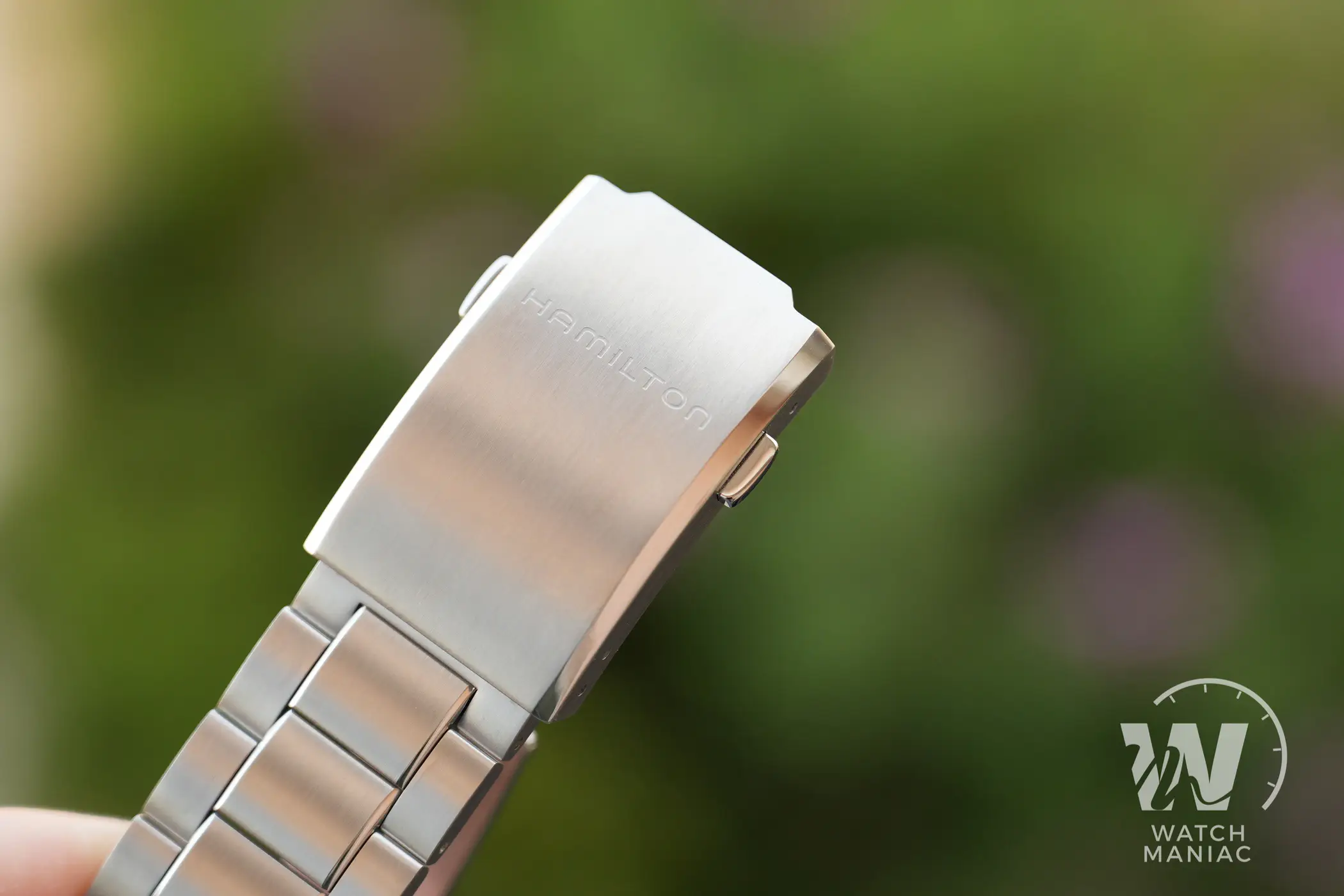 Il bracciale trasmette grandissima solidità e questo è sicuramente legato allo spessore delle maglie, per le quali Hamilton non ha di certo risparmiato acciaio. La finitura è in gran parte satinata, a parte i biselli lucidi ai lati dell’elemento centrale. L’unico dettaglio che personalmente potrebbe essere migliorabile è la clasp, sprovvista di un sistema di estensione per la muta con soli 2 fori per la microregolazione. Molto bello però il braccio interno lucido e con il marchio inciso.