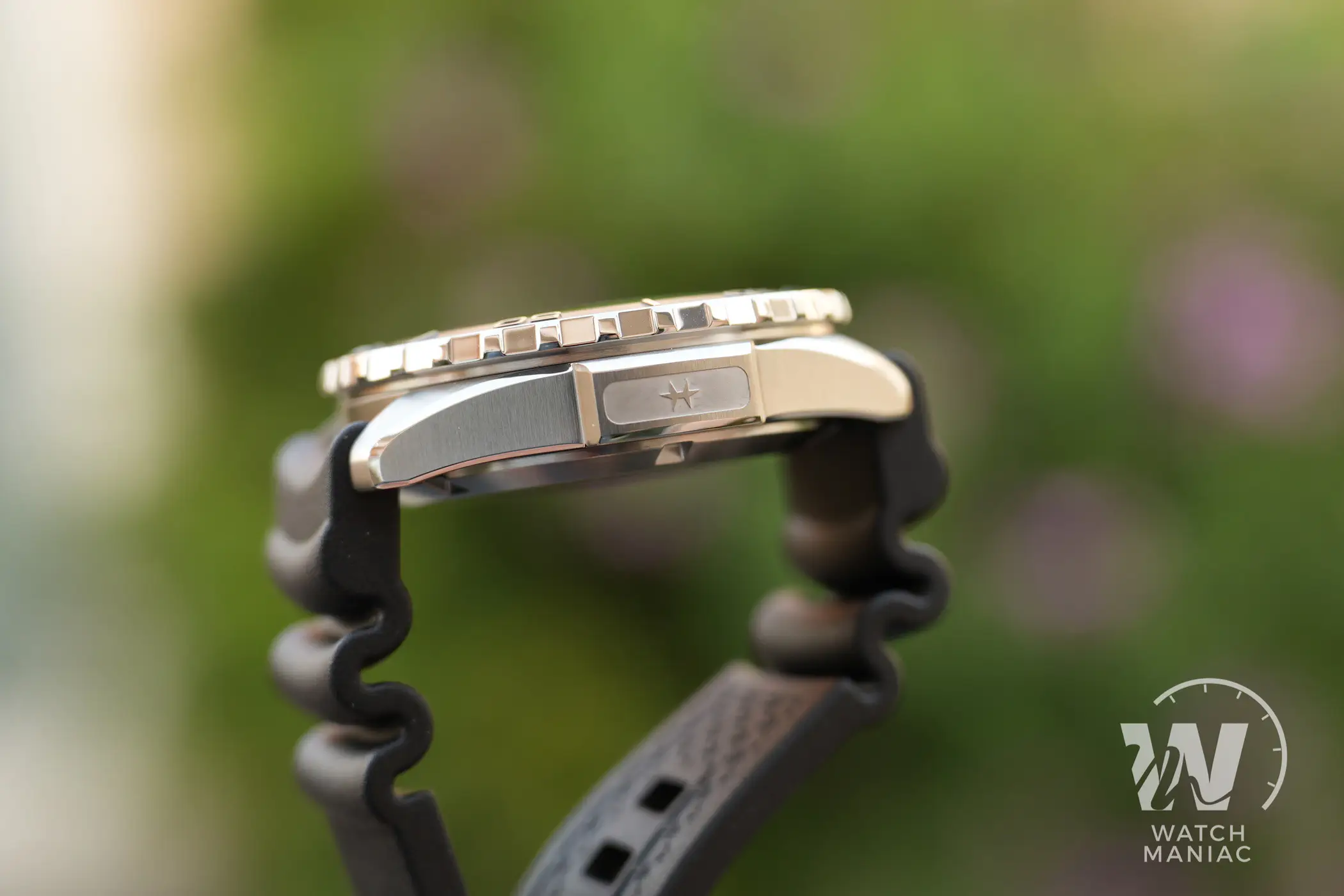 Ma veniamo all’altra caratteristica saliente del Frogman. Storicamente su questi modelli di Hamilton era sempre stato utilizzato un sistema particolare per la tenuta stagna della corona, ma a partire dal 46mm introdotto nel 2022 si è passati ad una soluzione differente. Rispetto ad una normale corona a vite, infatti, non dovrebbe cambiare nulla per quanto riguarda l’impermeabilità. Questa struttura però è molto utile come protezione dagli urti dato che la corona è completamente inglobata al suo interno e non ci sono spigoli in cui impigliarsi durante un’immersione. È anche utile in fase di serraggio, poi, perché questo sistema tiene sempre perfettamente in asse la corona ed evita che ci siano giochi laterali.