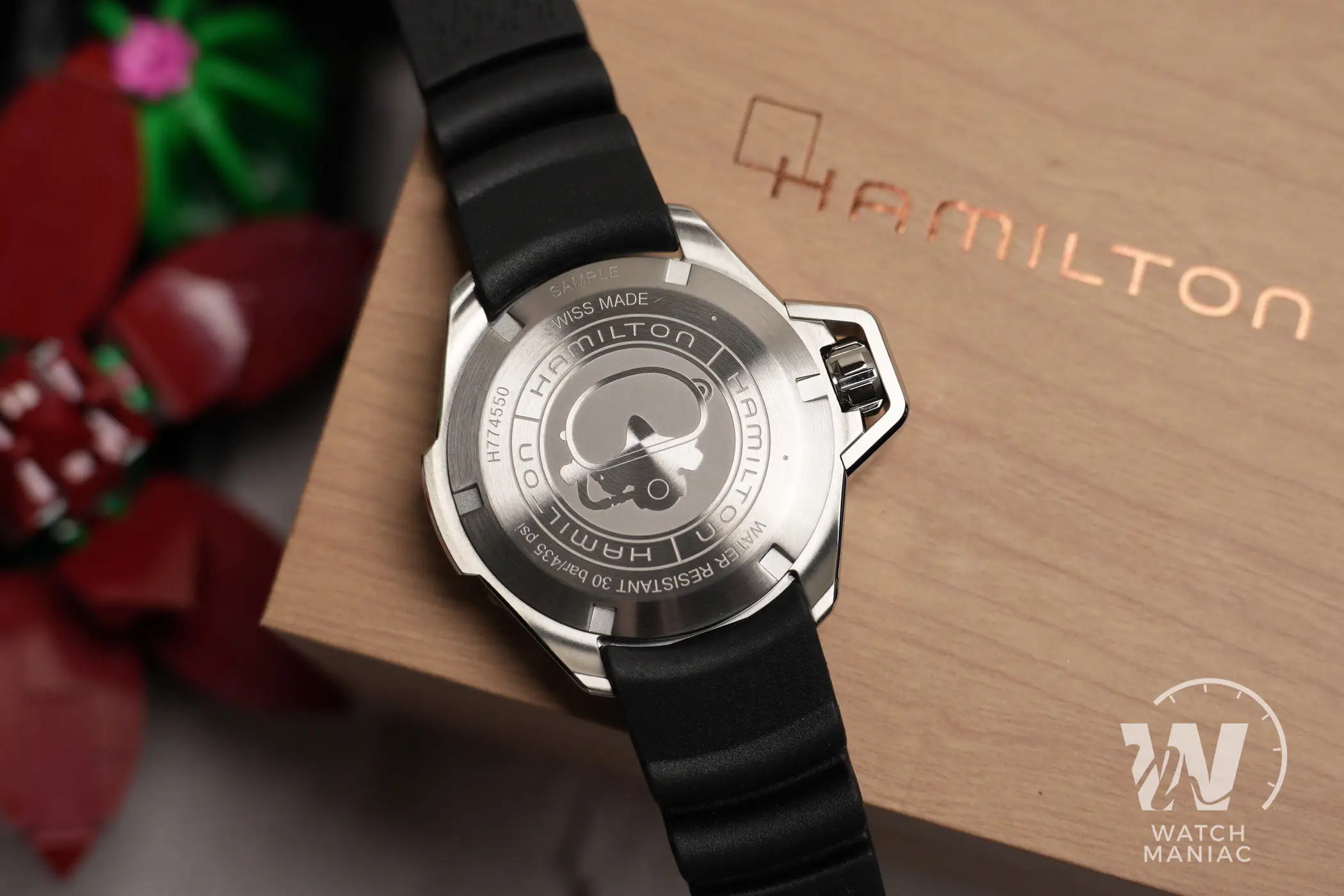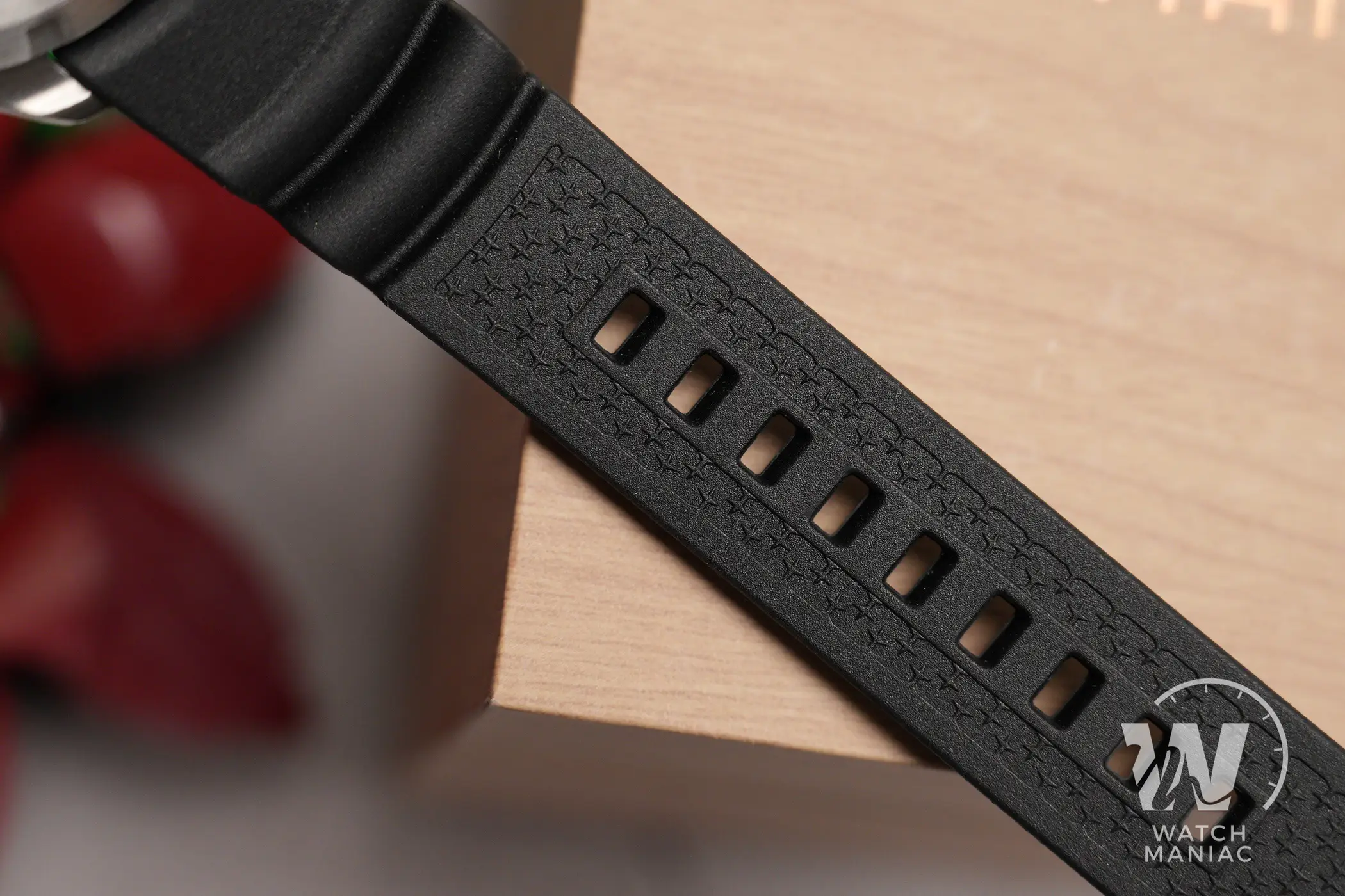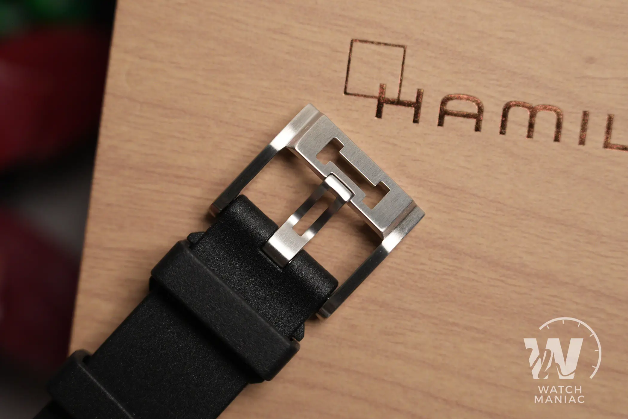 Il cinturino in gomma è analogo a quello che vi avevo mostrato nella recensione del Frogman da 46mm, realizzato in un materiale di buona qualità che non attira particolarmente polvere e pelucchi, ma che rimane morbido e flessibile. Ha le pieghe di estensione vicino alle anse per dare maggior adattabilità e comfort al polso, sul lato interno la lavorazione antiscivolo è costituita dalla H di Hamilton che si ripete e la fibbia ad ardiglione è solida e bella da vedere.