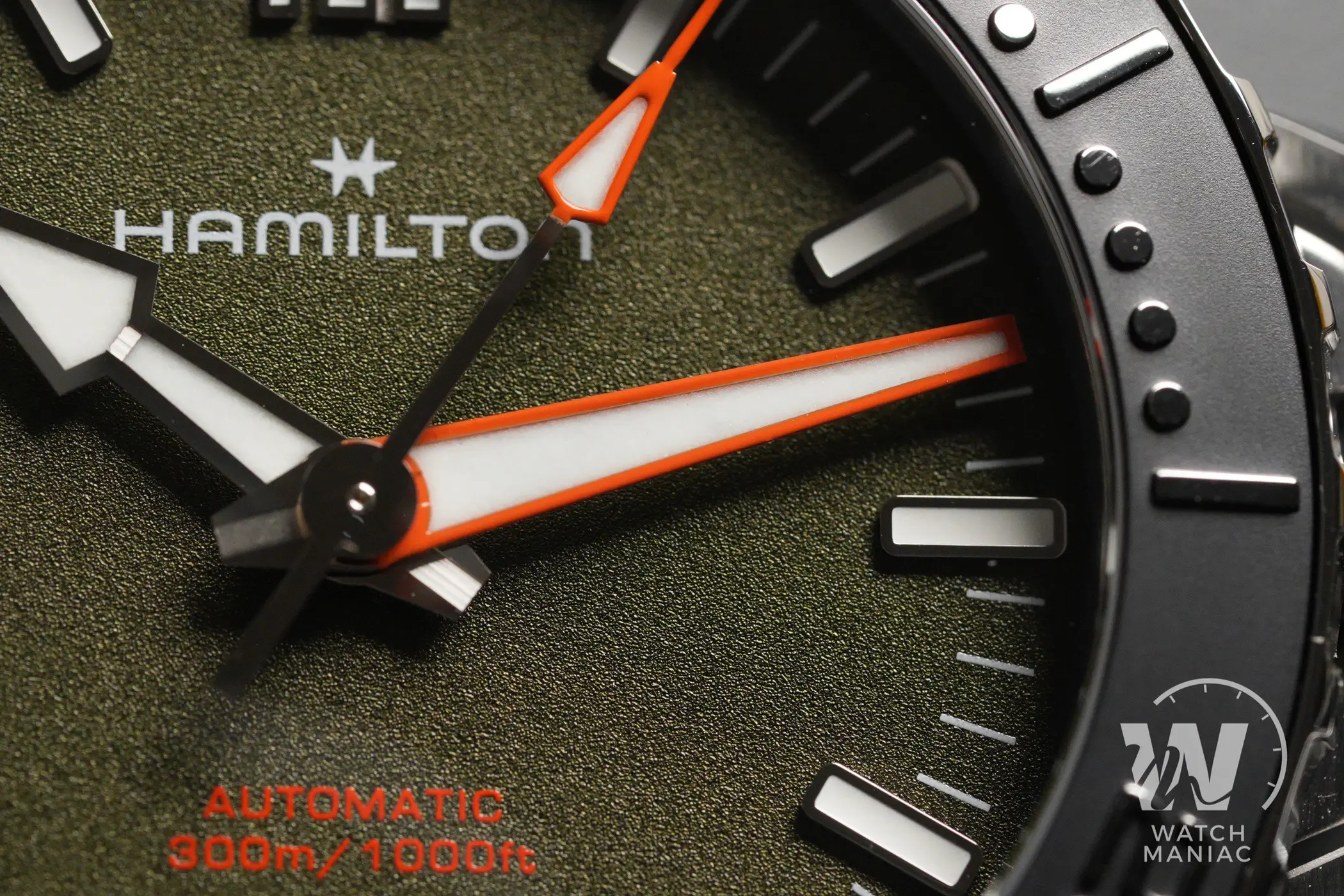 Da un diver che si rispetti ci si aspettano ottime prestazioni al buio e da questo punto di vista l’Hamilton Frogman non delude di certo. La tipica luminescenza in tonalità bluastra della Superluminova BGW9 è particolarmente duratura e consente una perfetta leggibilità dell’ora anche in condizioni di scarsa illuminazione.