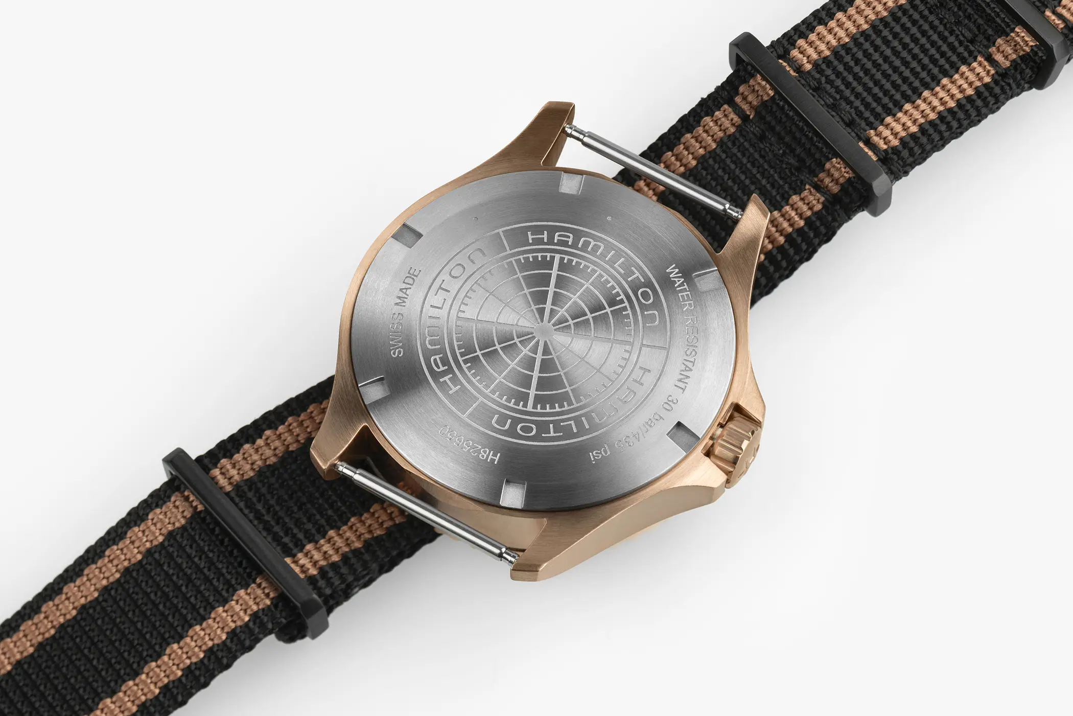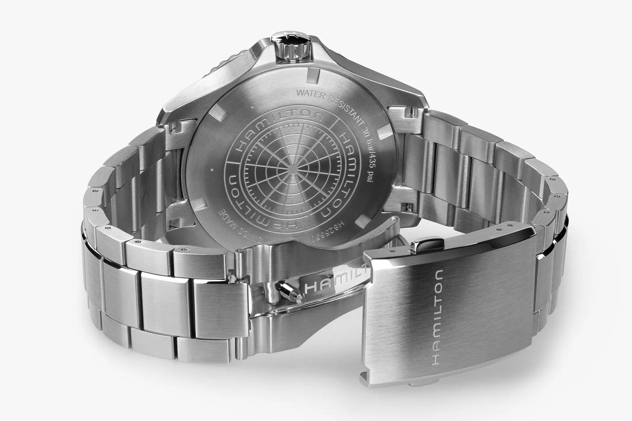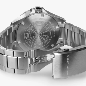Ad animare l’orologio troviamo al suo interno il calibro H14 con 80 ore di riserva di carica e la spirale in Nivachron, una lega con un’elevata resistenza ai campi magnetici. La frequenza è di 21.600a/h con la funzione data a ore 3, complicazione mancante nella versione del Navy Scuba da 43mm solo tempo.