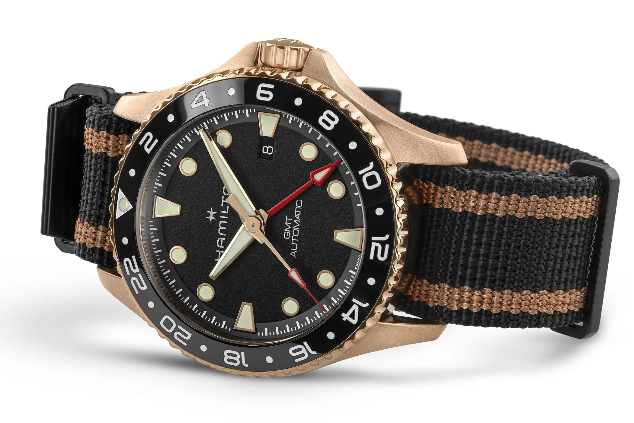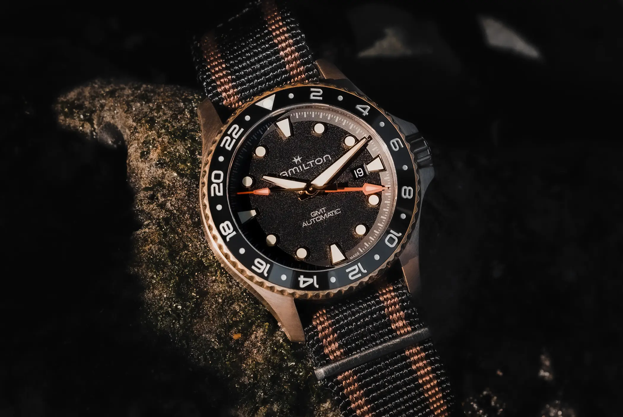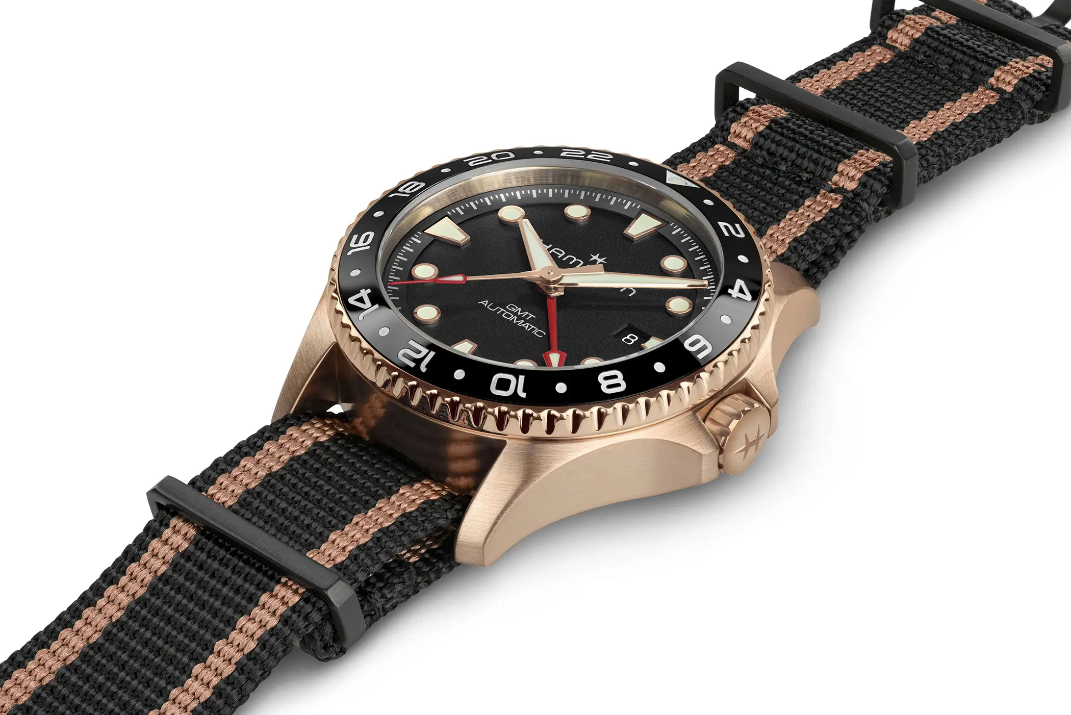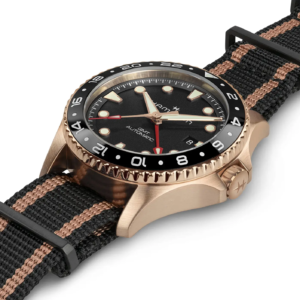 Il Khaki Navy Scuba Auto GMT, viene proposto in due configurazioni: cassa e bracciale in acciaio o cassa in bronzo con cinturino NATO in tessuto con passanti in PVD.