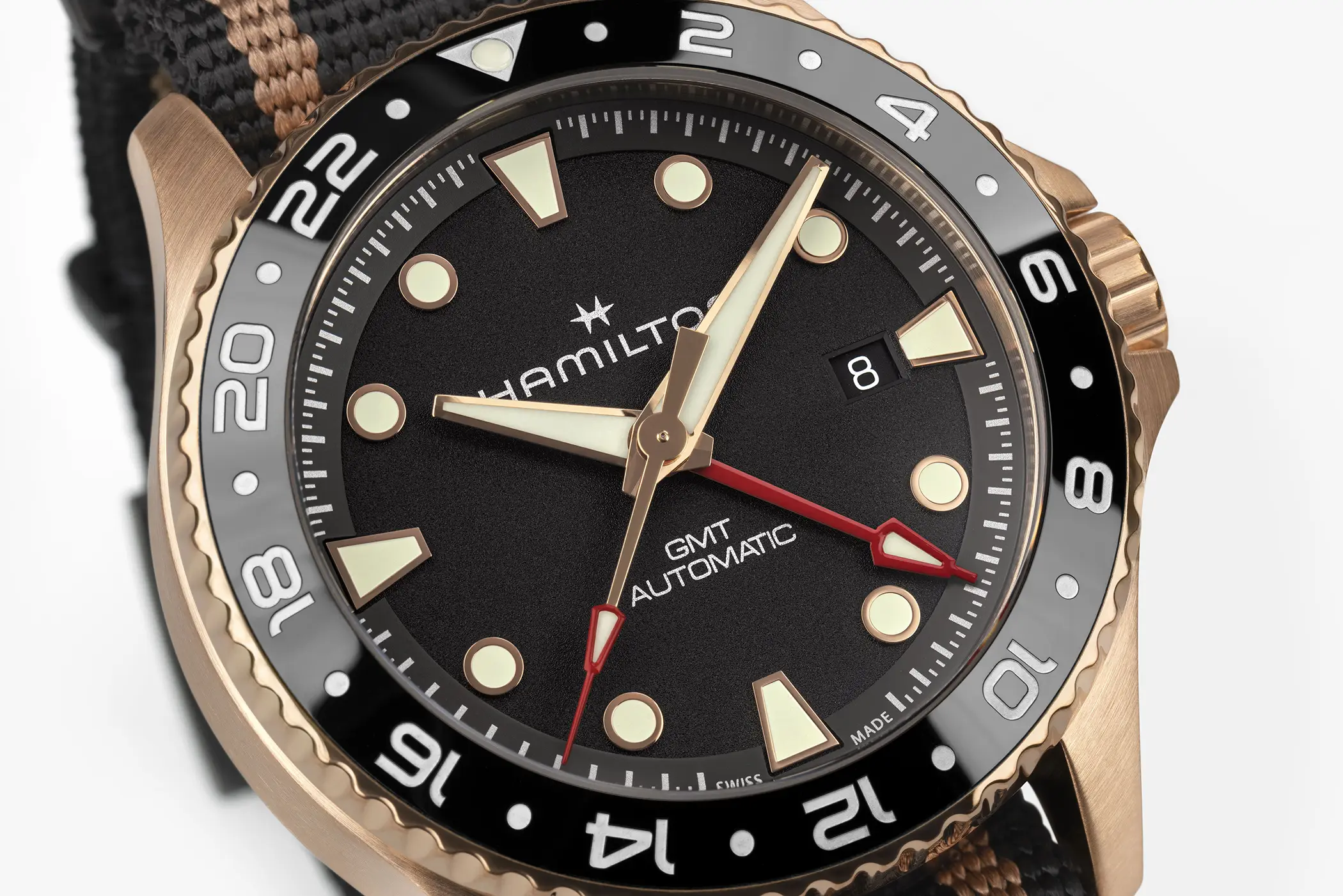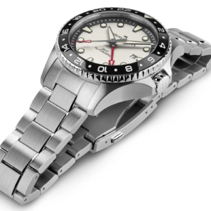 Nella versione in acciaio inossidabile il quadrante è di colore bianco, mentre per quella in bronzo la finitura è nera e, in entrambe i casi, il disco data è della stessa tonalità del quadrante. Gli indici applicati e le sfere di ore e minuti sono riempiti di abbondante SuperLuminova con luminescenza verde chiaro e contornati in grigio per la versione acciaio e in oro per la versione in bronzo. Grazie al rosso brillante la sfera GMT è subito ben riconoscibile. Entrambi i modelli sono dotati di ghiera bidirezionale con inserto in ceramica nera, vetro zaffiro a protezione del quadrante e fondello chiuso in acciaio con incise le caratteristiche principali dell’orologio. La corona è a vite e contribuisce a garantire i 300 metri di impermeabilità.