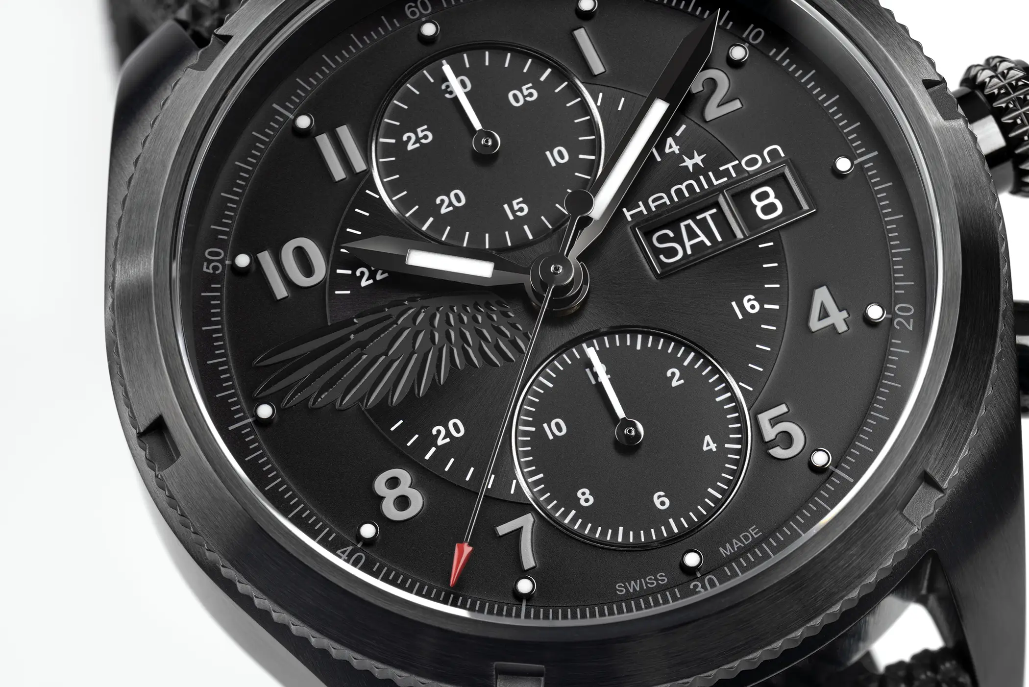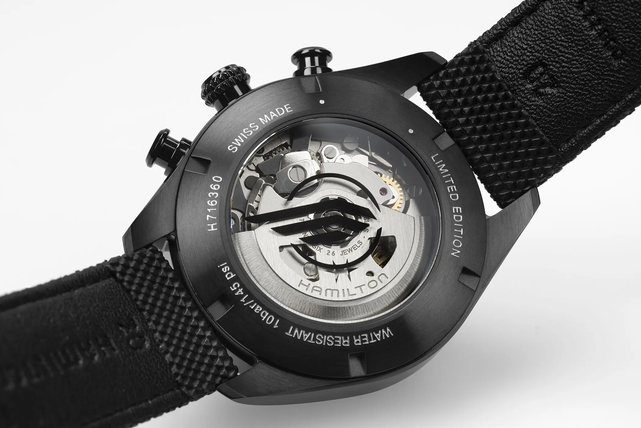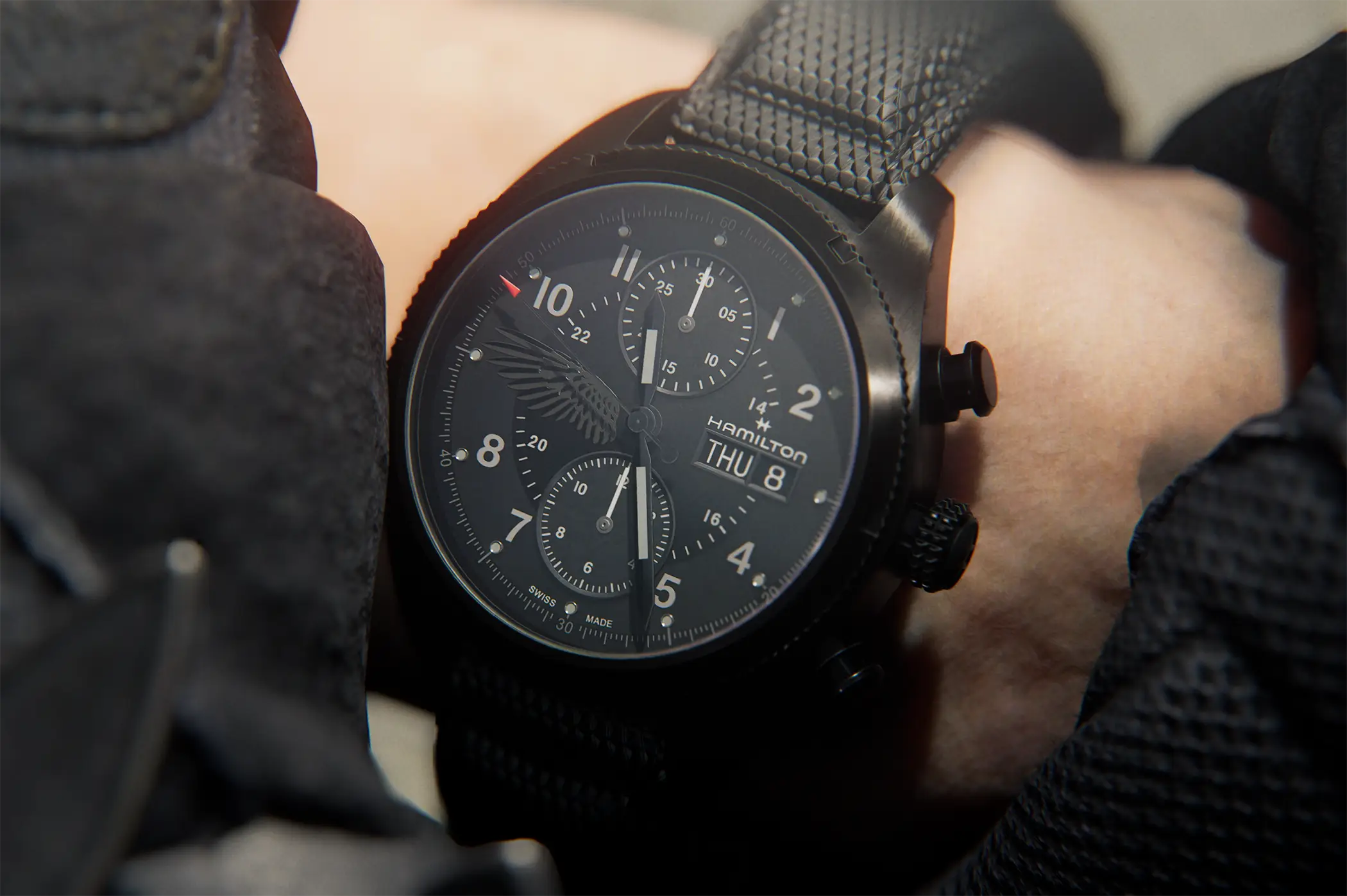 Il modello scelto per Leon è il Khaki Field Auto Chrono (ref. H71636330) reinterpretato con un’estetica decisamente tattica. La costruzione robusta e la vocazione tool watch si sposano con dettagli di design che richiamano il mondo operativo del personaggio: la corona richiama l’aspetto tipico di un mirino, i pulsanti evocano i bossoli di cartucce, mentre elementi simbolici come l’ala nera sul quadrante e l’emblema inciso sul fondello aggiungono una dimensione narrativa più cupa e commemorativa. Il tutto abbinato alla cassa in acciaio da 42 mm di diametro e animato dal calibro automatico H-21 con riserva di carica di 60 ore e spirale in Nivachron.