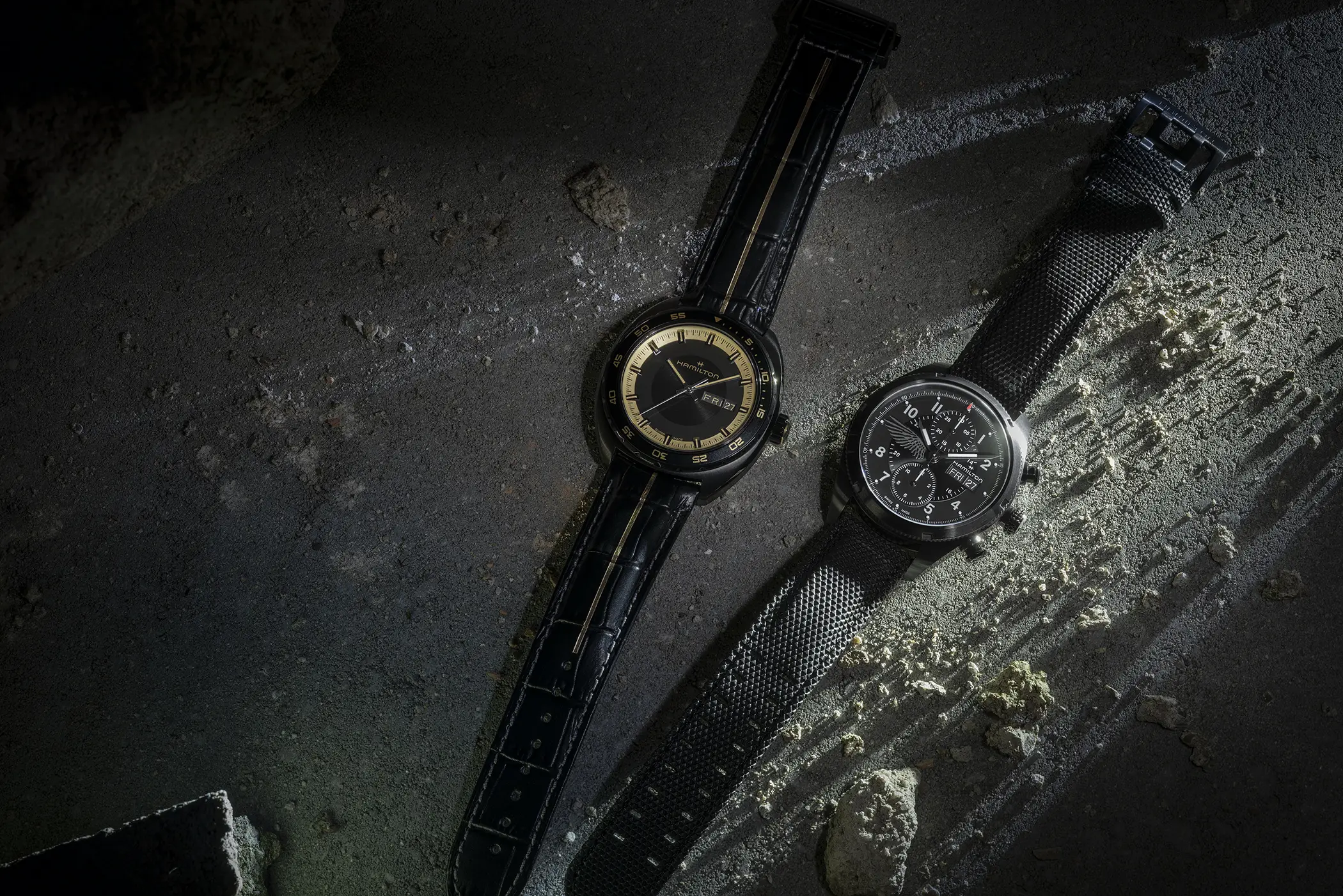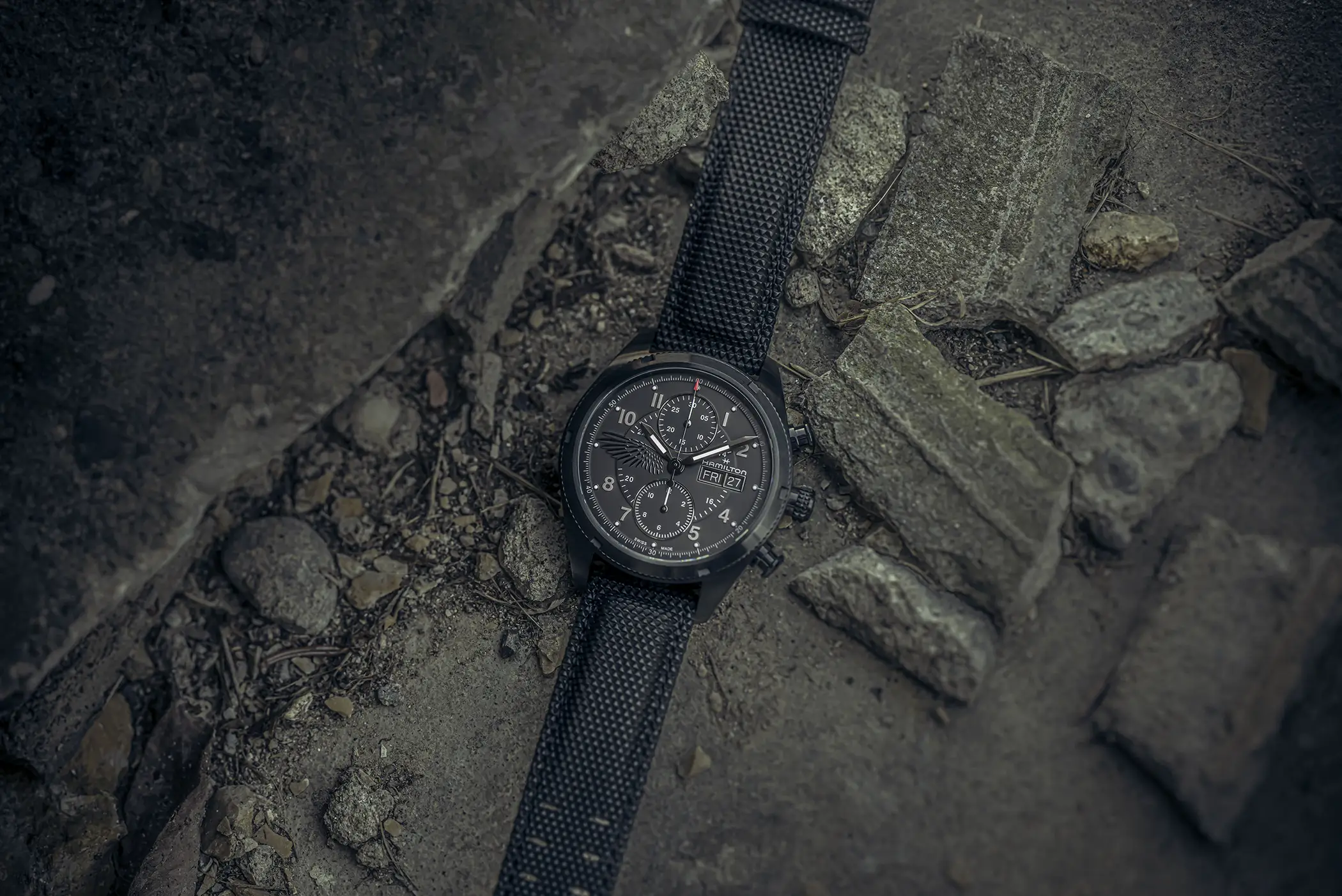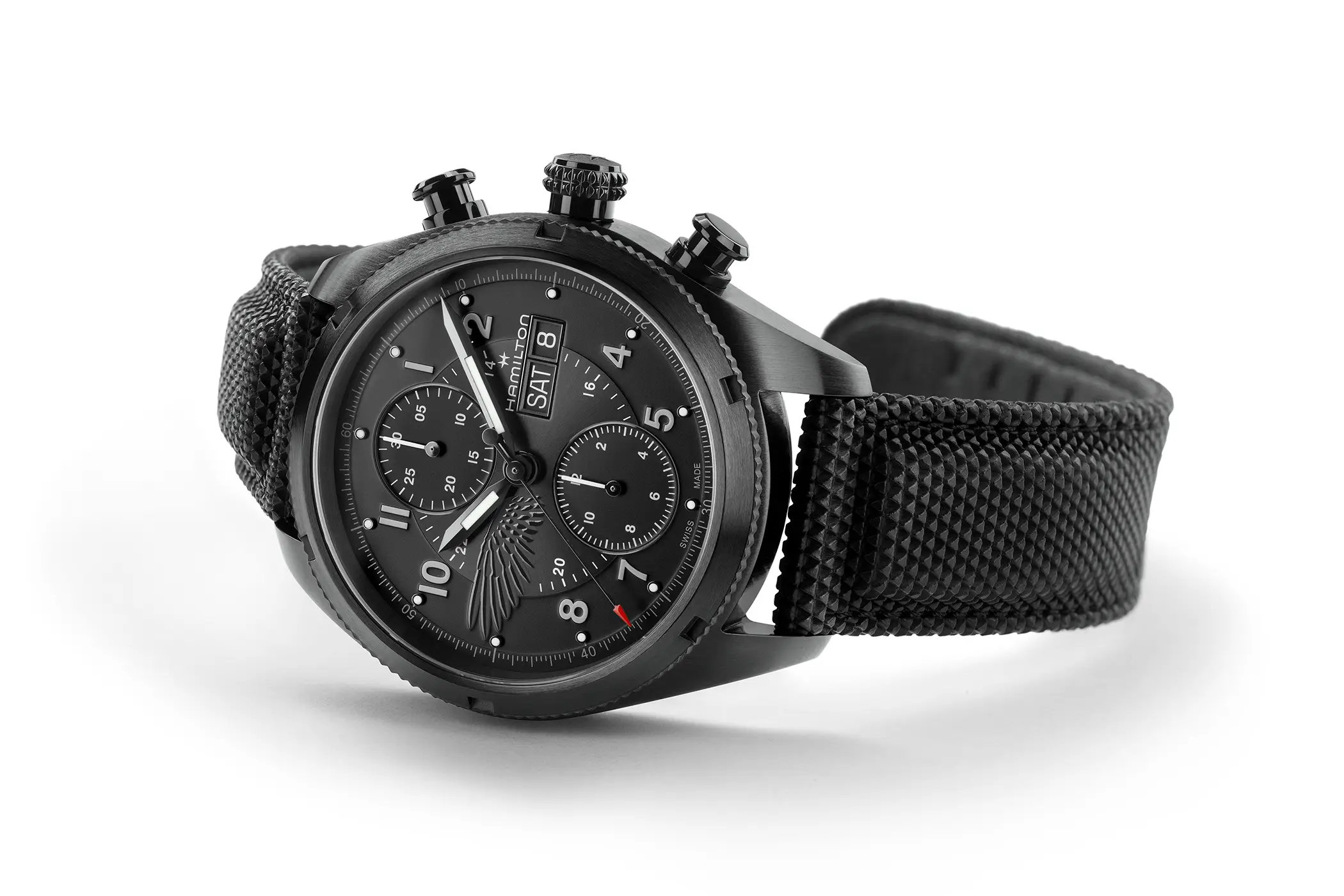 Il modello scelto per Leon è il Khaki Field Auto Chrono (ref. H71636330) reinterpretato con un’estetica decisamente tattica. La costruzione robusta e la vocazione tool watch si sposano con dettagli di design che richiamano il mondo operativo del personaggio: la corona richiama l’aspetto tipico di un mirino, i pulsanti evocano i bossoli di cartucce, mentre elementi simbolici come l’ala nera sul quadrante e l’emblema inciso sul fondello aggiungono una dimensione narrativa più cupa e commemorativa. Il tutto abbinato alla cassa in acciaio da 42 mm di diametro e animato dal calibro automatico H-21 con riserva di carica di 60 ore e spirale in Nivachron.