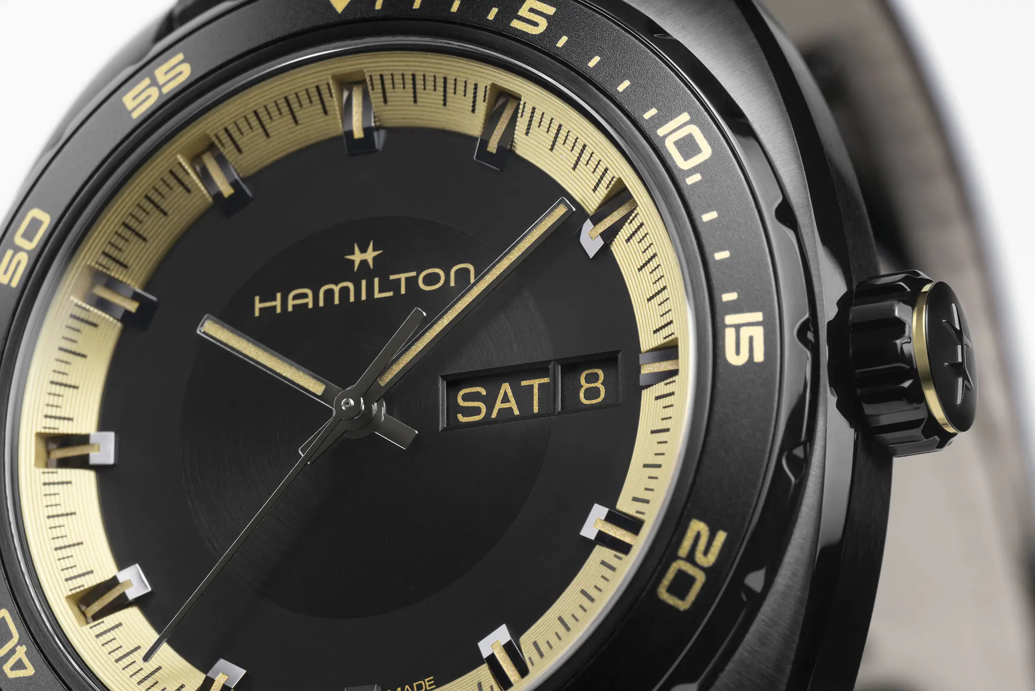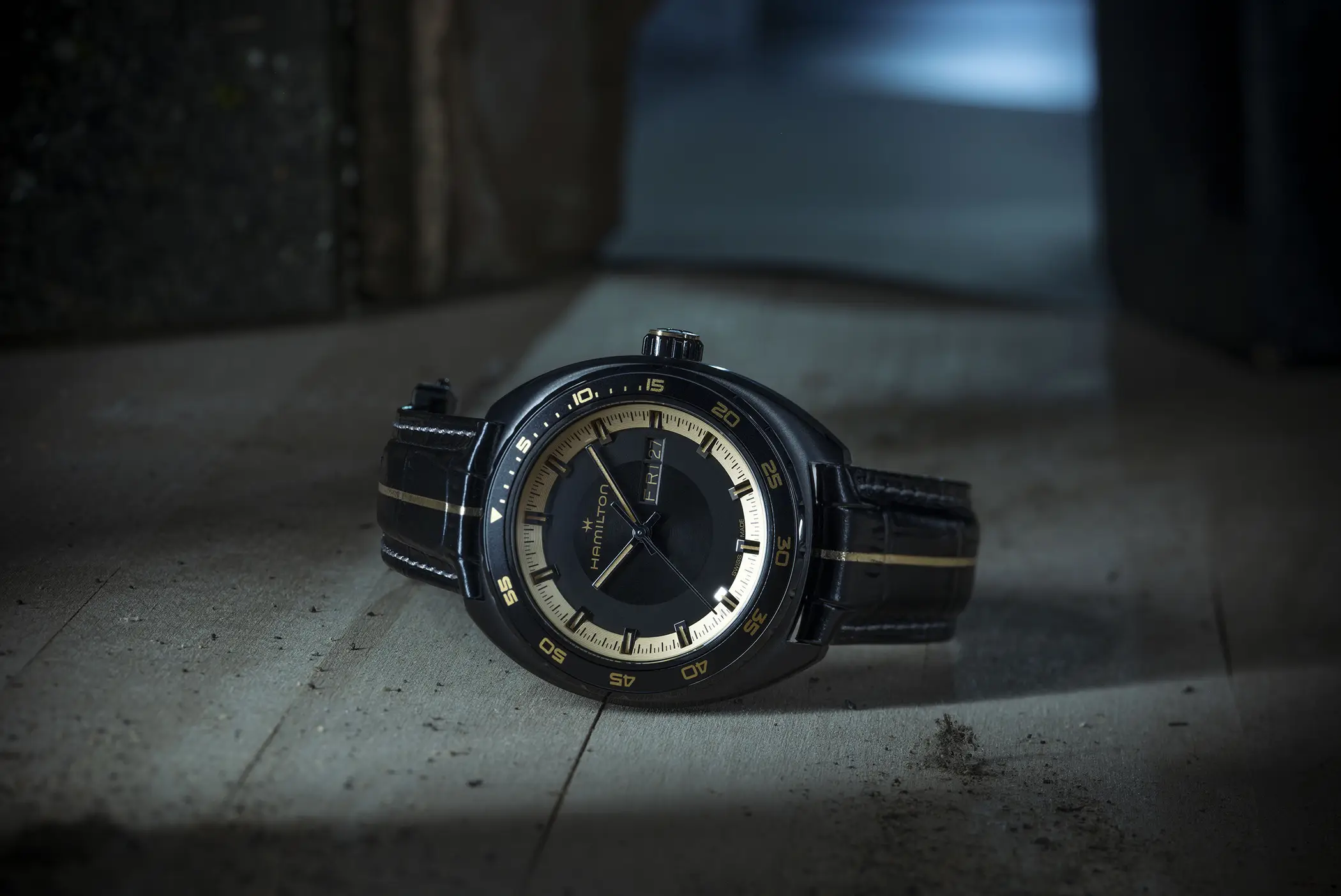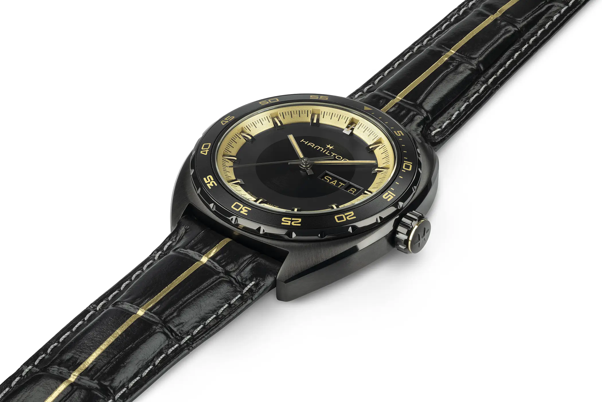 Di segno opposto, ma altrettanto caratterizzante, è il Pan Europ indossato da Grace Ashcroft. Qui Hamilton punta su un contrasto più elegante e razionale: accenti dorati su base nera, linea centrale sul cinturino e dettagli grafici geometrici sul fondello definiscono un’estetica sofisticata che trae ispirazione dall’approccio analitico del personaggio. Anche in questo caso la cassa in acciaio ha un diametro di 42 mm e all’interno c’è il calibro automatico H-30 con funzione giorno e data, riserva di carica da 80 ore e spirale in Nivachron. Entrambi i modelli compariranno nel videogioco e saranno disponibili anche nel mondo reale in edizione limitata a 2.000 esemplari ciascuno e avranno un prezzo suggerito al pubblico di 1.345 € per il Pan Europ (Ref. H35455730) e di 2.095 € per il Khaki Field Auto Chrono (Ref. H71636330).