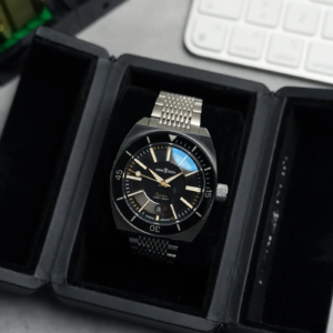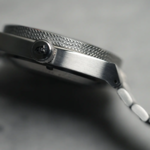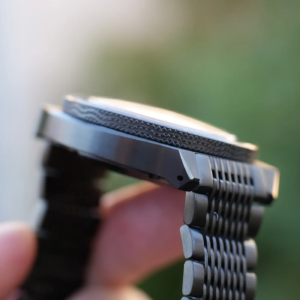 La cassa mantiene un forte legame con lo stile anni 70, ma mantiene una sua spiccata originale con forme e proporzioni decisamente azzeccate. Gli elementi stilistici più caratterizzanti sono le anse oblique sfaccettate, che sono tra l’altro molto compatte e danno un gran carattere all’orologio. La finitura è interamente satinata a parte i biselli lucidi e persino su questi prototipi, già usati per servizi fotografici, si può apprezzare la qualità di realizzazione. Non è uno dei diver più sottili presenti sul mercato, ma comunque lo spessore complessivo non è assolutamente esagerato