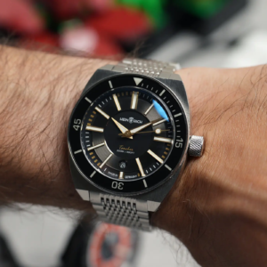 L’Heinrich Taucher è un orologio dalle proporzioni quasi universali, grazie al diametro contenuto e alla distanza da ansa ad ansa non esagerata. Il peso, con il bracciale installato, rientra comunque nella norma per un diver di questo genere realizzato in acciaio. Il diametro è di 40,9mm, la distanza da ansa ad ansa è di 47,3mm, lo spessore complessivo è di 13.7mm, compresa la lieve sporgenza del vetro, e il peso con il bracciale regolato per il mio polso da 16cm è di 151g.