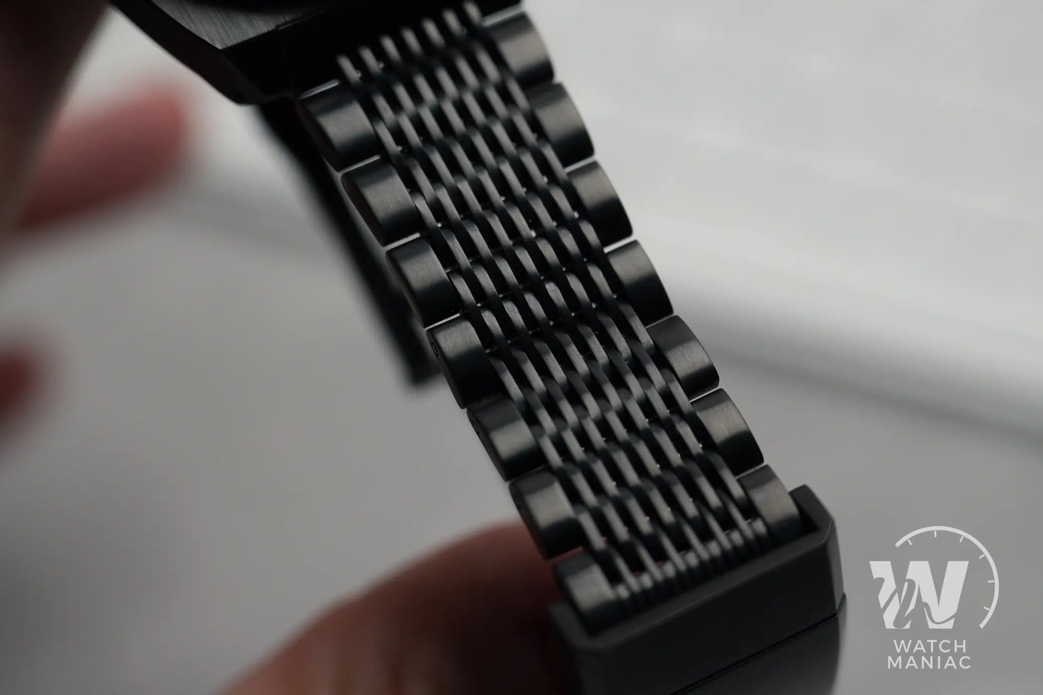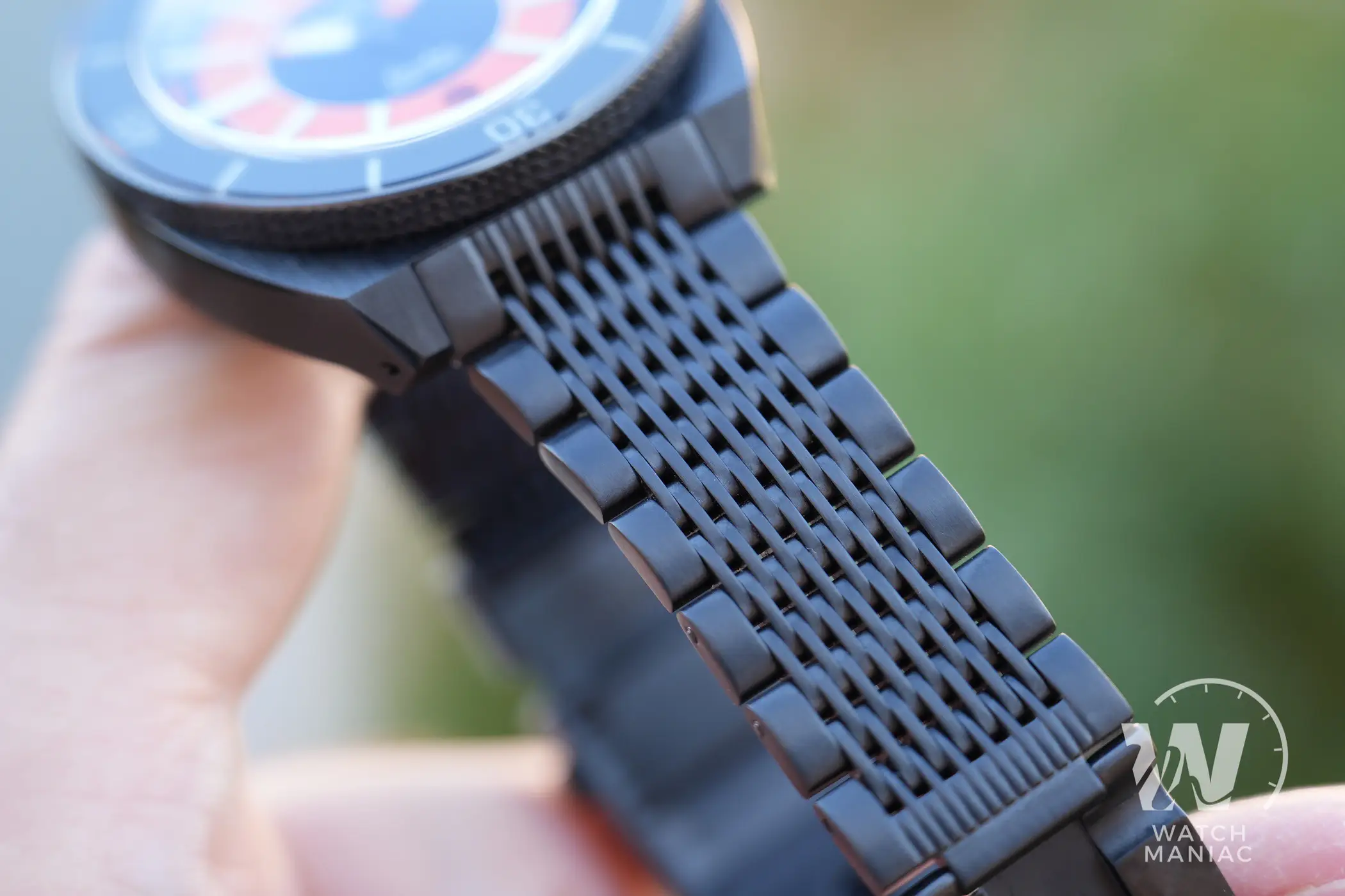 Un altro punto di forza di Heinrich è dato dal bracciale, che resta sostanzialmente lo stesso per la maggior parte dei modelli a catalogo. Con il suo design a 13 elementi centrali sottili è molto caratteristico e unisce una buona solidità ad un peso relativamente contenuto. Le maglie sono tenute insieme da perni a vite e a finitura è interamente satinata, con o senza il rivestimento DLC.