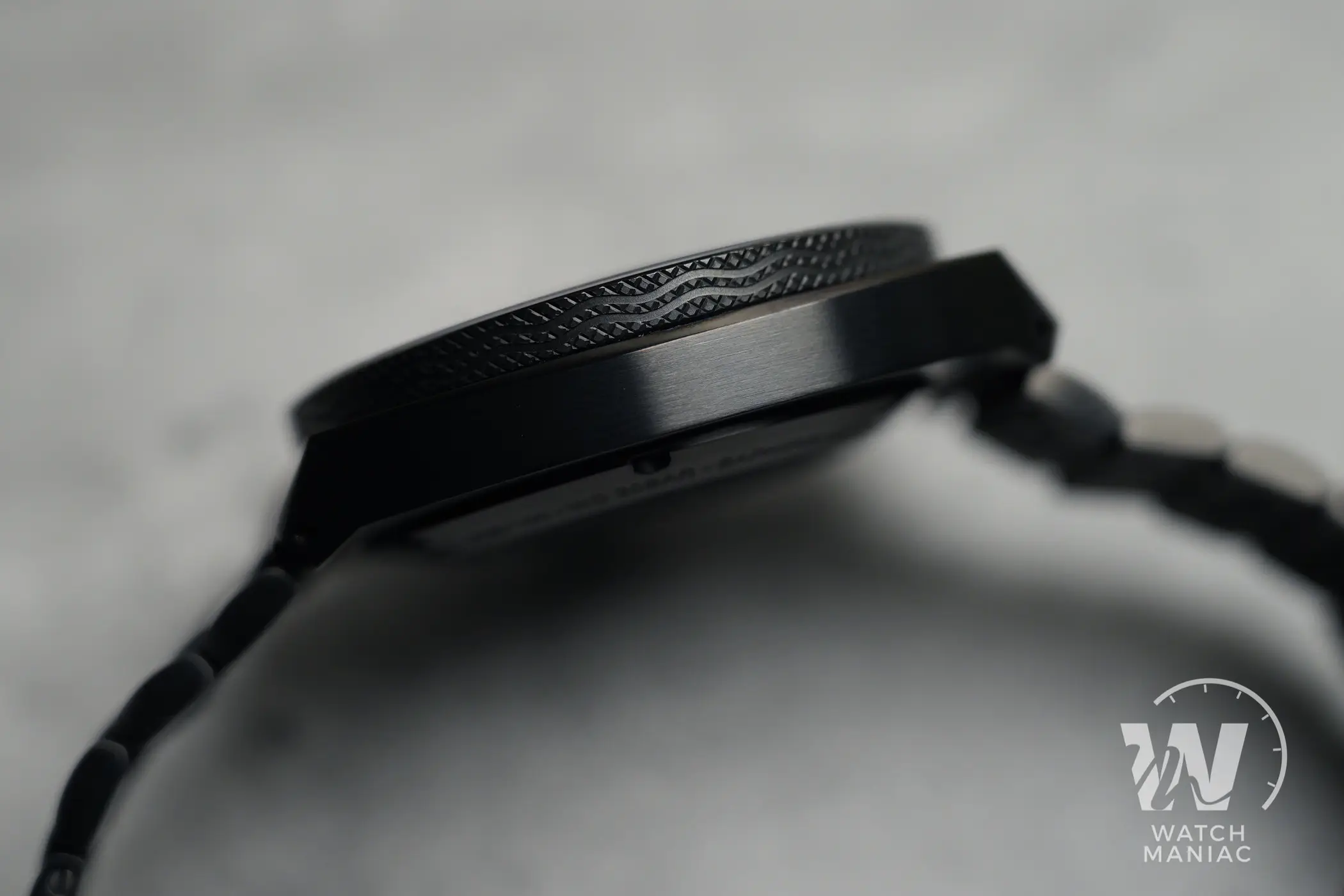 La cassa mantiene un forte legame con lo stile anni 70, ma mantiene una sua spiccata originale con forme e proporzioni decisamente azzeccate. Gli elementi stilistici più caratterizzanti sono le anse oblique sfaccettate, che sono tra l’altro molto compatte e danno un gran carattere all’orologio. La finitura è interamente satinata a parte i biselli lucidi e persino su questi prototipi, già usati per servizi fotografici, si può apprezzare la qualità di realizzazione. Non è uno dei diver più sottili presenti sul mercato, ma comunque lo spessore complessivo non è assolutamente esagerato