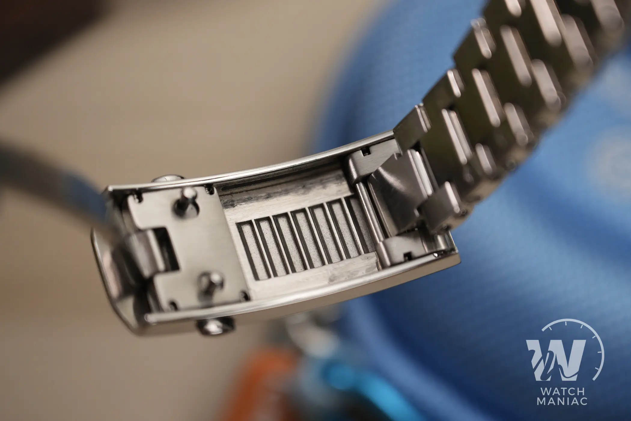 La chicca del bracciale però arriva quando ci si sofferma sulla chiusura. Questa racchiude al suo interno un sistema di microregolazione rapida con ben 7 posizioni che funziona in modo impeccabile e aumenta di parecchio la praticità di utilizzo. Per intenderci ricorda un po’ la microregolazione introdotta da Rolex sui Submariner di generazione più recente. Ovviamente, per avere un’escursione così grande, la scatoletta è un po’ più lunga di quelle che siamo abituati a vedere di solito. Nonostante questo non è assolutamente sproporzionata e in più è anche piuttosto sottile. Sempre a vantaggio della praticità di utilizzo, poi, ci sono anse a sgancio rapido per la rimozione del bracciale.
