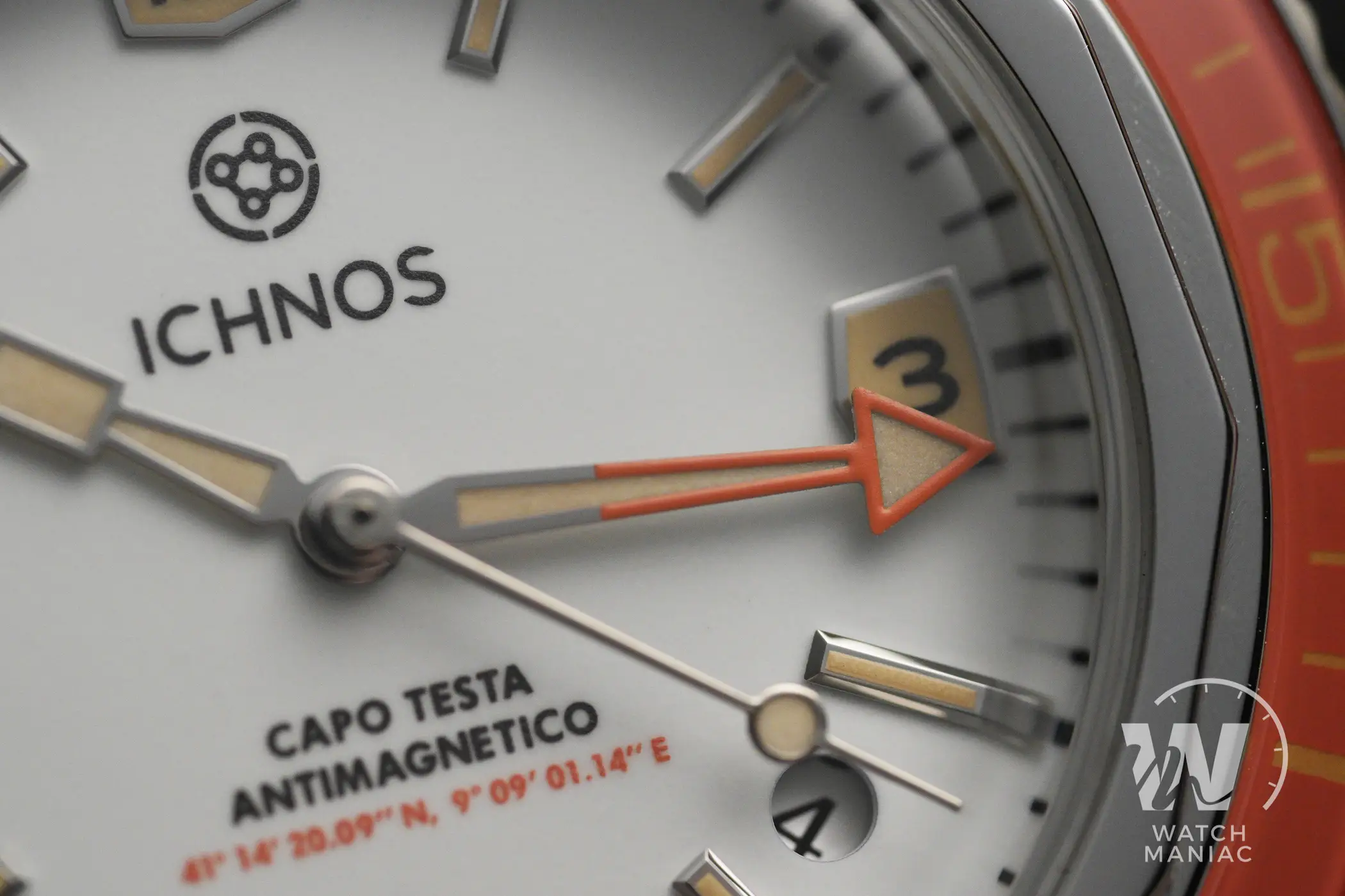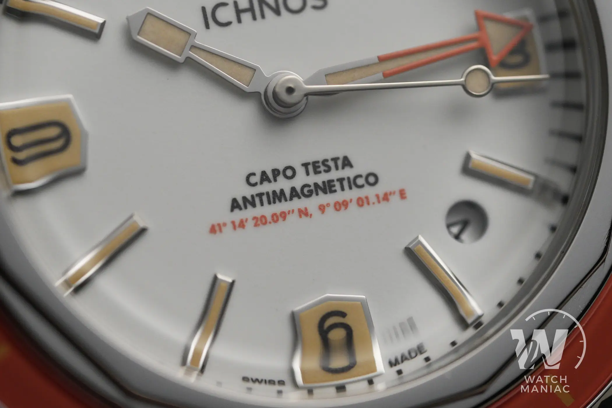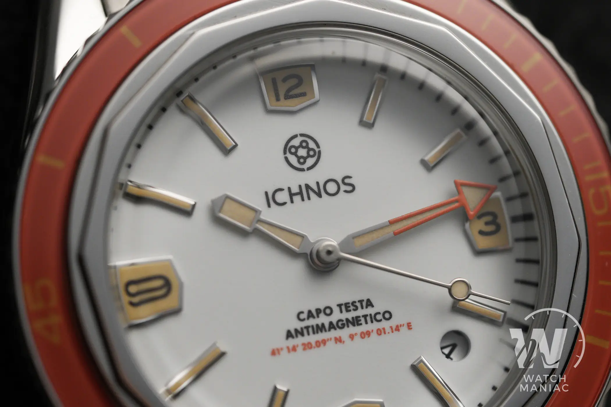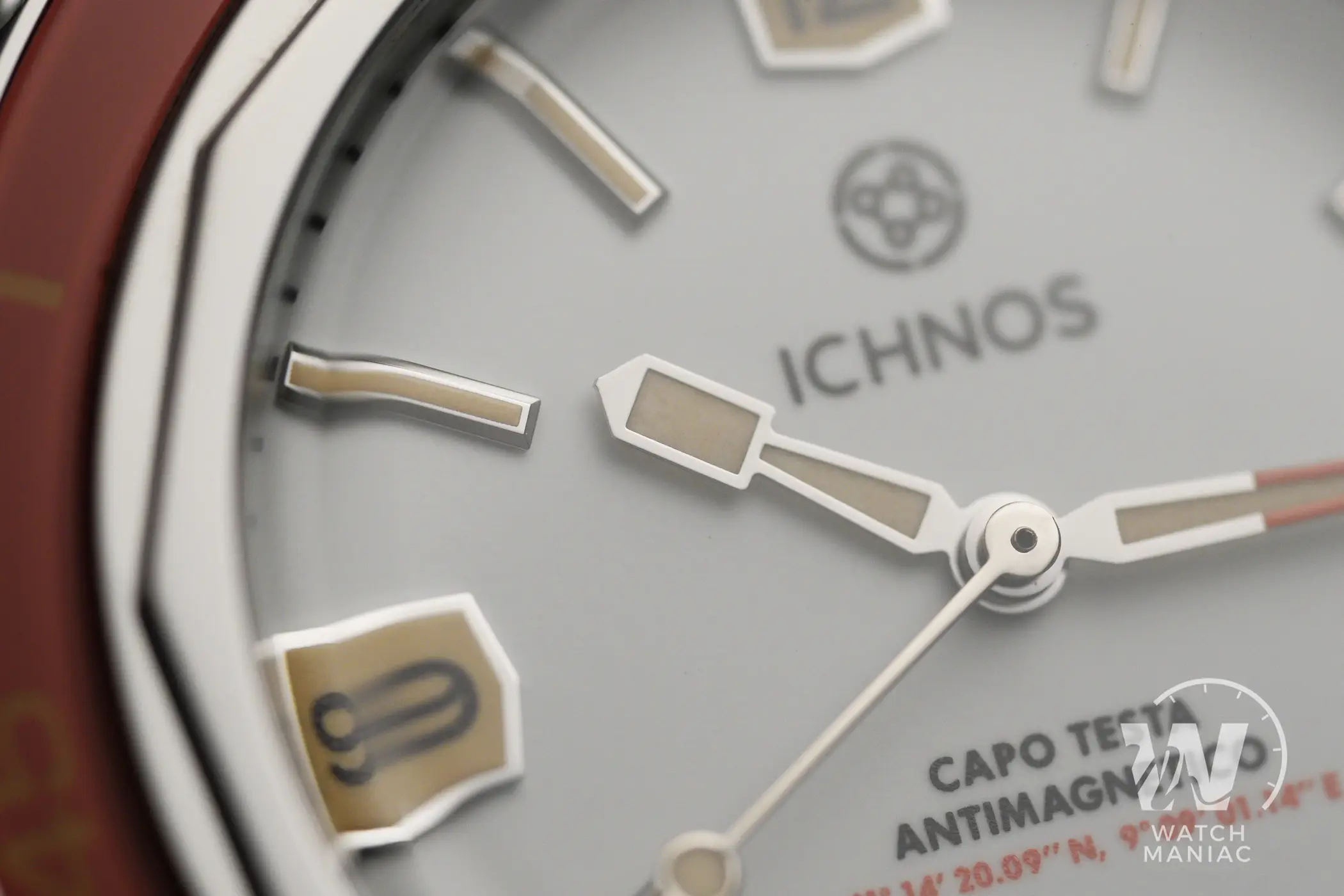 Per il meccanismo della ghiera Ichnos ha adottato un sistema di sblocco a pressione, simile a quello adottato da Squale sul 2002 o da Zodiac sul Super Sea Wolf 68. Premendo la ghiera contro la cassa è possibile ruotarla in entrambe le direzioni, ma smettendo di esercitare pressione si blocca. Su alcuni dei prototipi (incluso questo Corrallaro) la pressione necessaria per la rotazione è davvero minima, ma per la produzione in serie questo particolare verrà sistemato. Una ghiera di questo genere ha bisogno di essere serrata con un dado. Ecco quindi che su questo orologio, a differenza di ciò che accade su altri modelli dove ha solo una funzione estetica, il dodecagono ha una sua ragione d’essere. Trattandosi di un vero anello avvitato, non è possibile garantire il perfetto allineamento dei vertici con il quadrante, cosa che peraltro vale anche per gli Zodiac e gli Squale che ho citato.