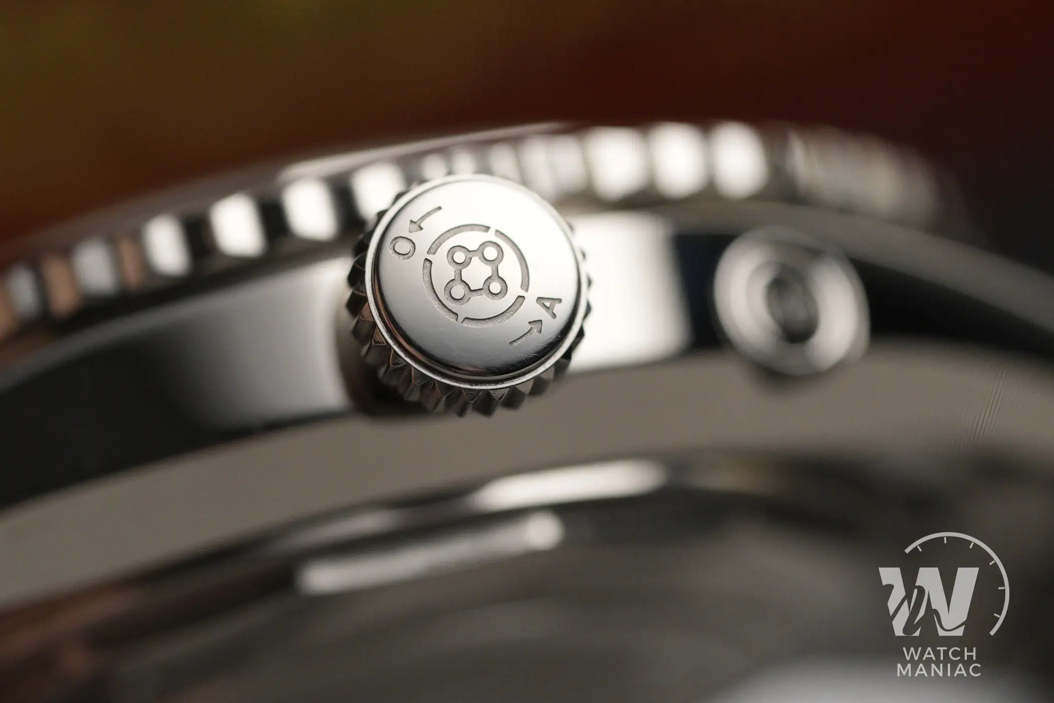 La corona, dal diametro generoso ma non eccessivamente sporgente dalla carrure, la il logo del marchio inciso al centro e le indicazioni in italiano e inglese del senso di rotazione per l’apertura. Naturalmente è a vite e la filettatura è già molto precisa anche su questo prototipo.