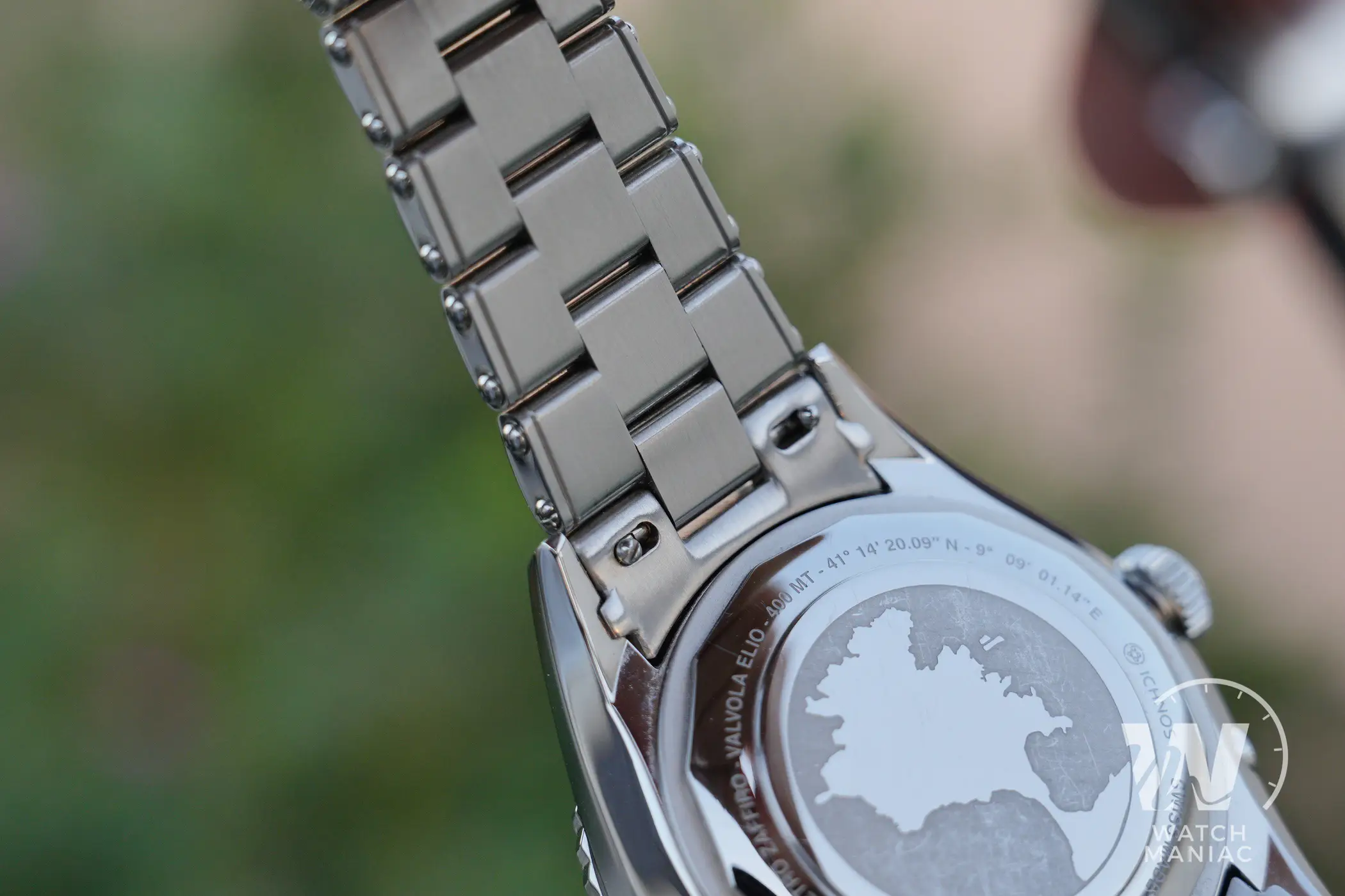 Il fondello è interamente in acciaio e riporta al centro la raffigurazione della penisola di Capo Testa. Tutto intorno sono incise varie informazioni, tra cui spiccano l’orgogliosa dicitura “Progettato in Sardegna”, il dato sull’impermeabilità fino a 400m e persino un piccolo pittogramma che ricorda la riserva di carica maggiorata della meccanica all’interno.