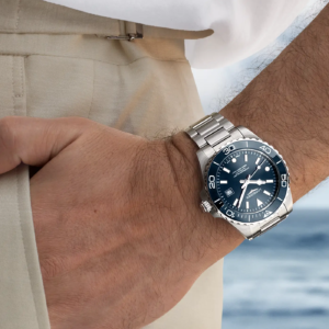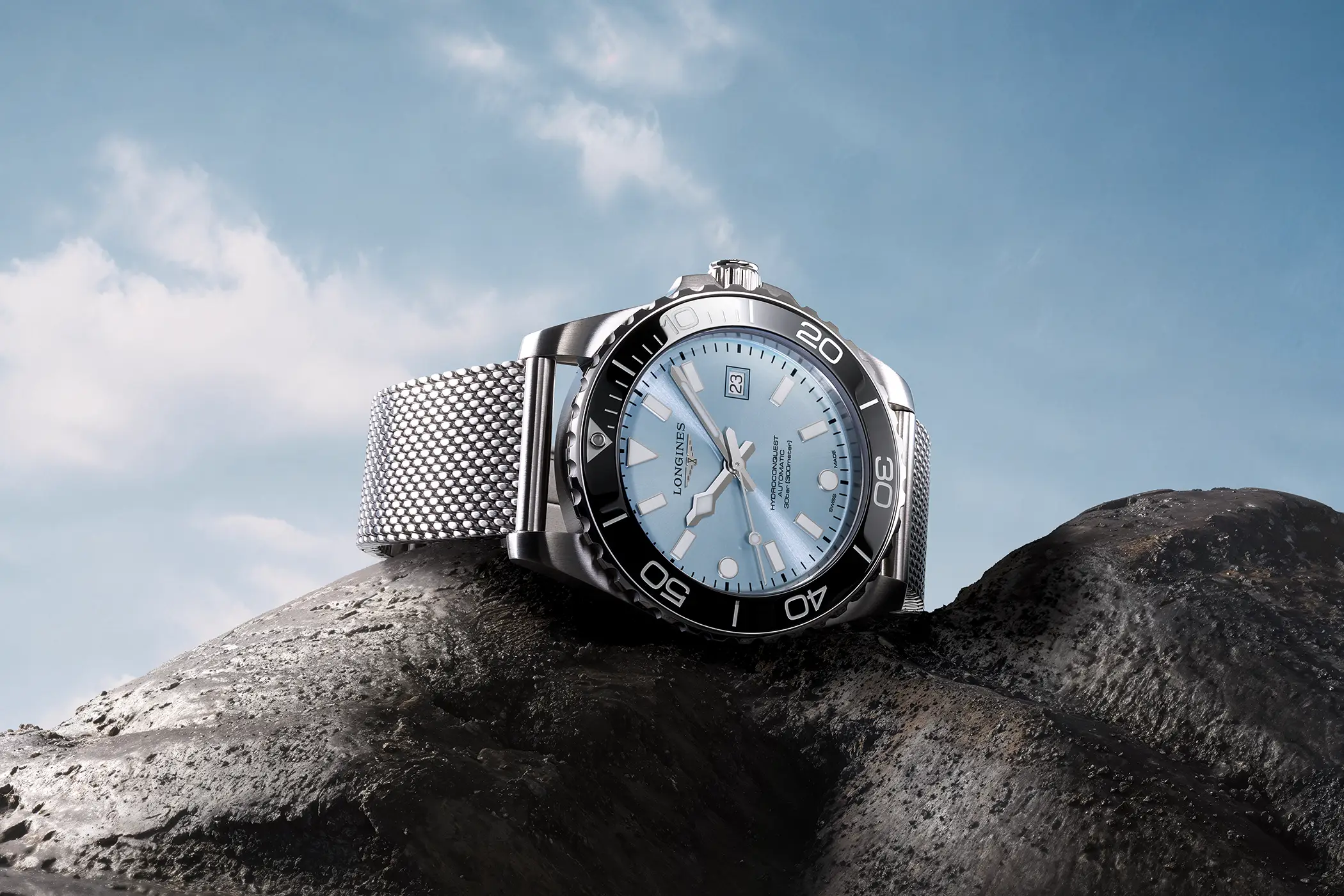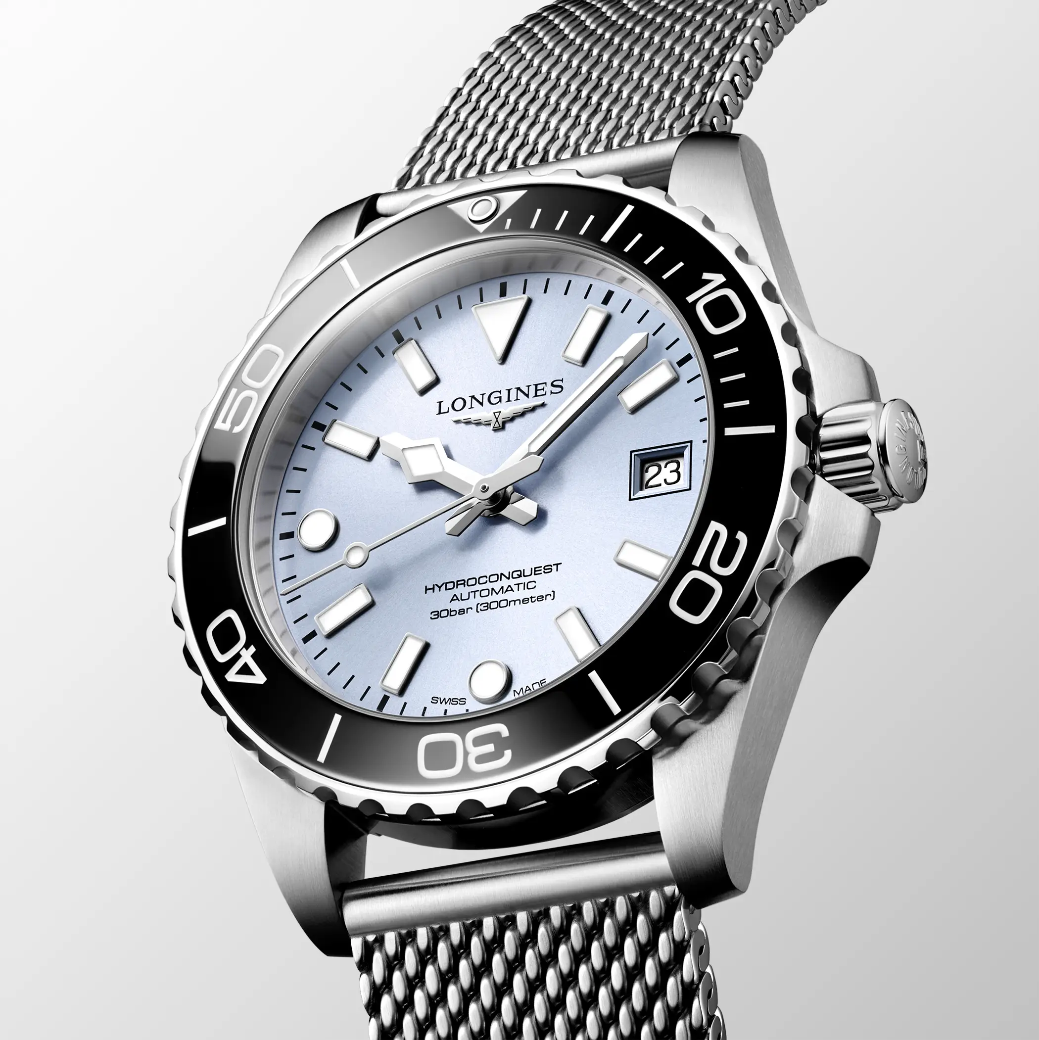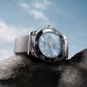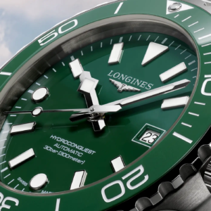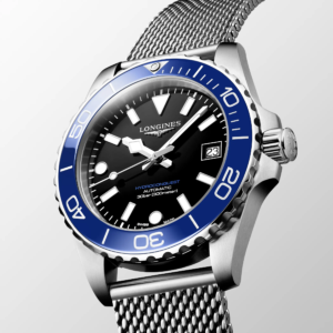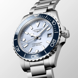 Longines ha giocato con i colori proponendo abbinamenti di quadrante e ghiera inediti per la famiglia Hydroconquest. È possibile scegliere tra diverse combinazioni: quadrante nero con ghiera blu o grigia, o azzurro ghiaccio con ghiera nera, tutti previsti con bracciale mesh, oppure la versione con il bracciale in acciaio a tre elementi con quadrante nero, blu o verde e ghiera della stessa tonalità del quadrante. Il più distintivo è di certo la Boutique Edition (acquistabile solo nelle boutique monomarca o online sul sito ufficiale di Longines), con quadrante soleil color azzurro ghiaccio e ghiera in tonalità blu, proposta con il bracciale classico a tre elementi in acciaio. Degna di nota la nuova chiusura dotata di microregolazione rapida integrata nella scatoletta, un dettaglio significativo per migliorare la qualità percepita e la praticità di utilizzo.