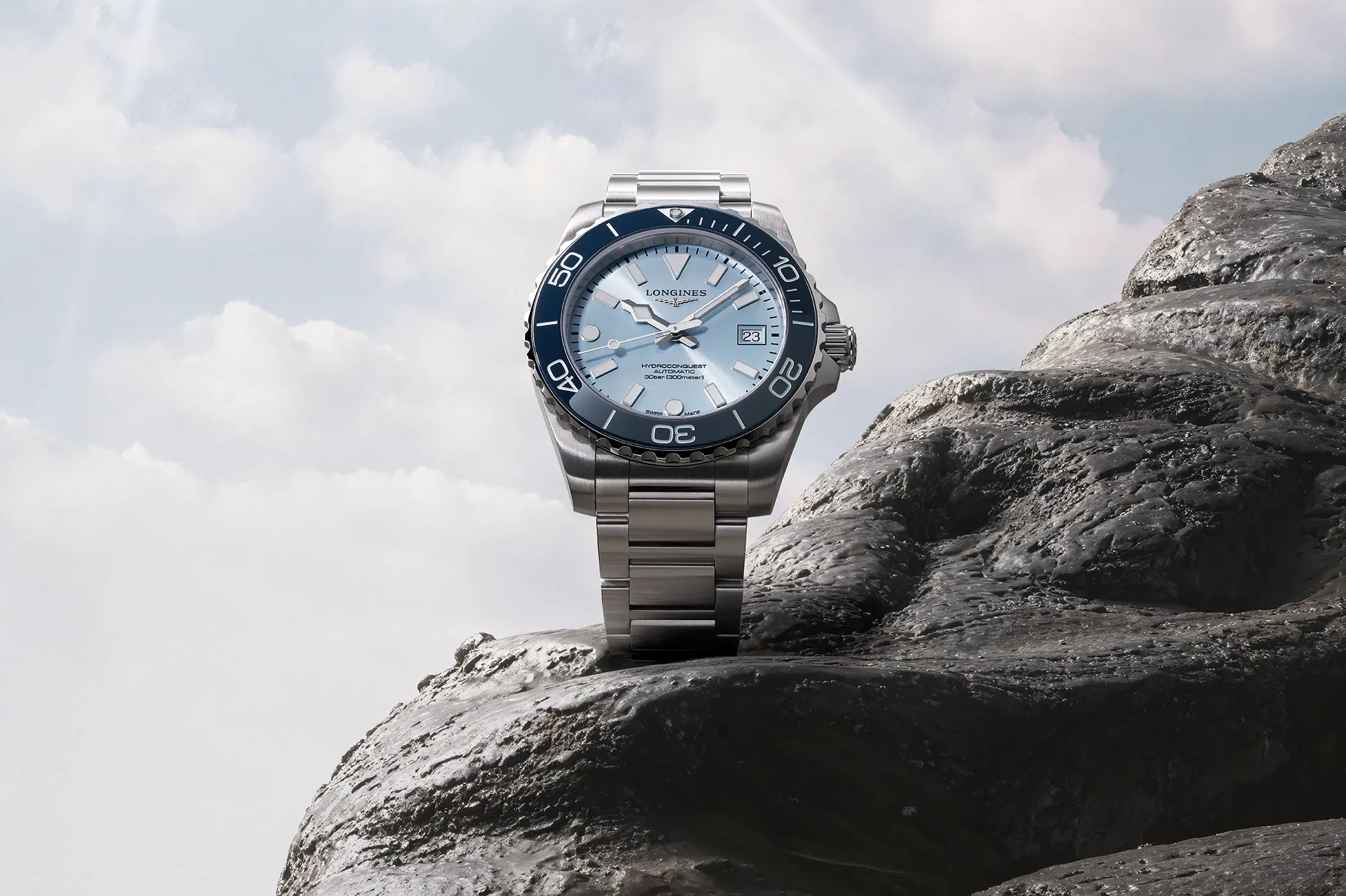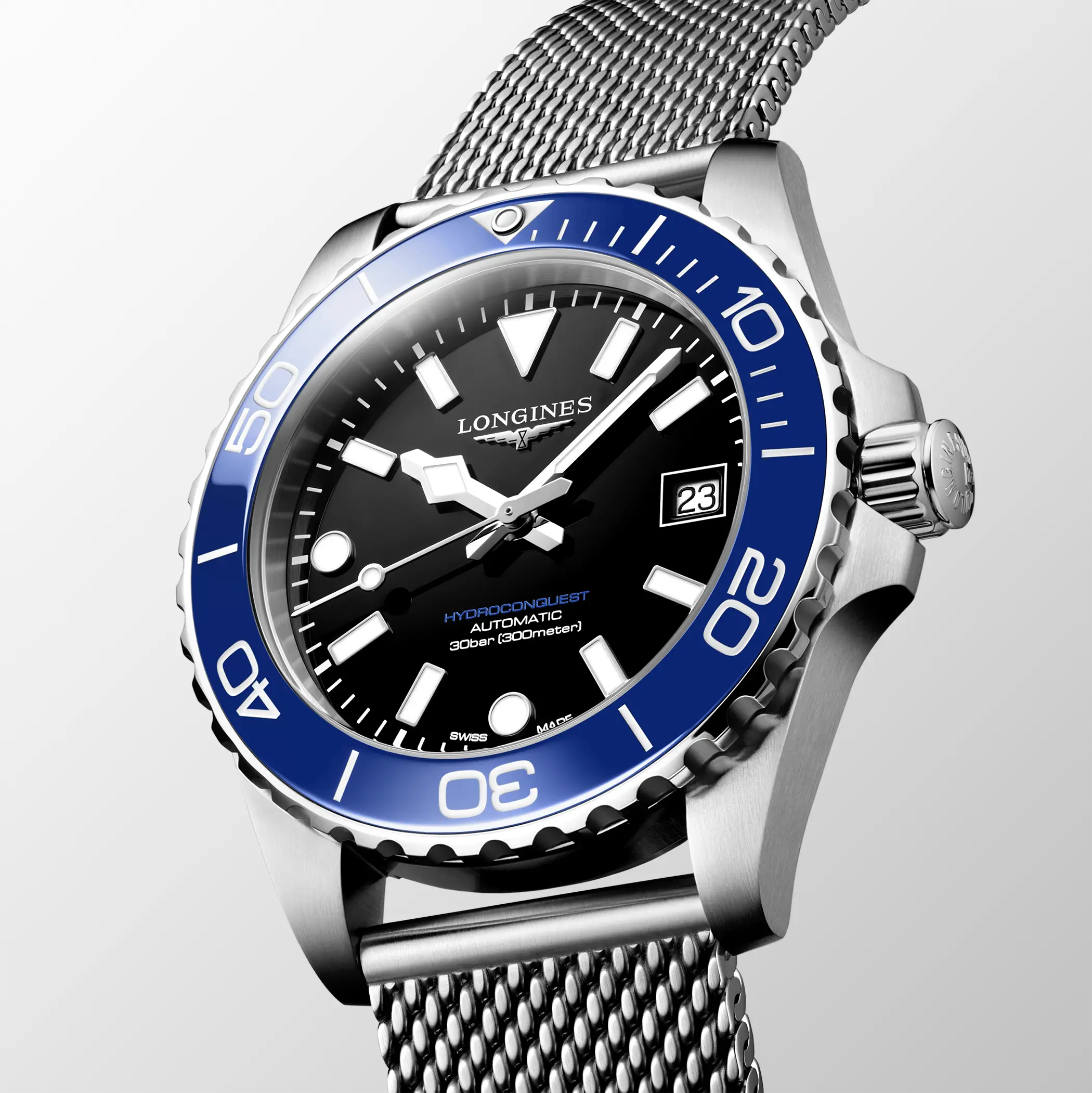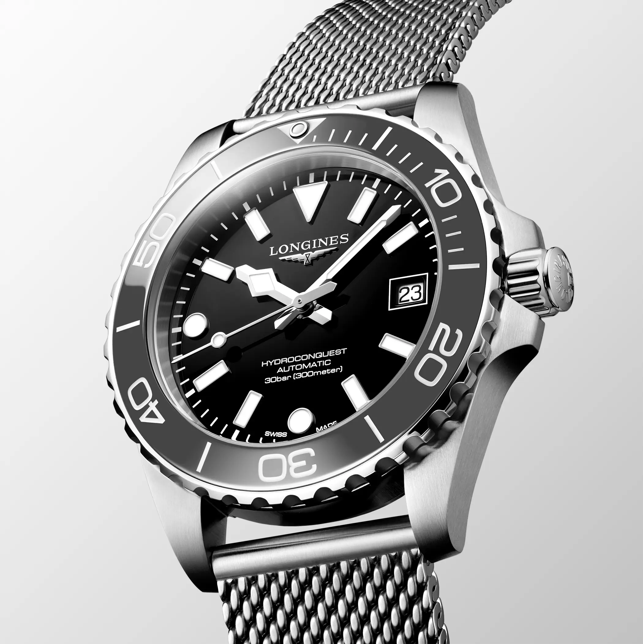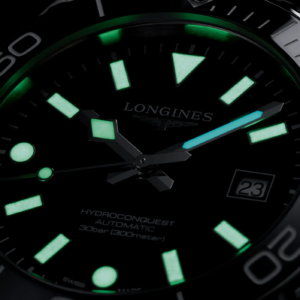 L’Hydroconquest affonda le sue radici nella famiglia Conquest, la prima linea di Longines a ottenere la protezione del marchio in Svizzera nel 1954. Nato come “l’orologio di tutti i giorni”, Conquest divenne ben presto uno standard di riferimento, un segnatempo versatile e affidabile. Nel 2007 debutta Hydroconquest: la volontà di Longines fu quella di proporre una linea sportiva, con un’impermeabilità fino a 300 metri, che ha nell’acqua il suo ambiente naturale, ma che non rinuncia a raffinatezza e sobrietà tipiche della casa svizzera.