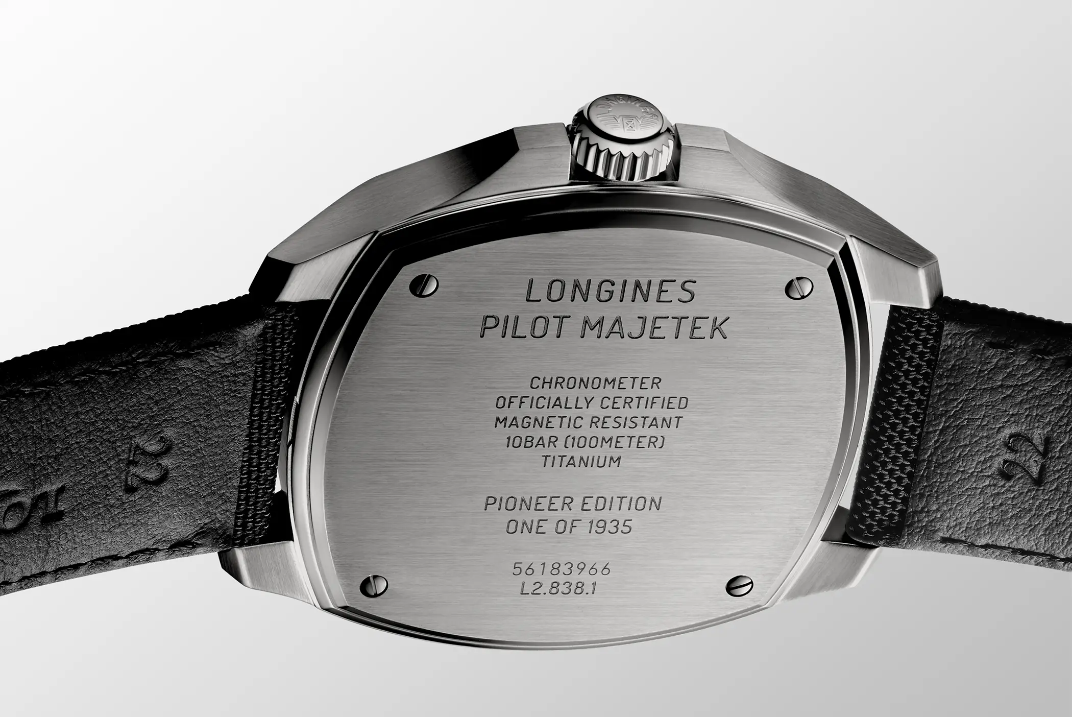 Sulla scia della prima riedizione, è ora la volta di un nuovo modello in titanio di grado 5, una lega più leggera e resistente dell’acciaio: il Longines Pilot Majetek Pioneer Edition. Questa referenza è un’edizione limitata a a 1935 esemplari, un numero che rende omaggio proprio all‘anno in cui il modello fu ufficialmente registrato.