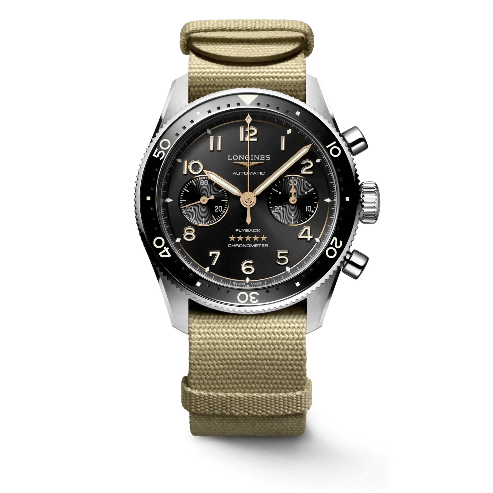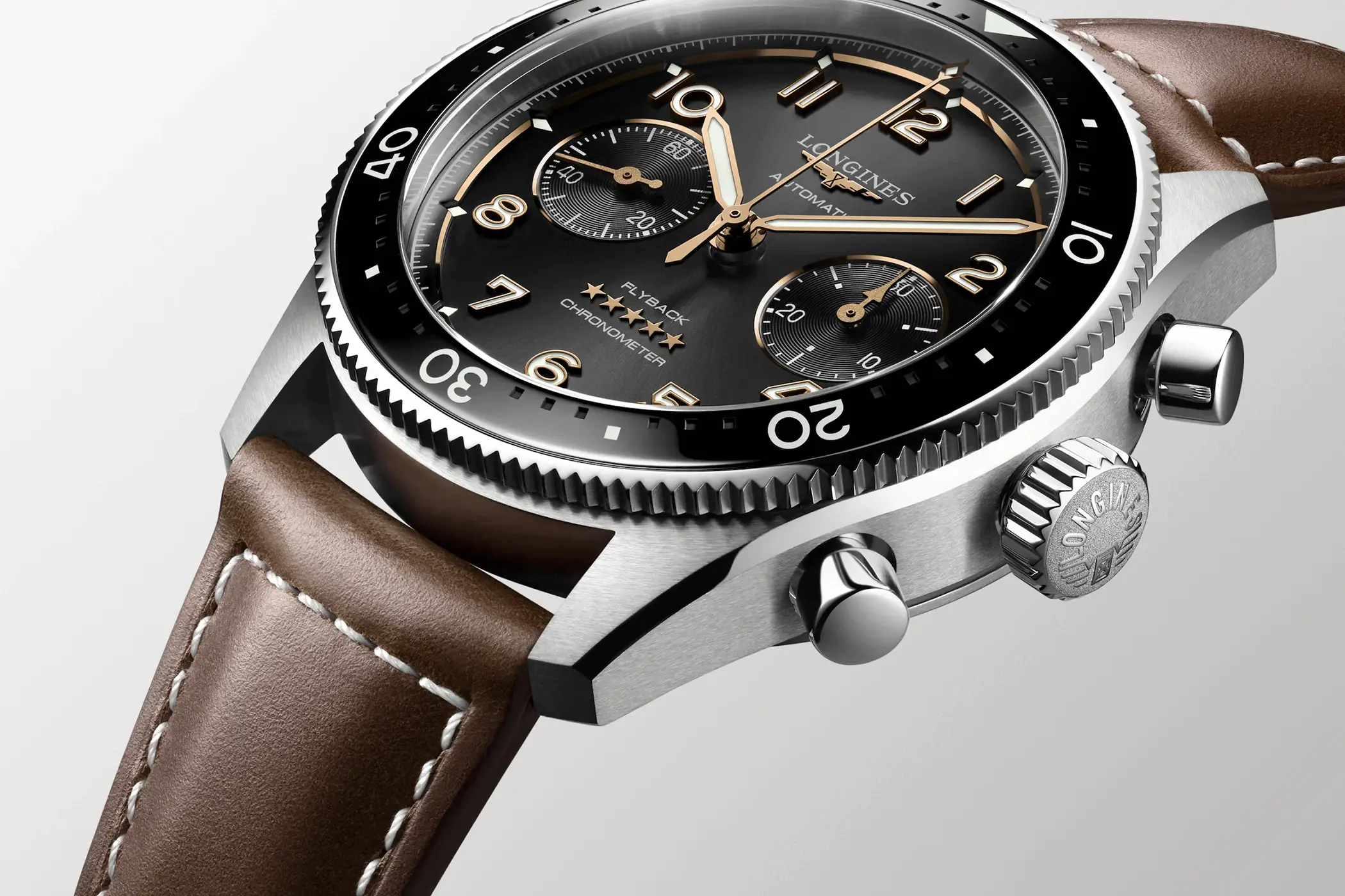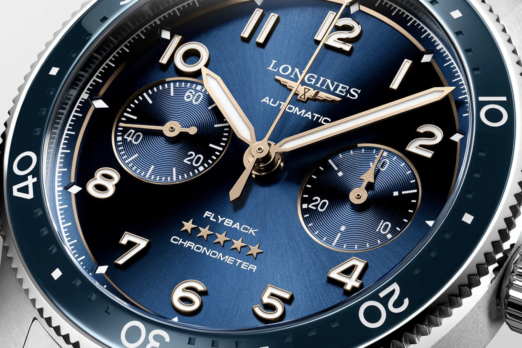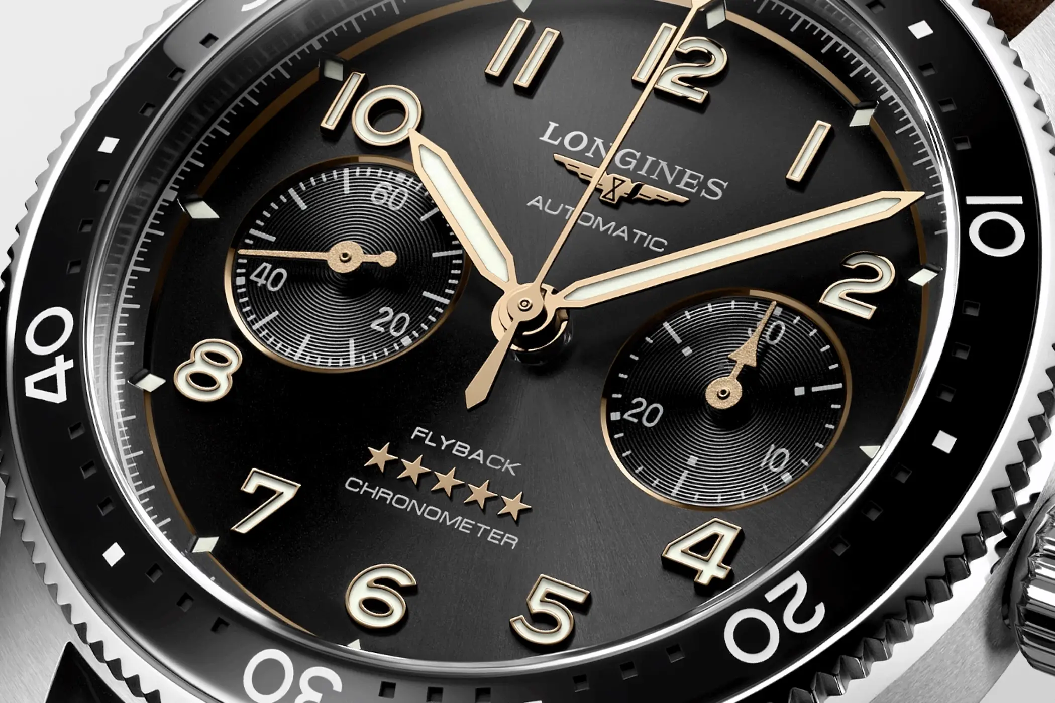 Ma torniamo ai giorni nostri. Il nuovissimo Longines Spirit Flyback è un segnatempo di carattere: presenta una muscolosa cassa da 42mm di diametro per 17mm di spessore e 49,5mm di distanza fra le anse, impermeabilità fino a 10 bar e vetro zaffiro con trattamento antiriflesso su entrambi i lati. Paragonandolo all’altro cronografo della linea Spirit presenta delle differenze principali: una lunetta con inserto ceramico graduata fino a 60 minuti oltre all’assenza di terzo contatore cronografico e datario, il che fa risultare il quadrante più simmetrico e meno affollato.