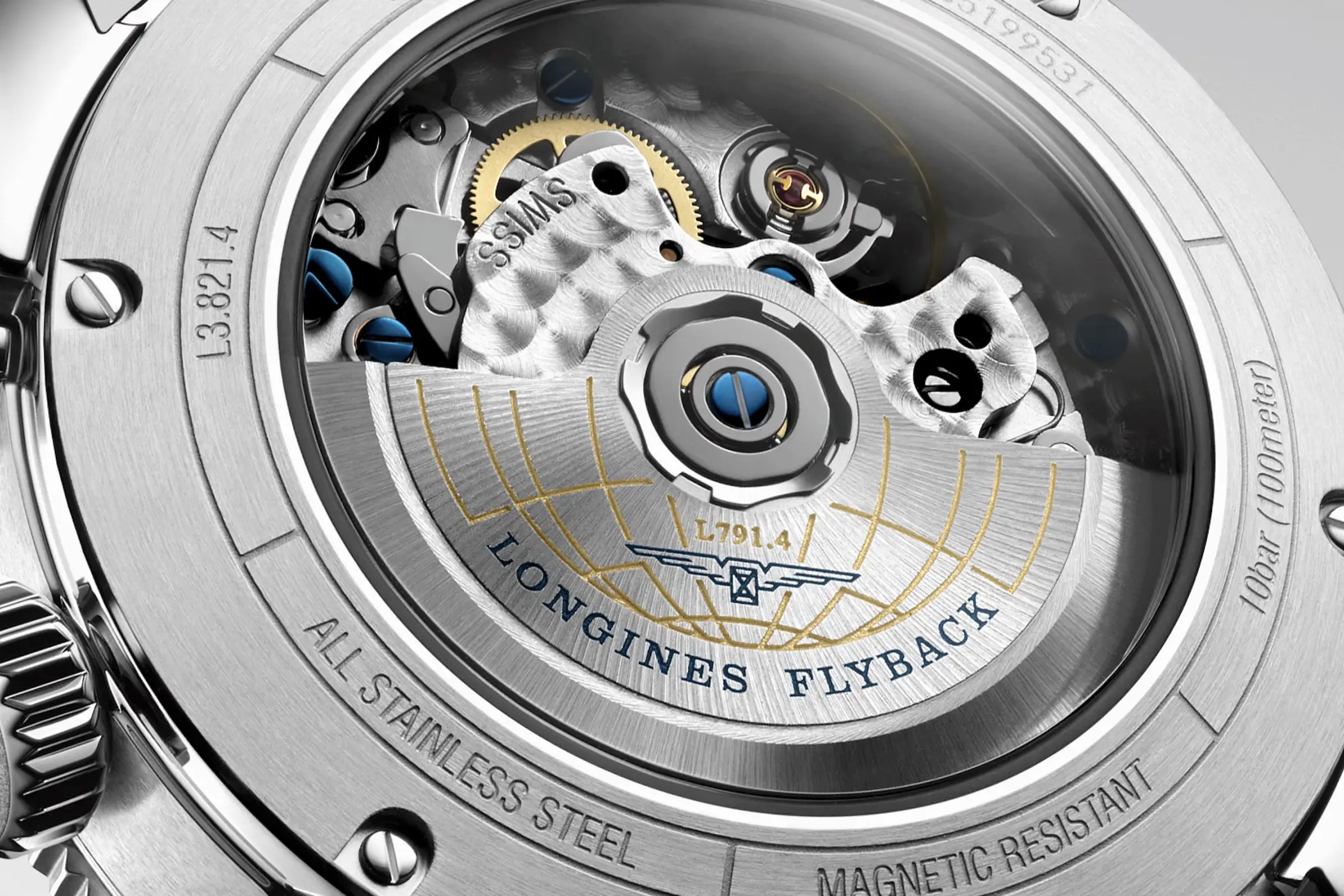 Ma la vera novità si trova dietro il fondello: il segnatempo monta il calibro L791.4, esclusivo per questo modello, basato sul Valjoux 7753 ma con modifiche specifiche richieste da Longines: ruota a colonne per lo smistamento delle funzioni cronografiche, spirale del bilanciere in silicio, riserva di carica di 68 ore, certificazione COSC e, ovviamente, funzione Flyback. Il movimento è stato decorato con viti e ruota a colonne blu, perlage sui ponti e rotore di carica personalizzato, il tutto può essere ammirato dal vetro zaffiro del fondello serrato da 6 viti.