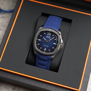 Il corredo è piuttosto standard: la scatola è quella classica per Mido, con dettagli arancioni e rivestimento in similpelle nera all’interno. Nel vano inferiore ci sono il manuale di istruzioni e la card della garanzia. Il Multifort TV Big Date può essere scelto in 5 diverse configurazioni e in 3 differenti colorazioni di quadrante. Rifacendosi allo stile anni ’70, questo nuovo Mido ha certamente alcuni punti in comune con alcuni mostri sacri dell’epoca e la forma quadrata con angoli arrotondati unita al cinturino di gomma possono far pensare al Patek Aquanaut (peraltro nato parecchio più tardi, nel 1997). Del resto nella storia dell’orologeria ci sono un sacco di esempi di orologi che, seguendo un determinato filone stilistico, finiscono per avere tra loro delle somiglianze più o meno marcate. Il cosiddetto design TV era molto diffuso negli anni ’70 e praticamente ogni marchio all’epoca si cimentava nella rielaborazione di questo stile. Il primo modello di Mido di quel genere risale infatti al 1973 ed è l’antenato di questo nuovo Multifort.