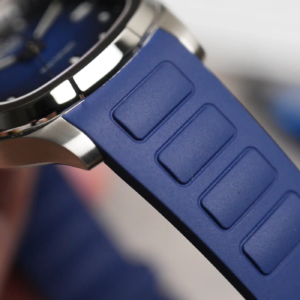 Il Multifort TV Big Date può essere scelto con bracciale in acciaio o con cinturino in gomma. Nonostante il primo sia ben fatto e stilisticamente adatto al design della cassa, questo orologio si esprime probabilmente al suo meglio con il cinturino in gomma. Esteticamente è davvero gradevole perché ha dei tasselli sporgenti che riprendono un po’ il disegno delle maglie centrali del bracciale. Il materiale è davvero piacevole, è morbido e non attira pelucchi e il colore nella versione blu fa risaltare ancora di più la tonalità del quadrante. È un vero peccato che, almeno per ora, gli amanti della variante verde non possano scegliere un cinturino in gomma in tinta. La fibbia è ad ardiglione, con marchio inciso e una bella finitura mista lucida e satinata e segnalo che su bracciale e cinturino sono installate anse a sgancio rapido.