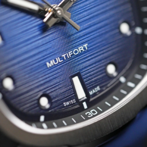 Sulla superficie del quadrante ci sono dei piccoli solchi orizzontali che, insieme alla colorazione sfumata, creano un effetto cangiante davvero interessante a seconda dell’angolazione e dell’intensità della luce. Le scritte sono ridotte al minimo, con logo e indicazione sul tipo di movimento in alto e famiglia di appartenenza in basso. A ore 12 c’è la gran data che dà una marcia in più al Multifort TV. È una complicazione non così frequente in questa fascia di prezzo, in grado di garantire una leggibilità ottimale proprio grazie alle dimensioni maggiori rispetto ai consueti dischi singoli. Qui infatti le due cifre sono ciascuna su un disco separato ed ha sempre un certo fascino osservare il momento dello scatto.