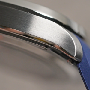 La cassa ha anse piuttosto corte e curvate verso il basso ed è interamente satinata a parte il bisello lucido inferiore. Sul fianco destro ci sono due spallette molto ben integrate alla carrure che proteggono interamente la corona. Questa è lucida con logo in rilievo, è a vite e la filettatura è precisissima sia in apertura che in serraggio.